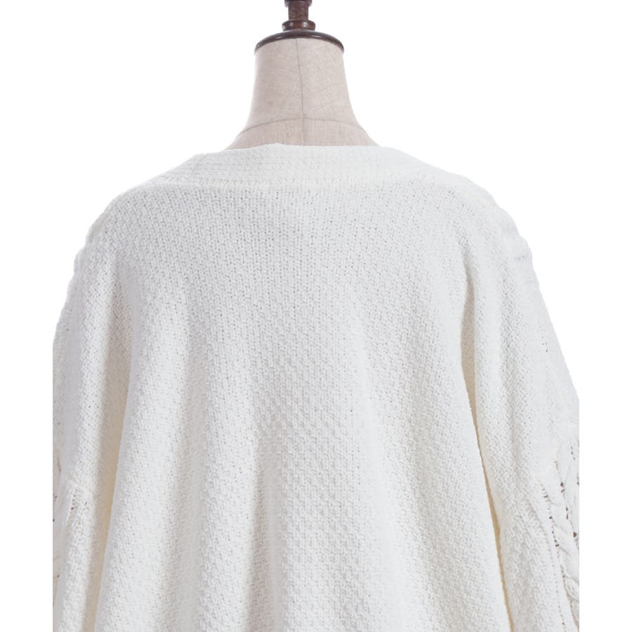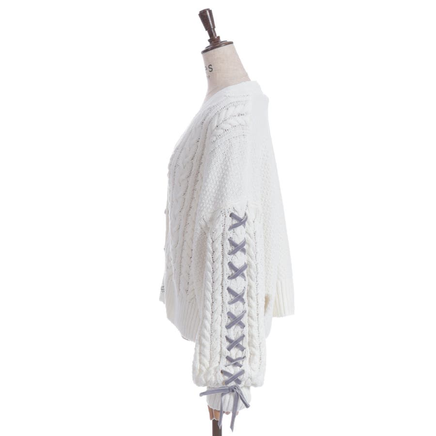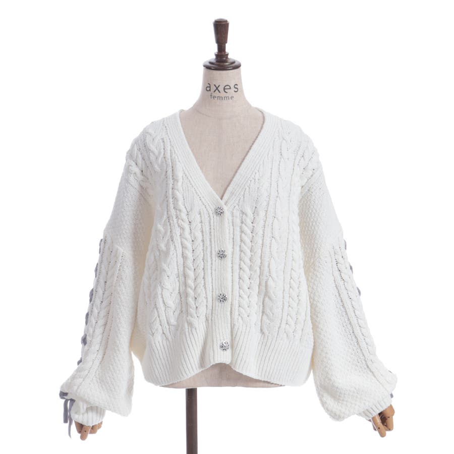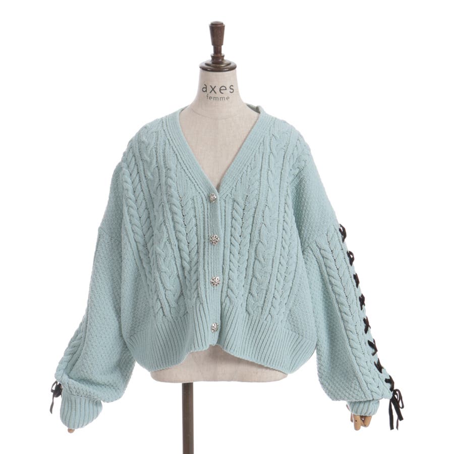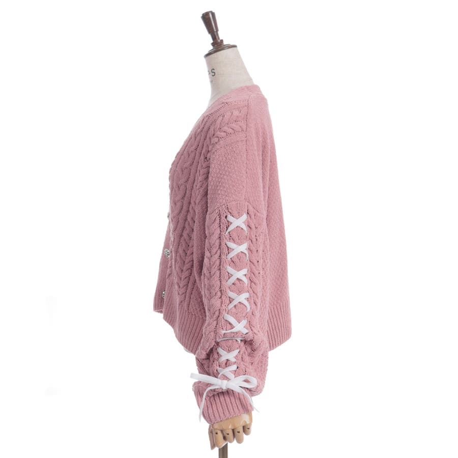 レースアップの袖デザインがポイントのニットカーディガンです。
