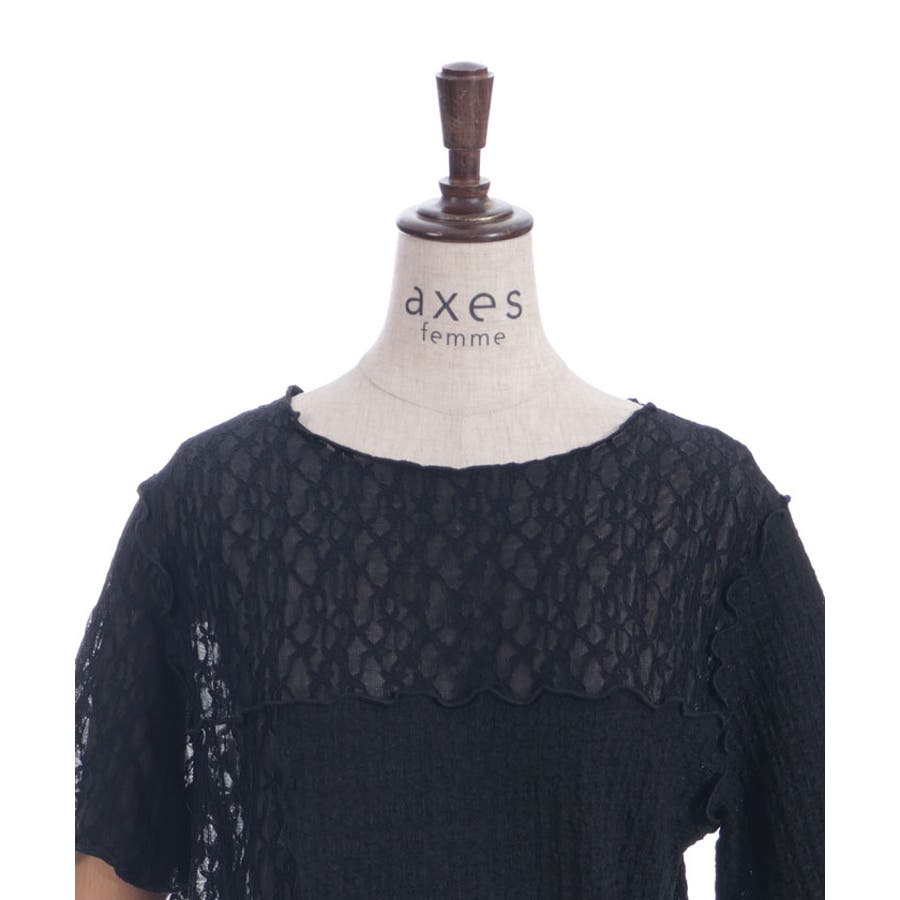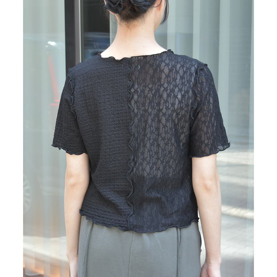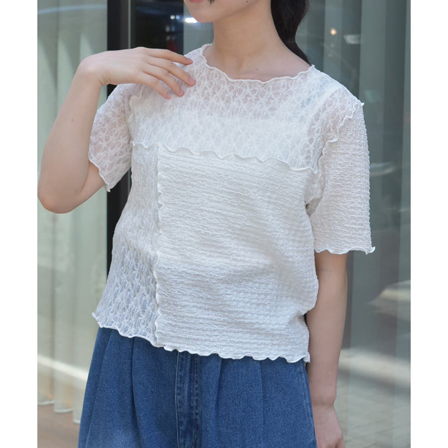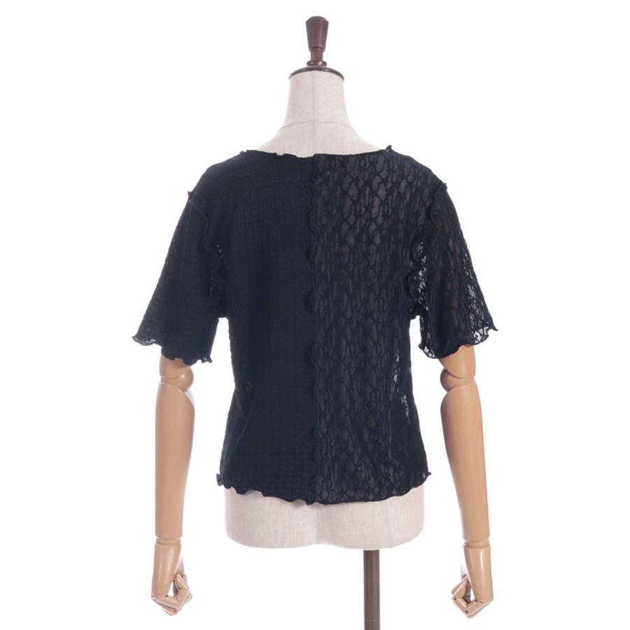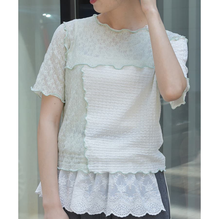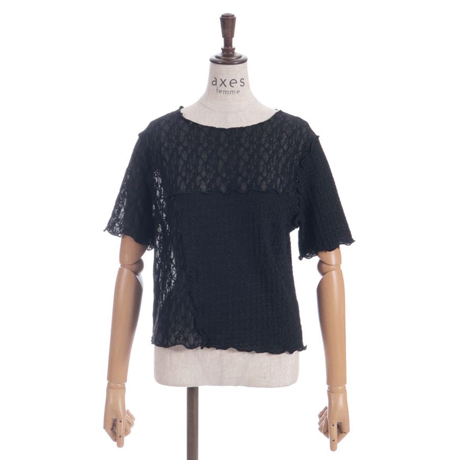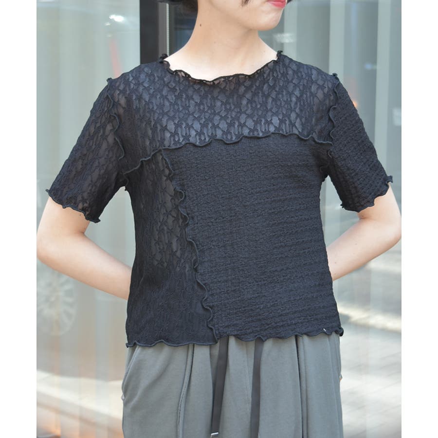ストレッチの効いたレースとふっくらとしたジャカードカットソー生地を組み合わせたパッチワークデザインが特徴で、メロー始末がまるでフリルのように見えるアクセントになった、繊細さと存在感を兼ね備えたトップスです。