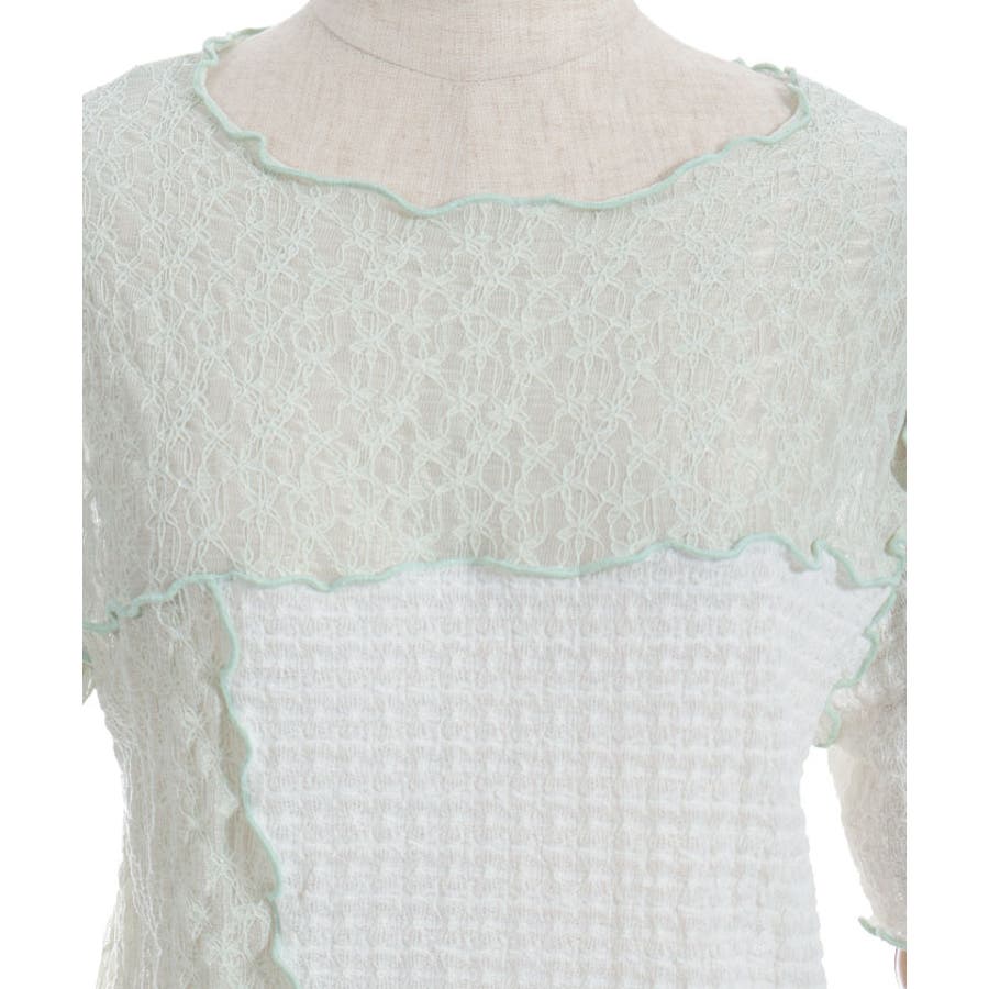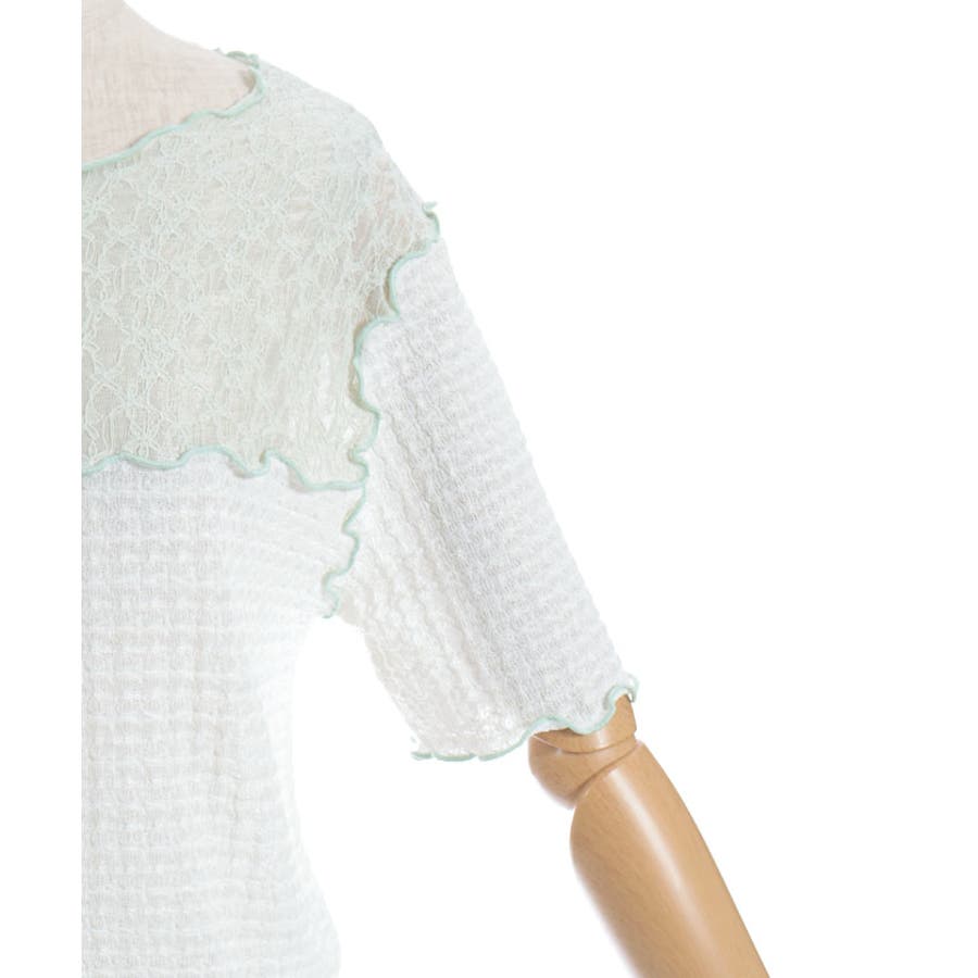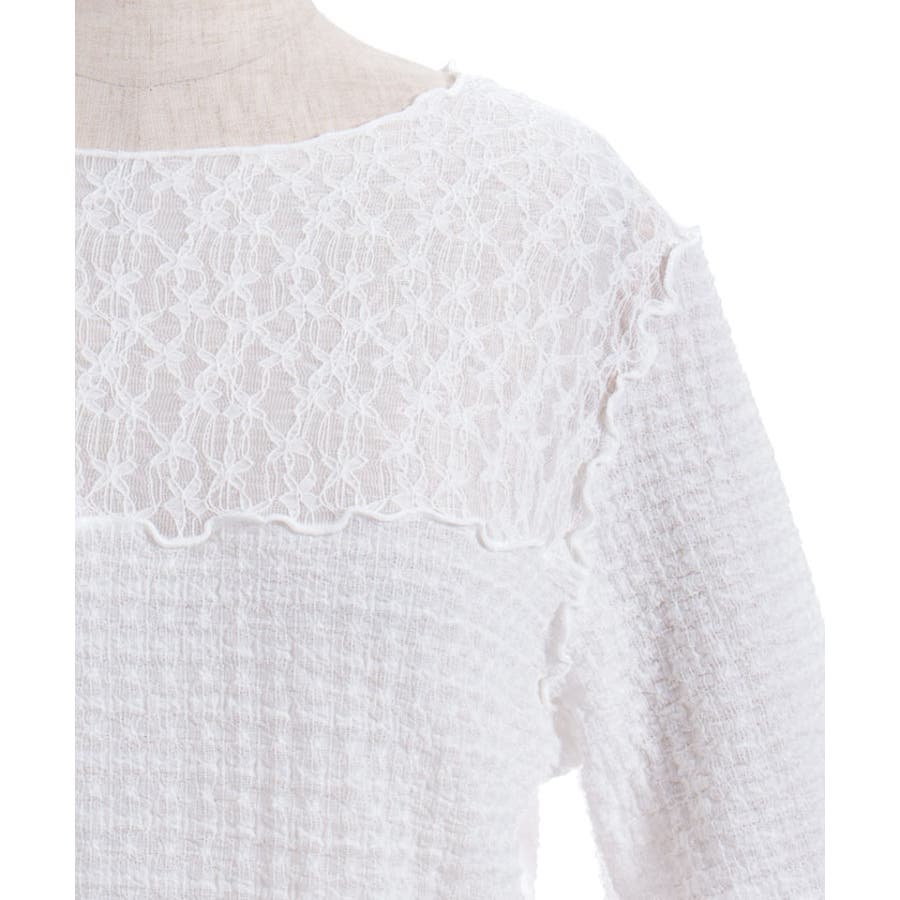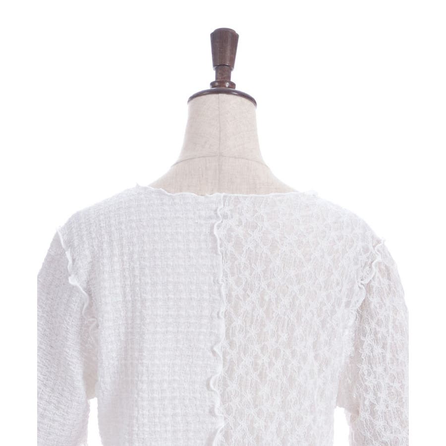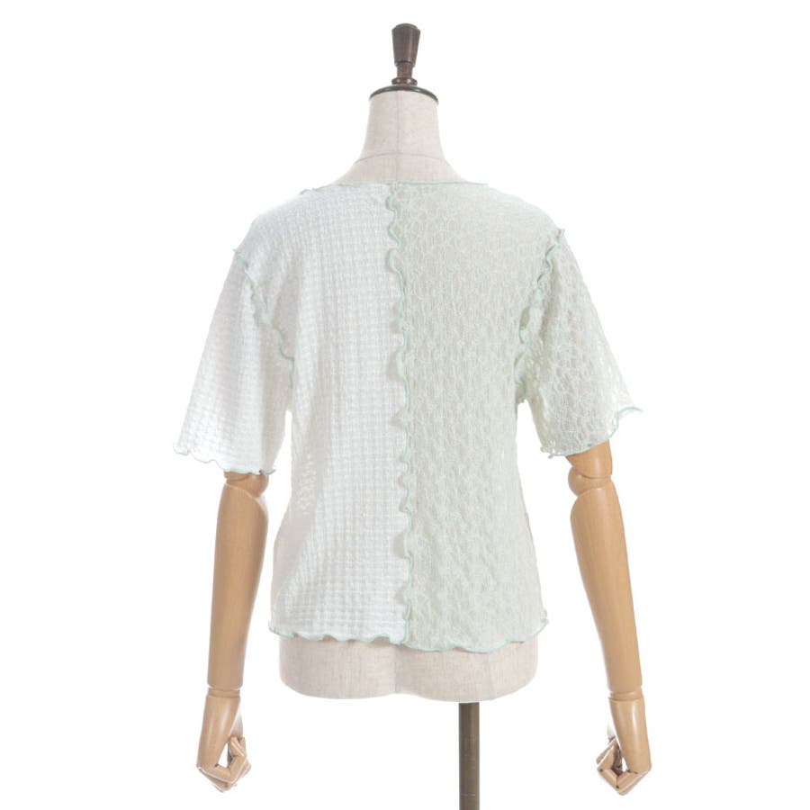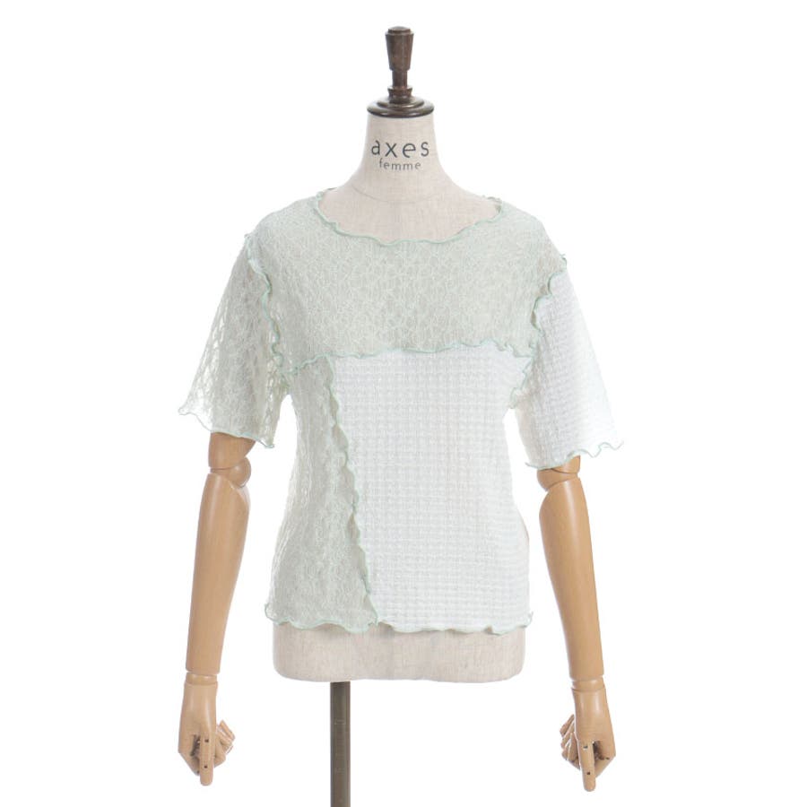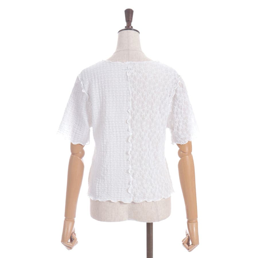 ストレッチの効いたレースとふっくらとしたジャカードカットソー生地を組み合わせたパッチワークデザインが特徴で、メロー始末がまるでフリルのように見えるアクセントになった、繊細さと存在感を兼ね備えたトップスです。