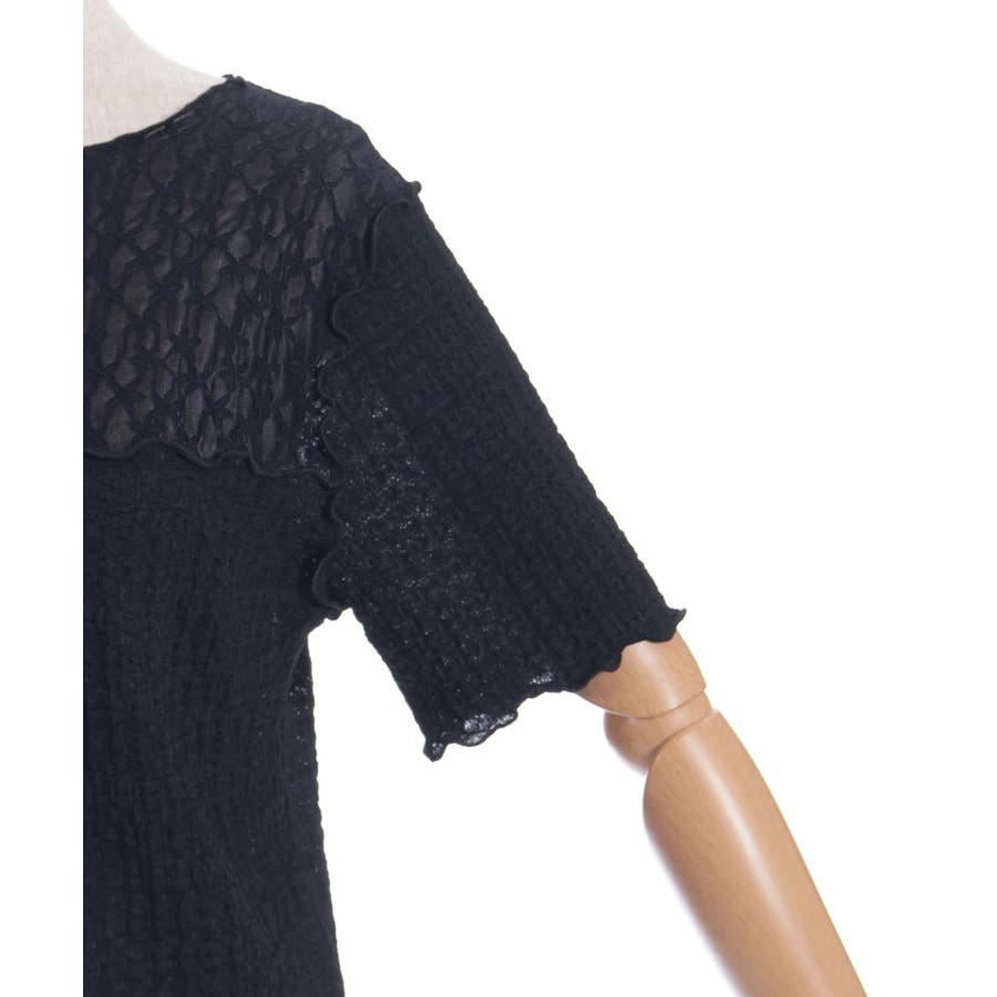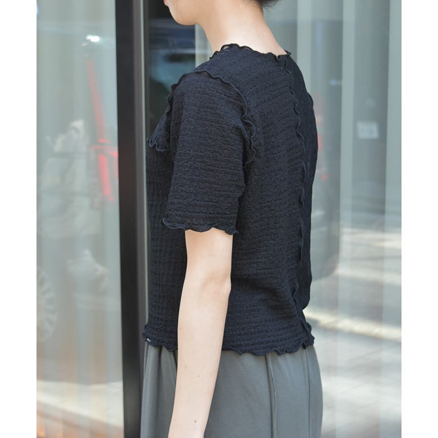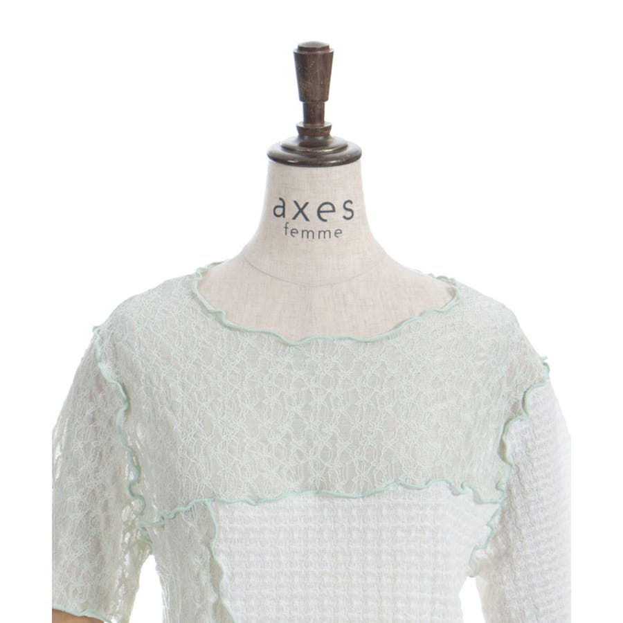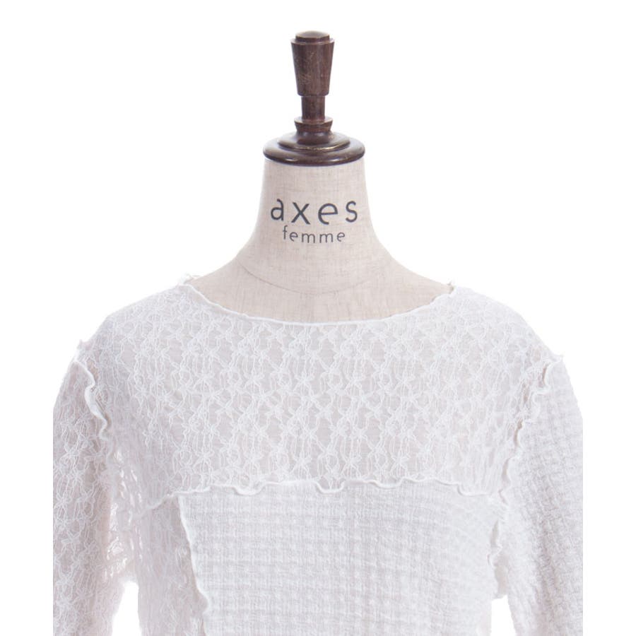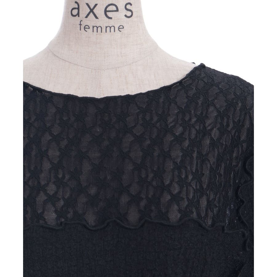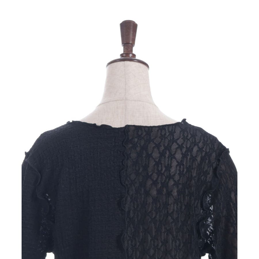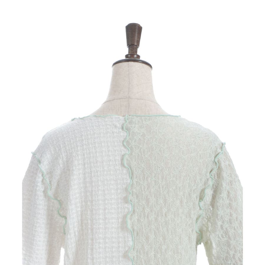 ストレッチの効いたレースとふっくらとしたジャカードカットソー生地を組み合わせたパッチワークデザインが特徴で、メロー始末がまるでフリルのように見えるアクセントになった、繊細さと存在感を兼ね備えたトップスです。