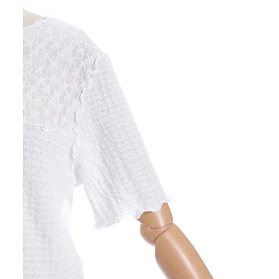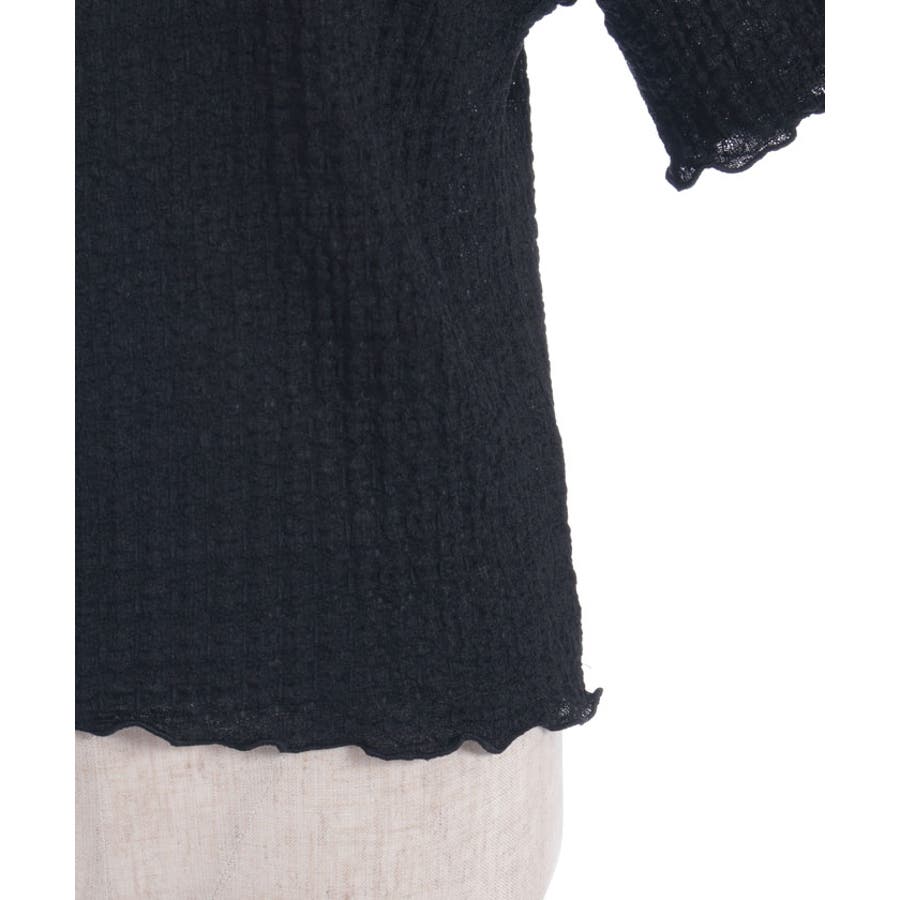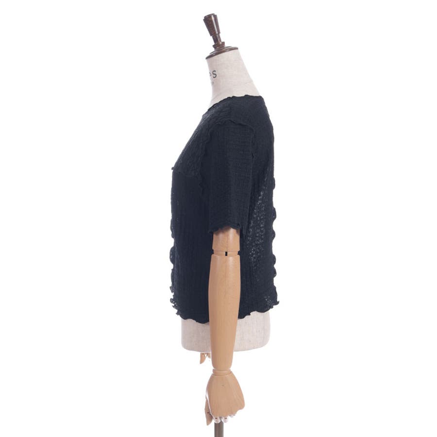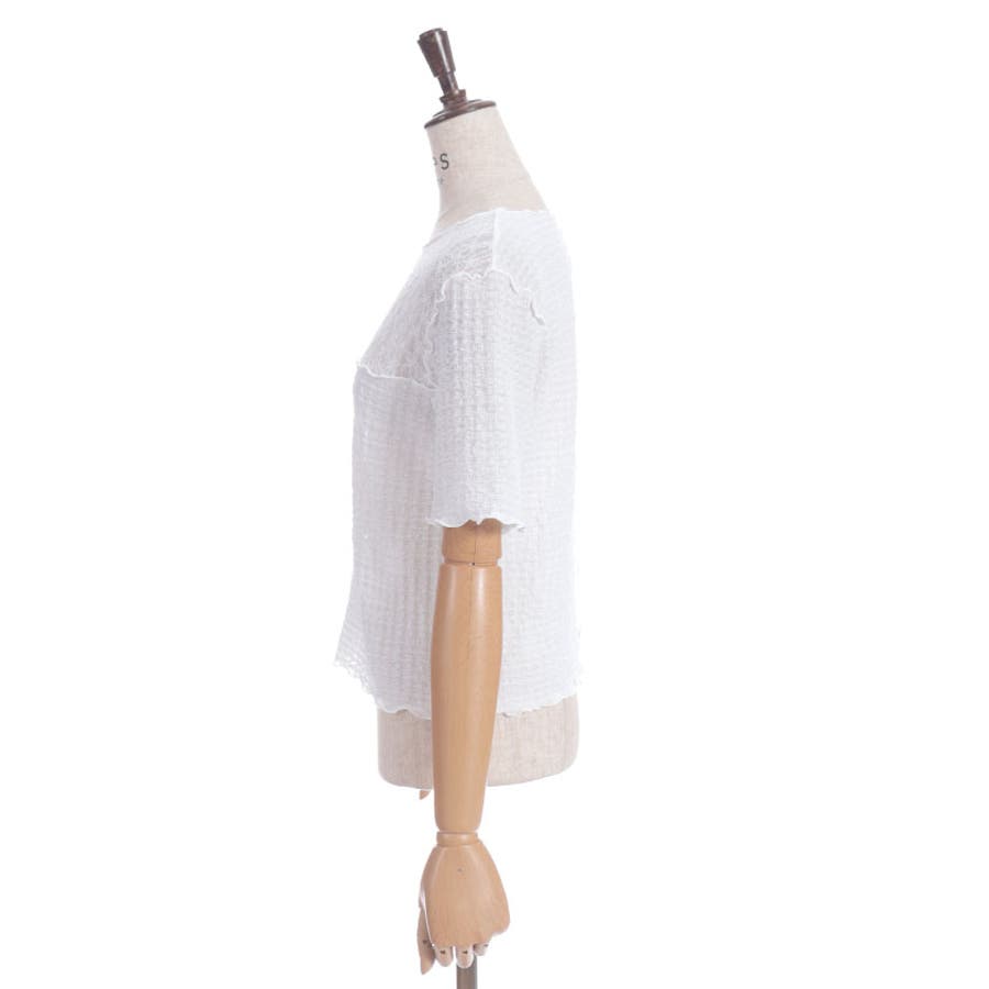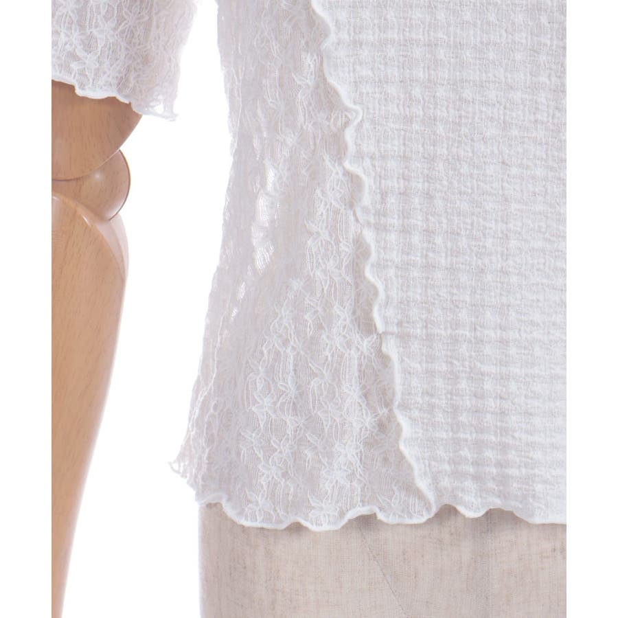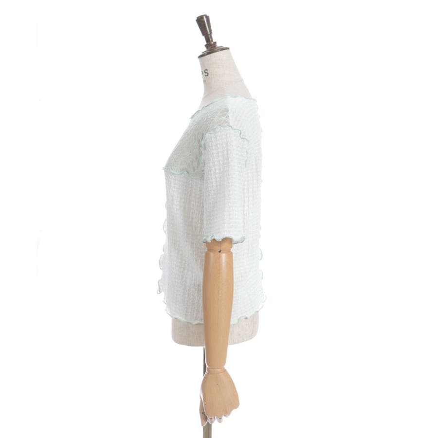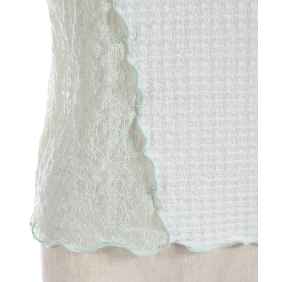 ストレッチの効いたレースとふっくらとしたジャカードカットソー生地を組み合わせたパッチワークデザインが特徴で、メロー始末がまるでフリルのように見えるアクセントになった、繊細さと存在感を兼ね備えたトップスです。