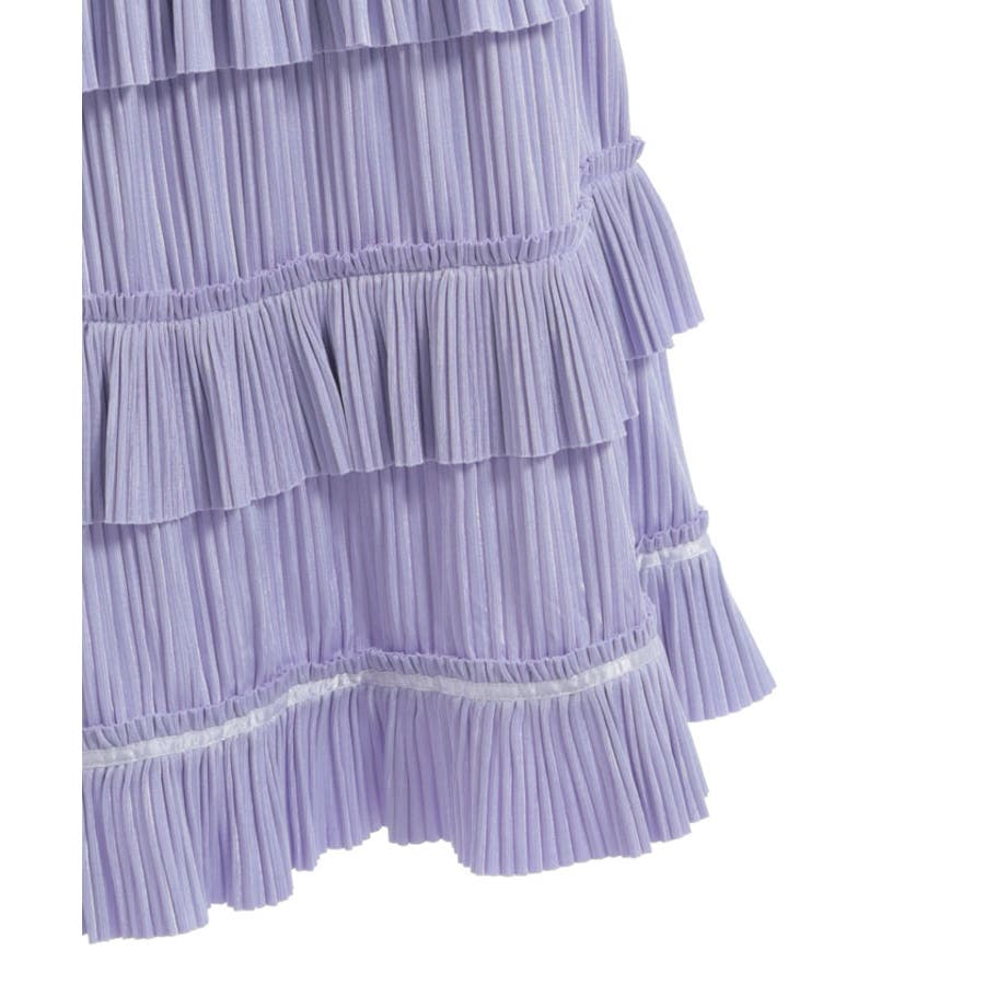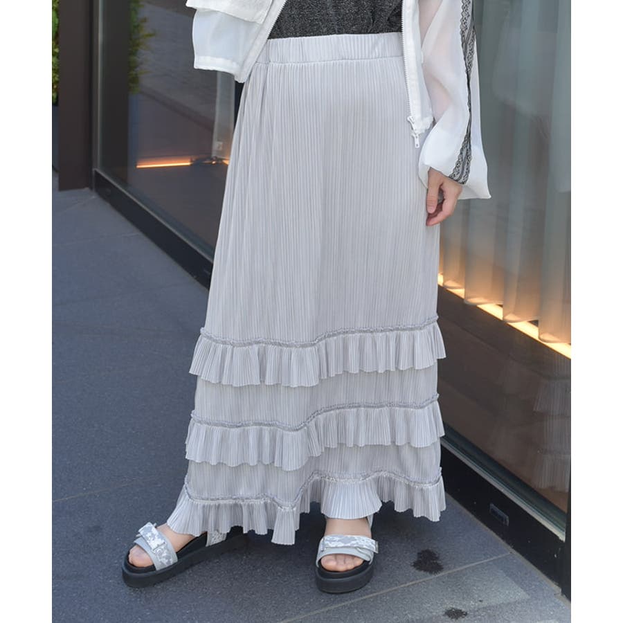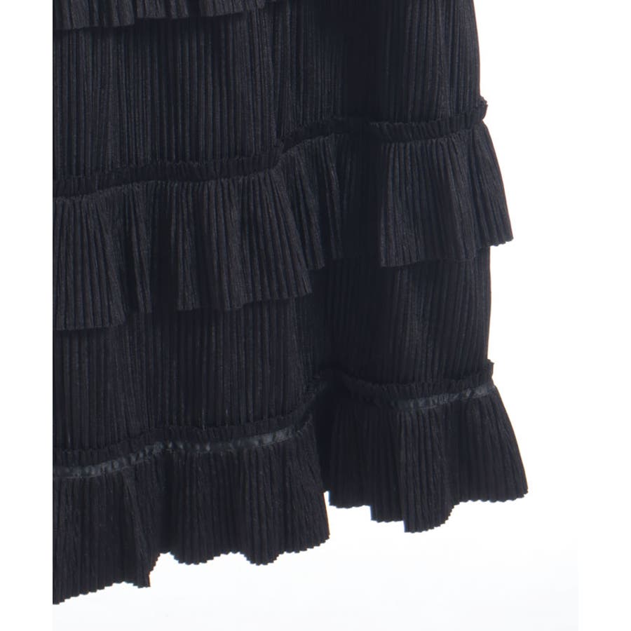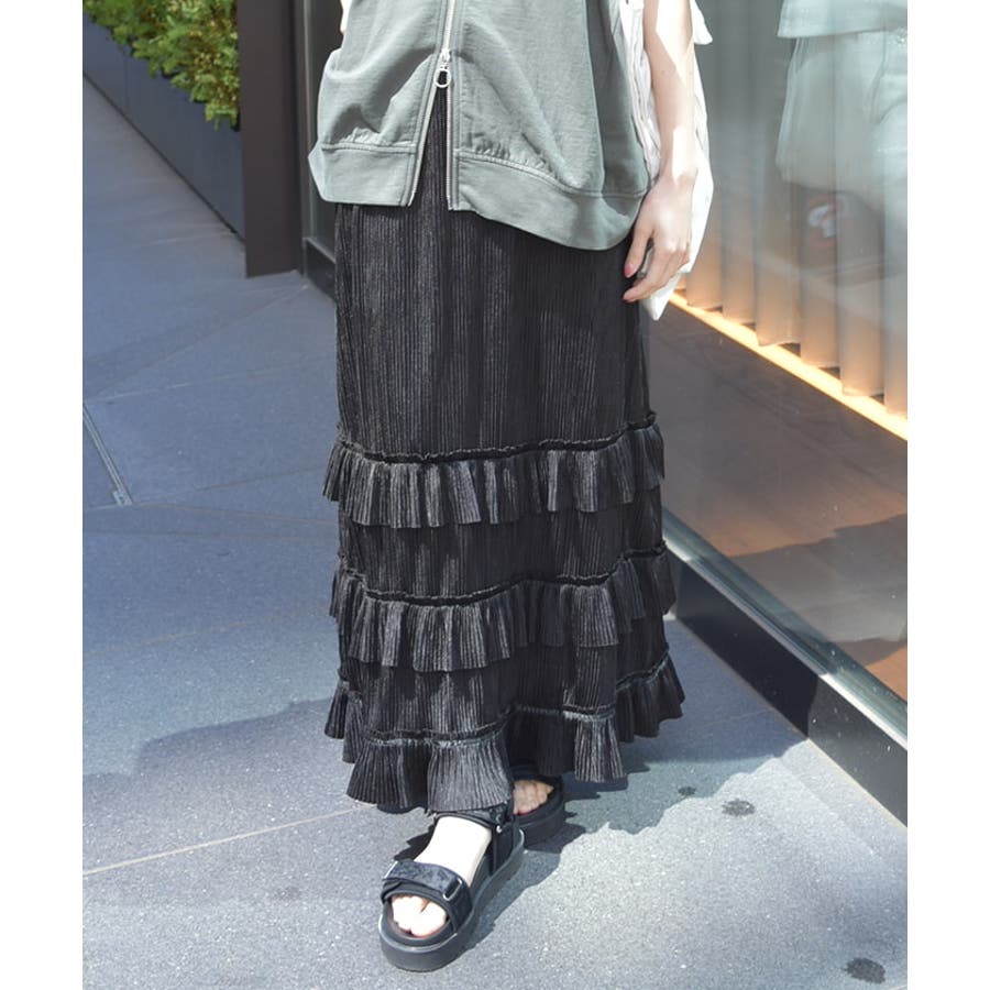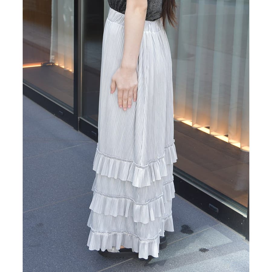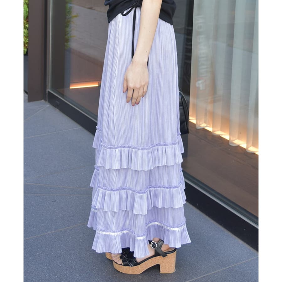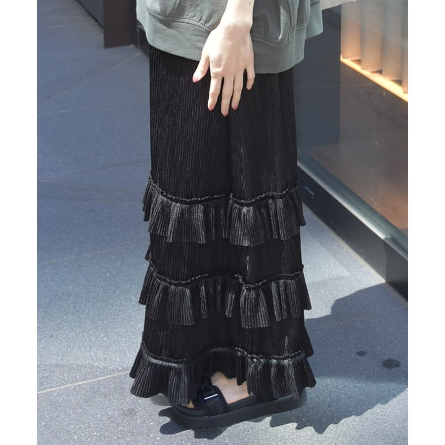 縦ラインを強調する細かいプリーツがすっきり見えを叶えつつ、裾の段フリルで程よいボリューム感をプラス。