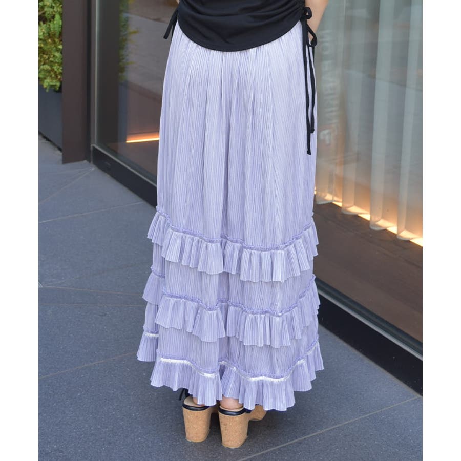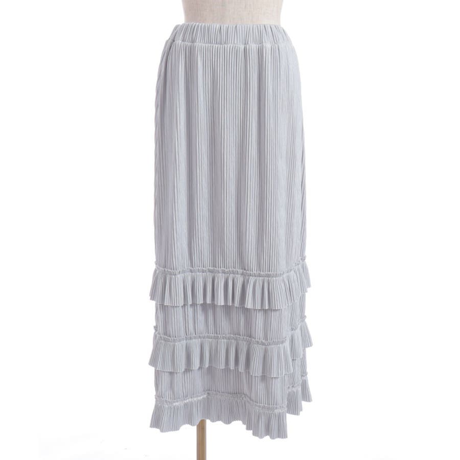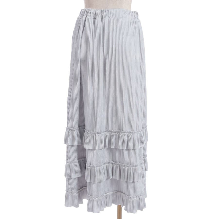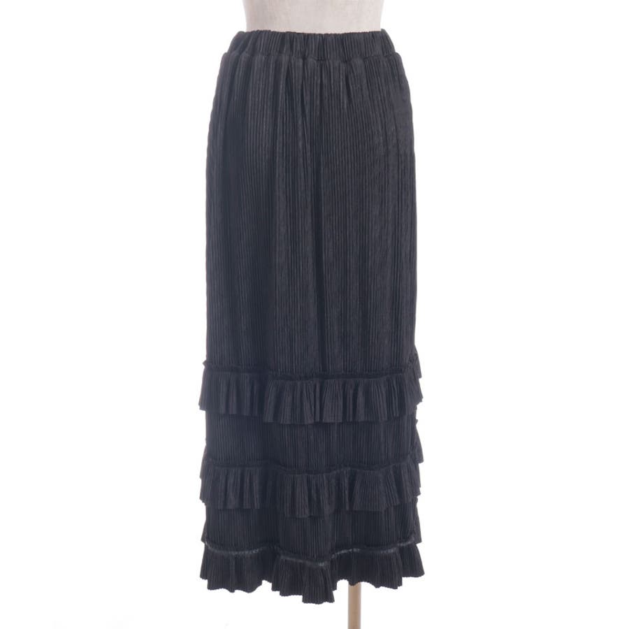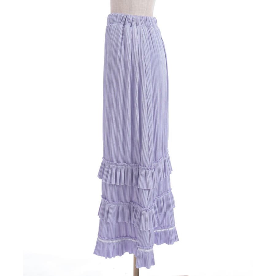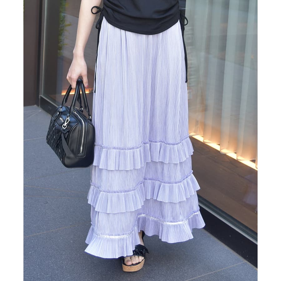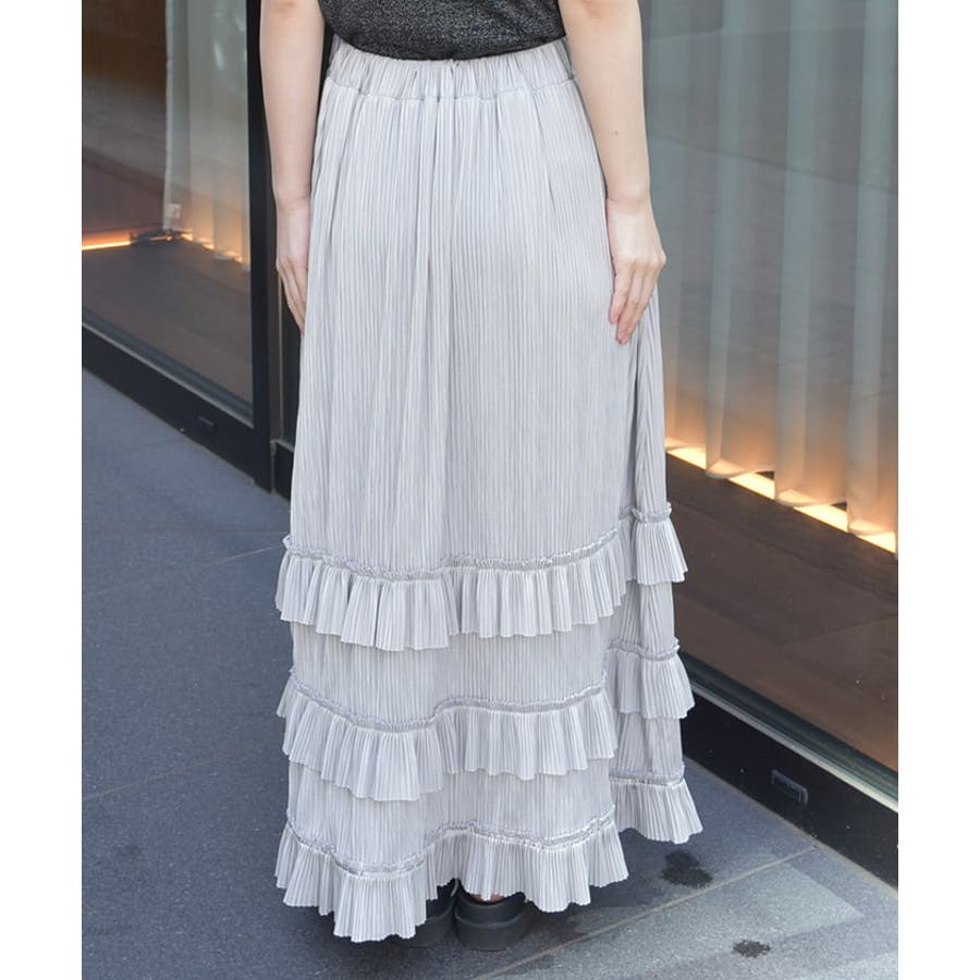 縦ラインを強調する細かいプリーツがすっきり見えを叶えつつ、裾の段フリルで程よいボリューム感をプラス。