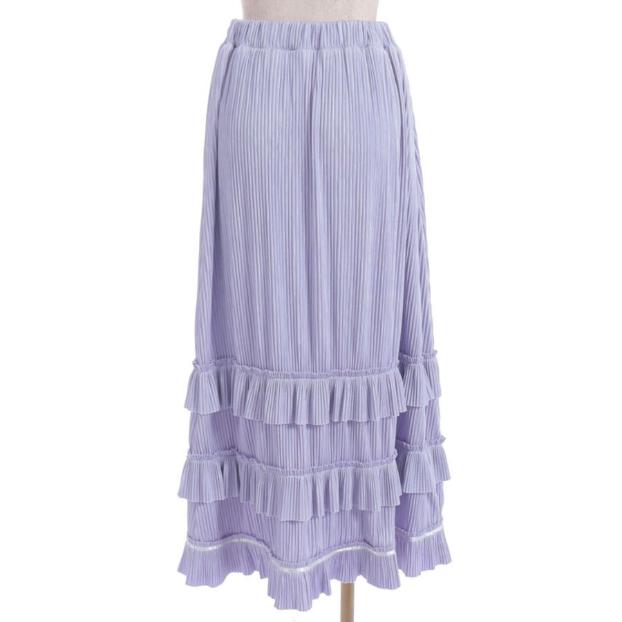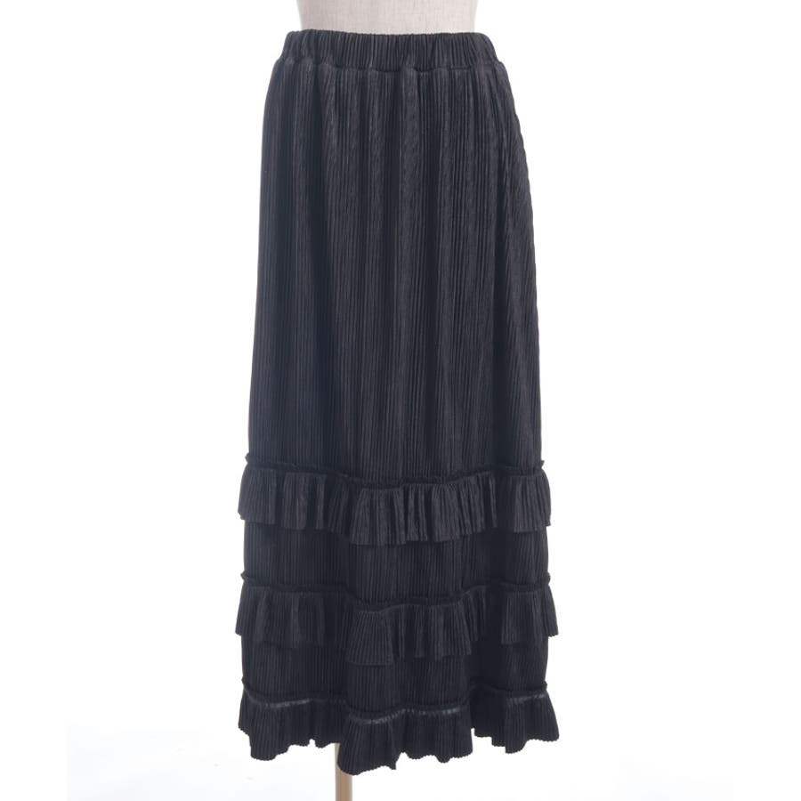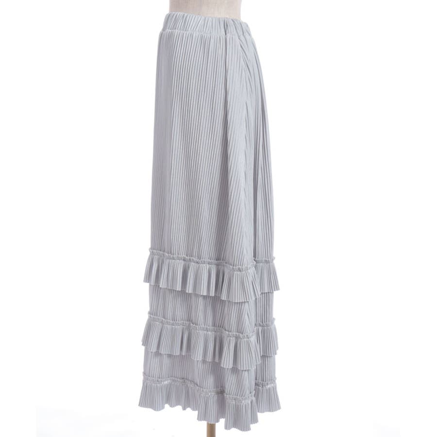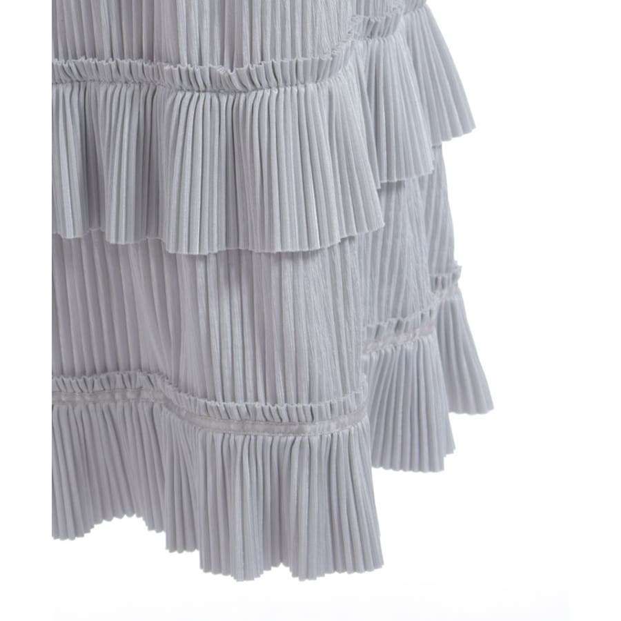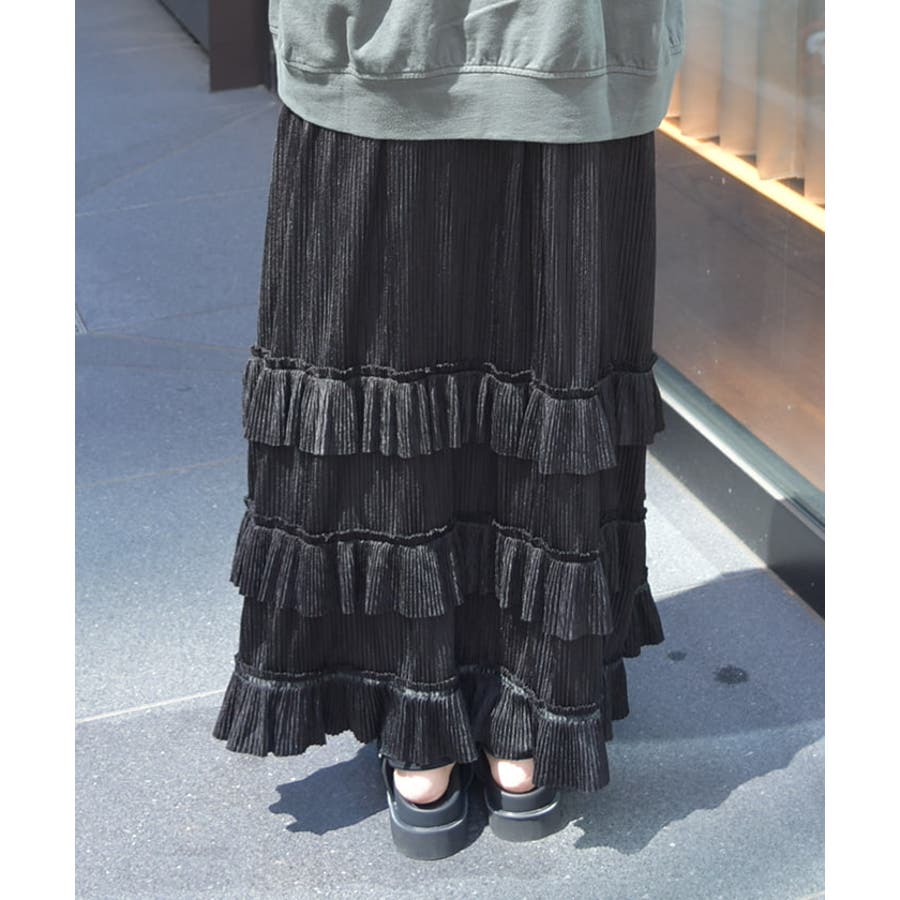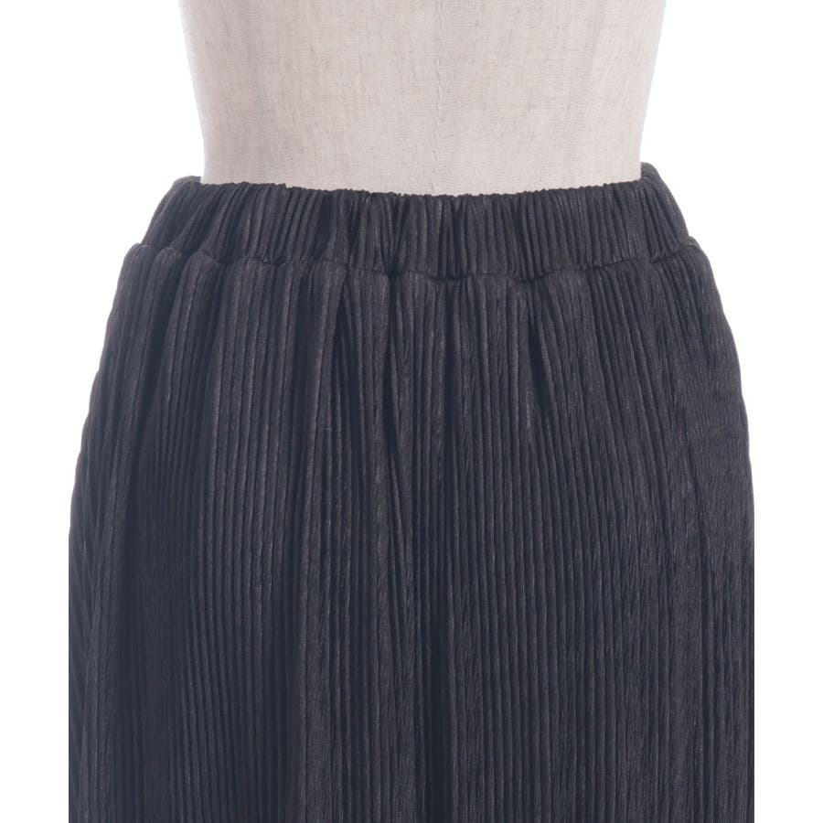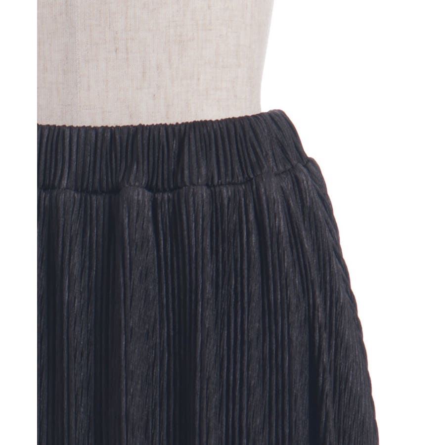縦ラインを強調する細かいプリーツがすっきり見えを叶えつつ、裾の段フリルで程よいボリューム感をプラス。