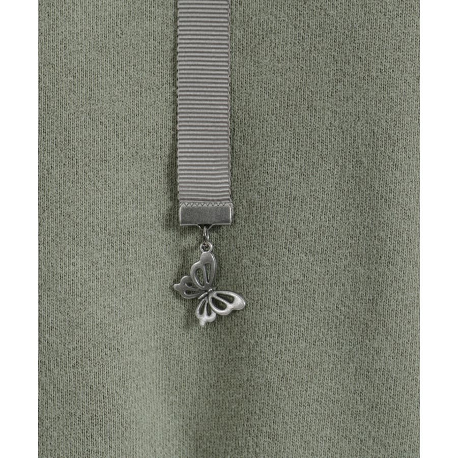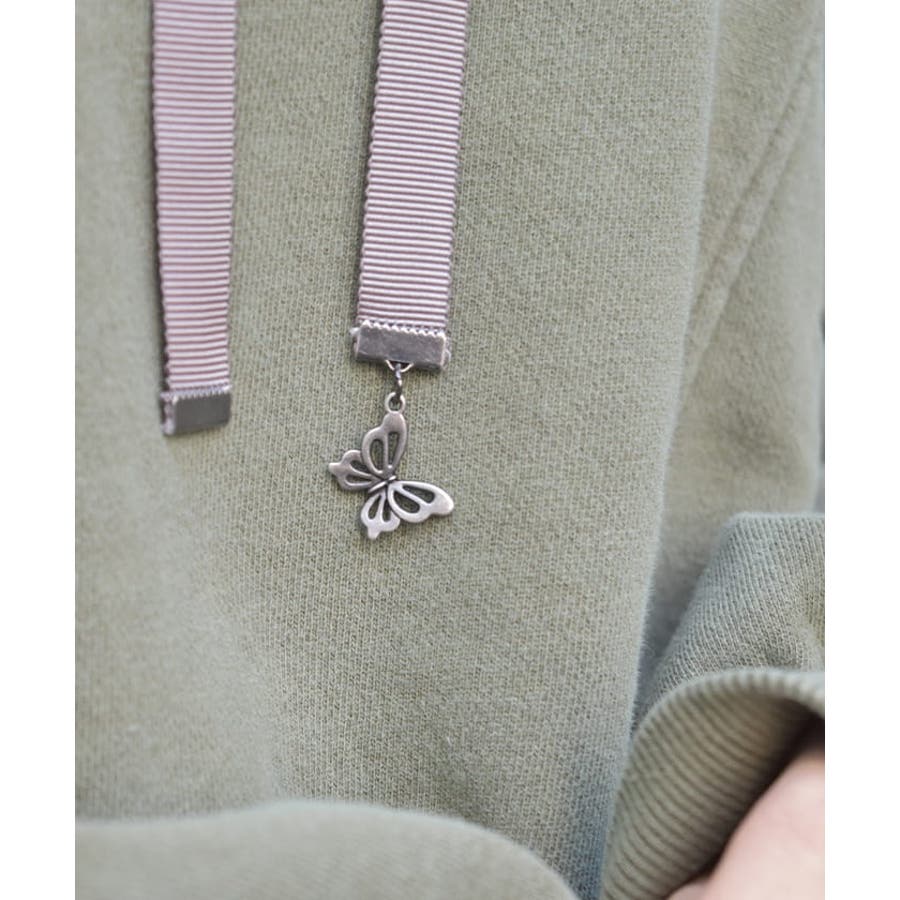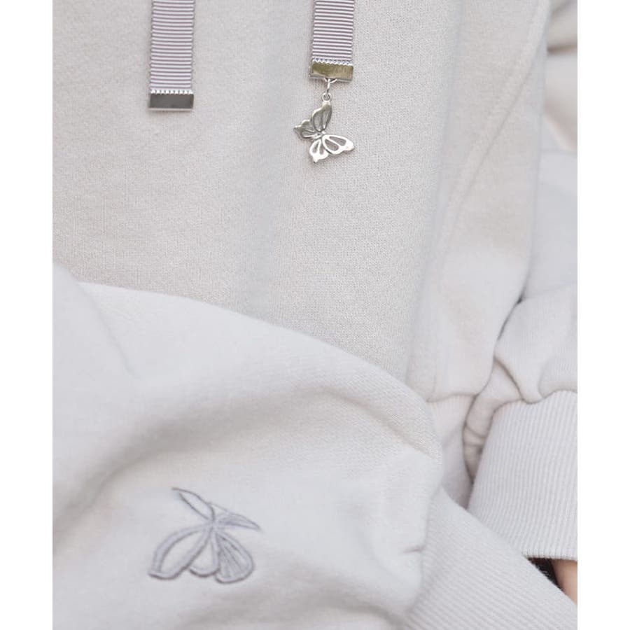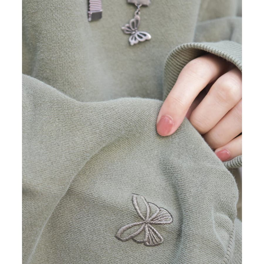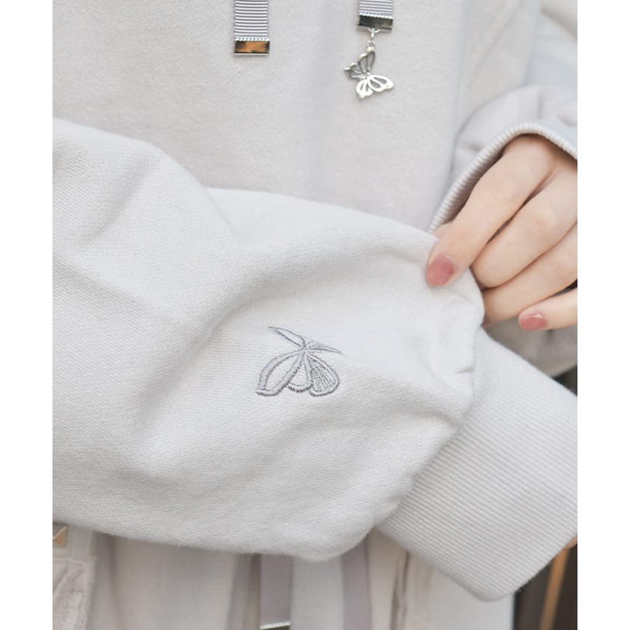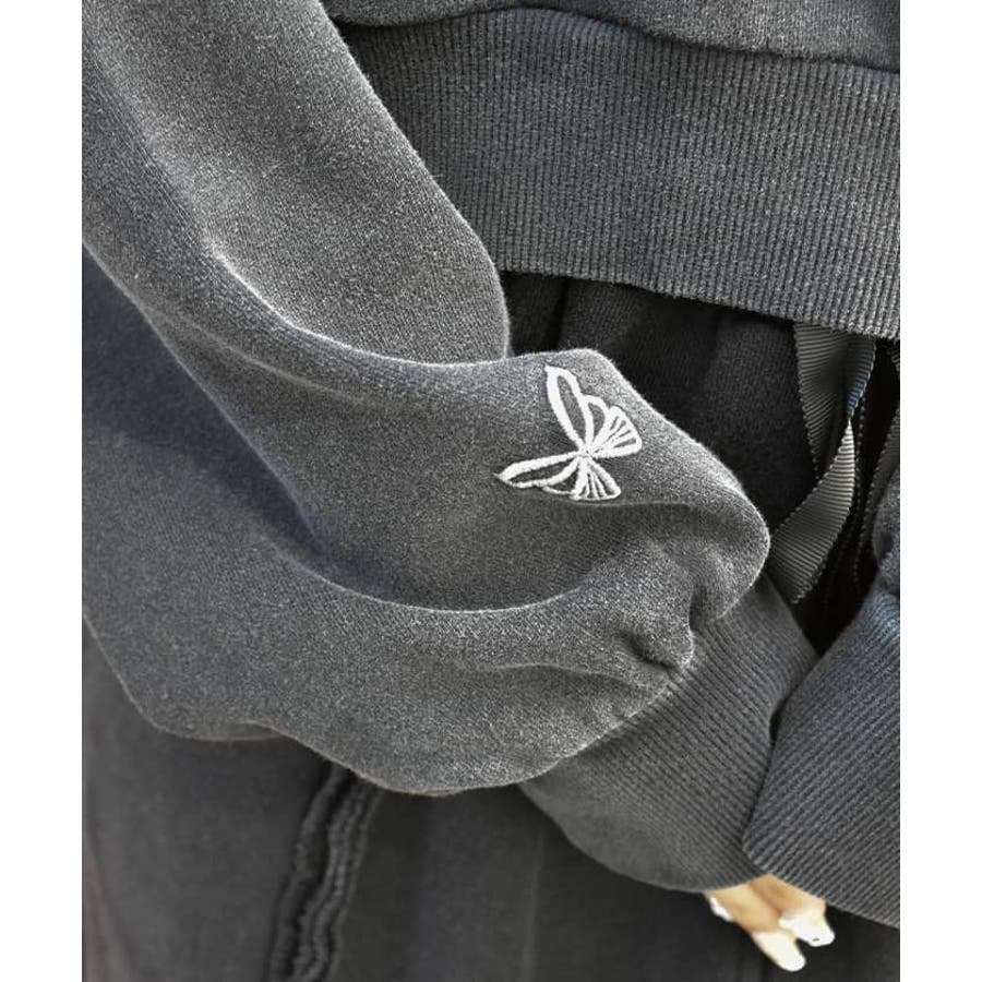 袖口にあしらわれたワンポイント刺繍はスカートと連動した蝶の図案になっており、セットで着用したくなるデザインです。