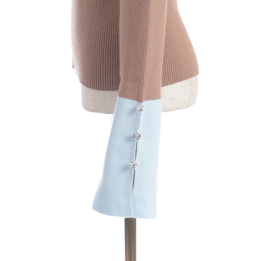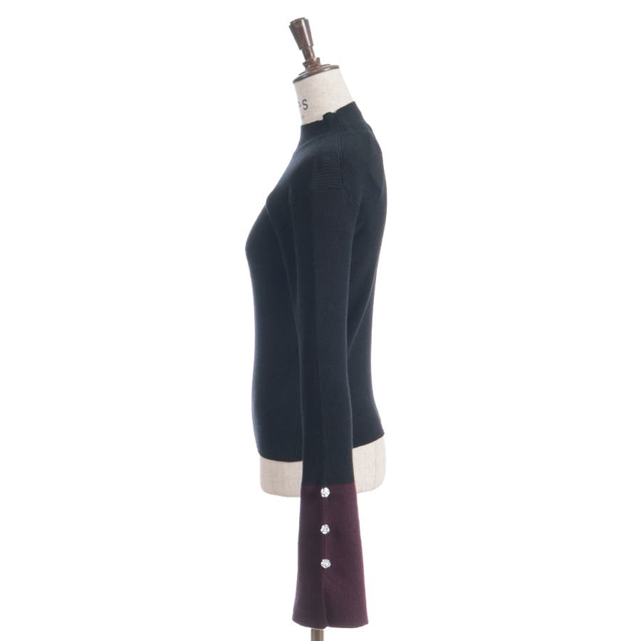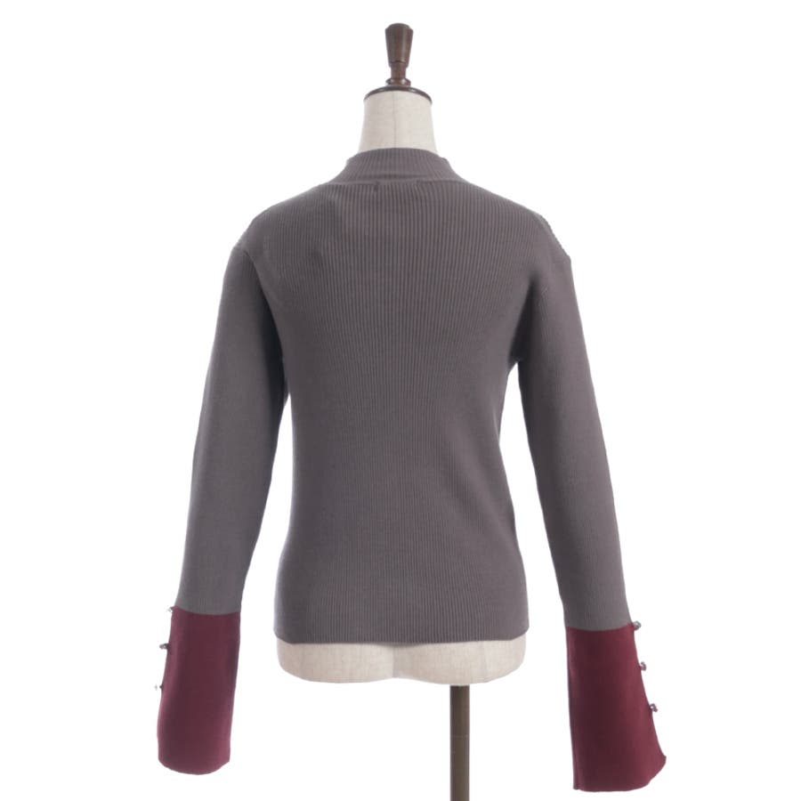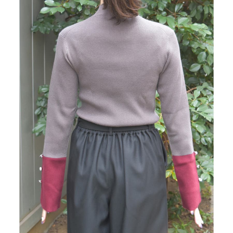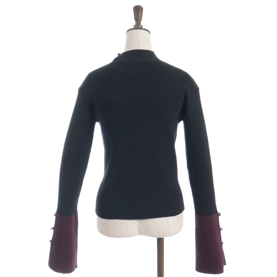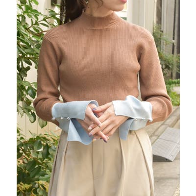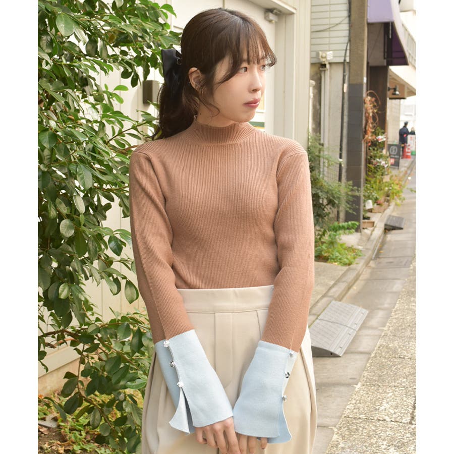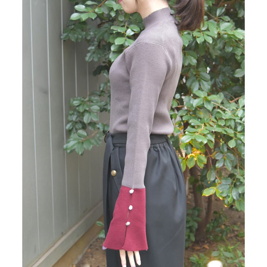 ボディはすっきりとしたリブ編み、袖口にはゆるっと広がる切替を合わせることで、抜け感とモード感を両立。袖口のバラボタンがさりげないアクセントになり、動くたび表情豊かに。