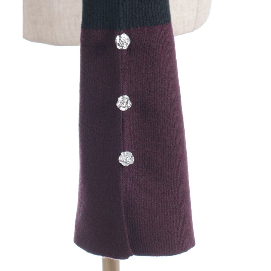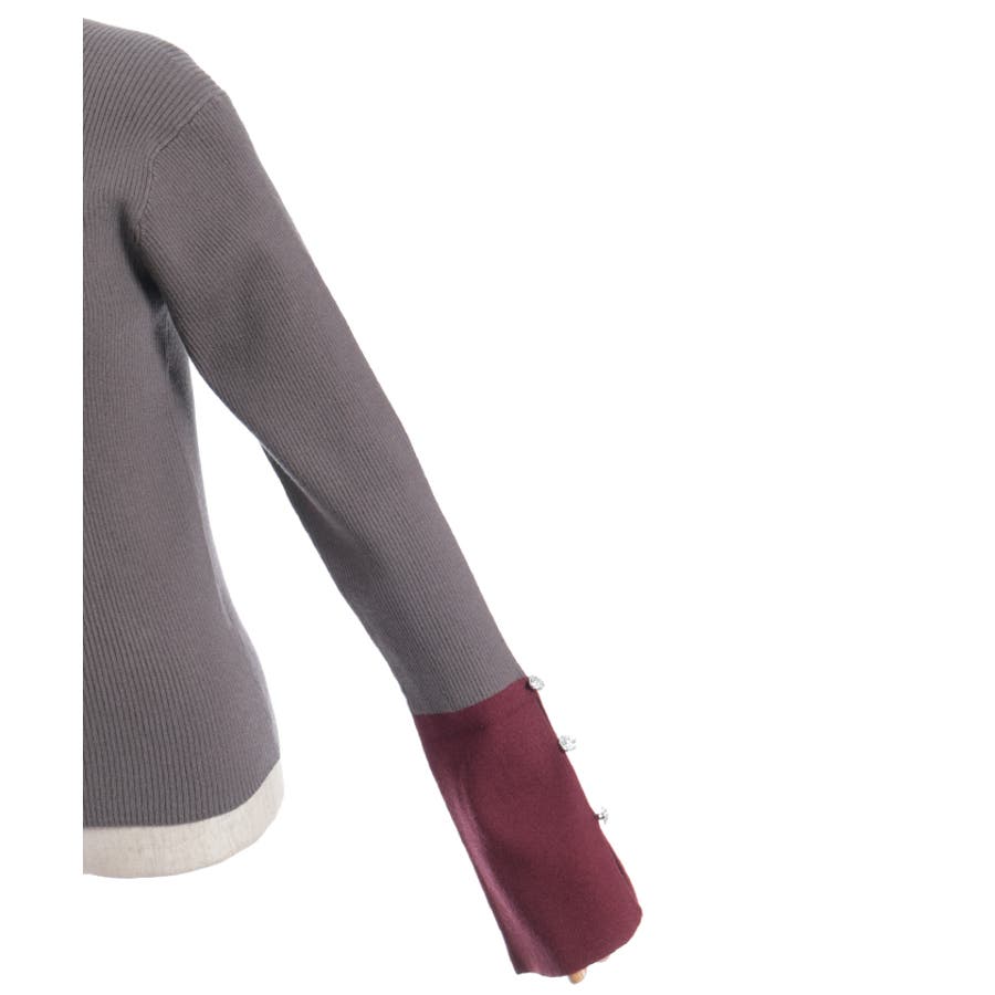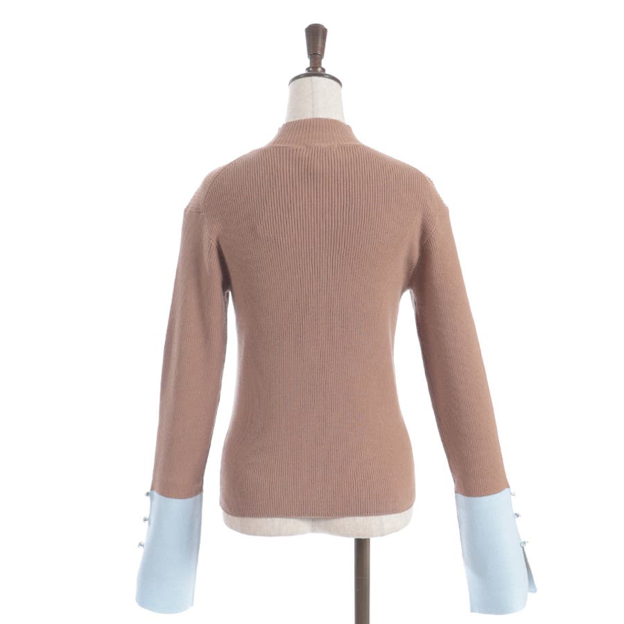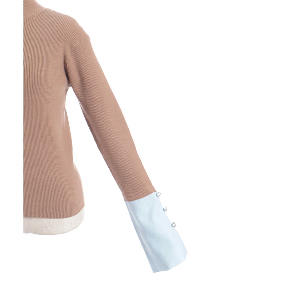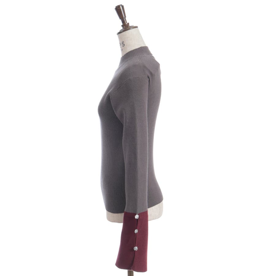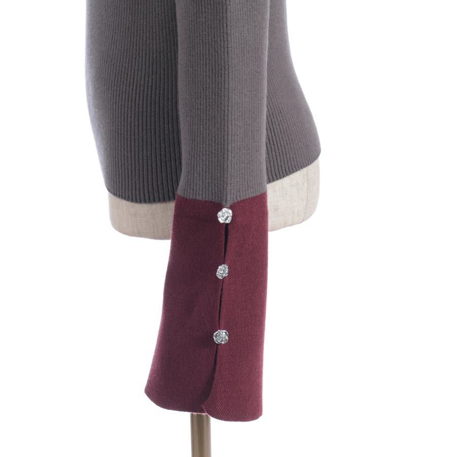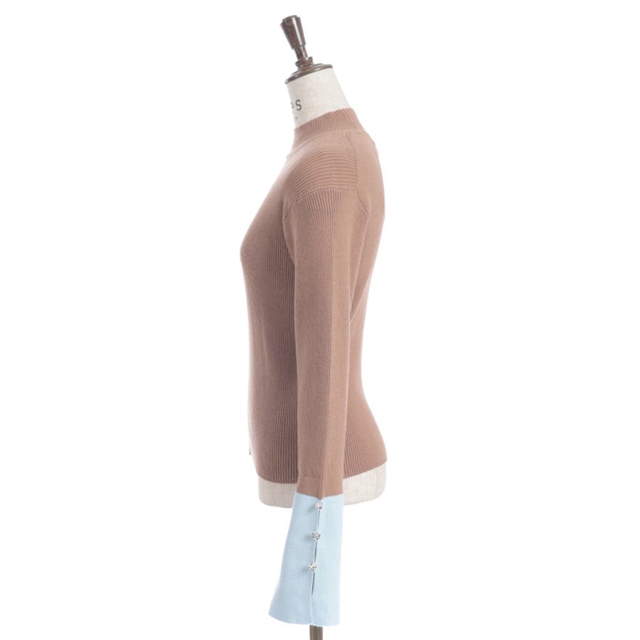 ボディはすっきりとしたリブ編み、袖口にはゆるっと広がる切替を合わせることで、抜け感とモード感を両立。袖口のバラボタンがさりげないアクセントになり、動くたび表情豊かに。