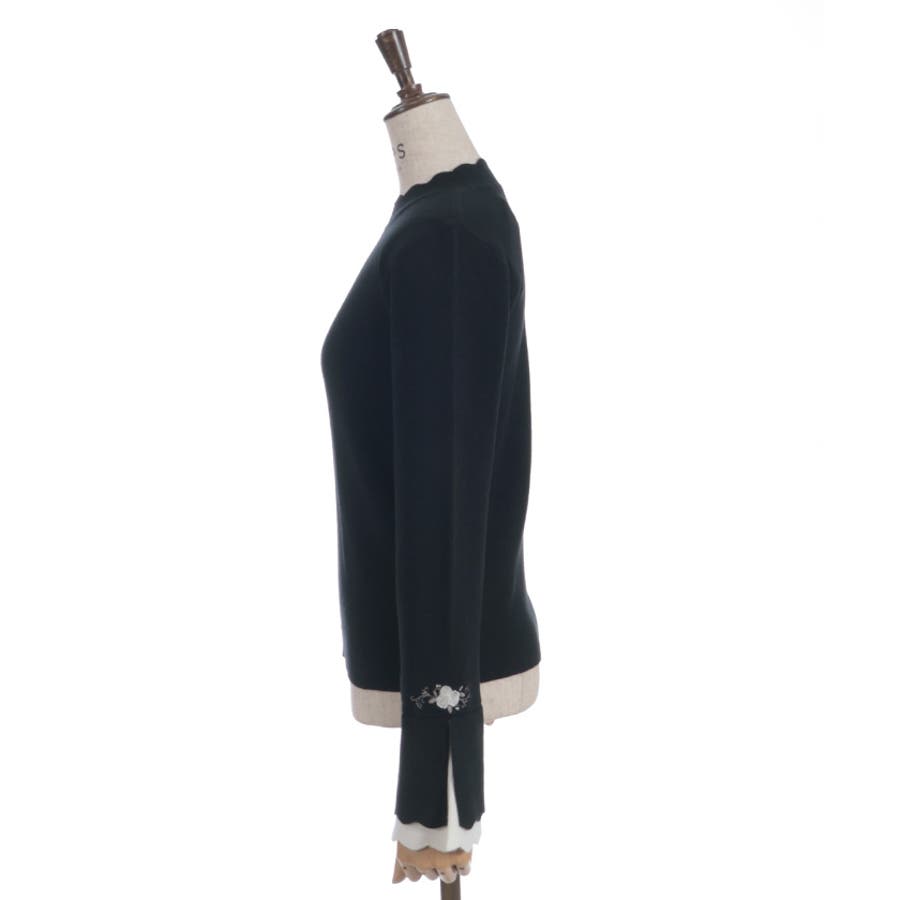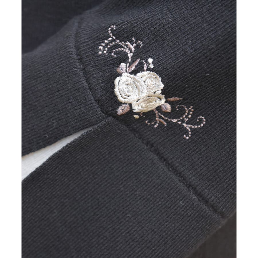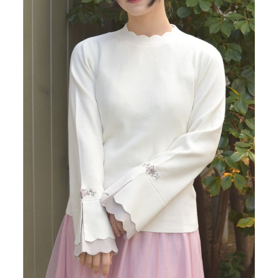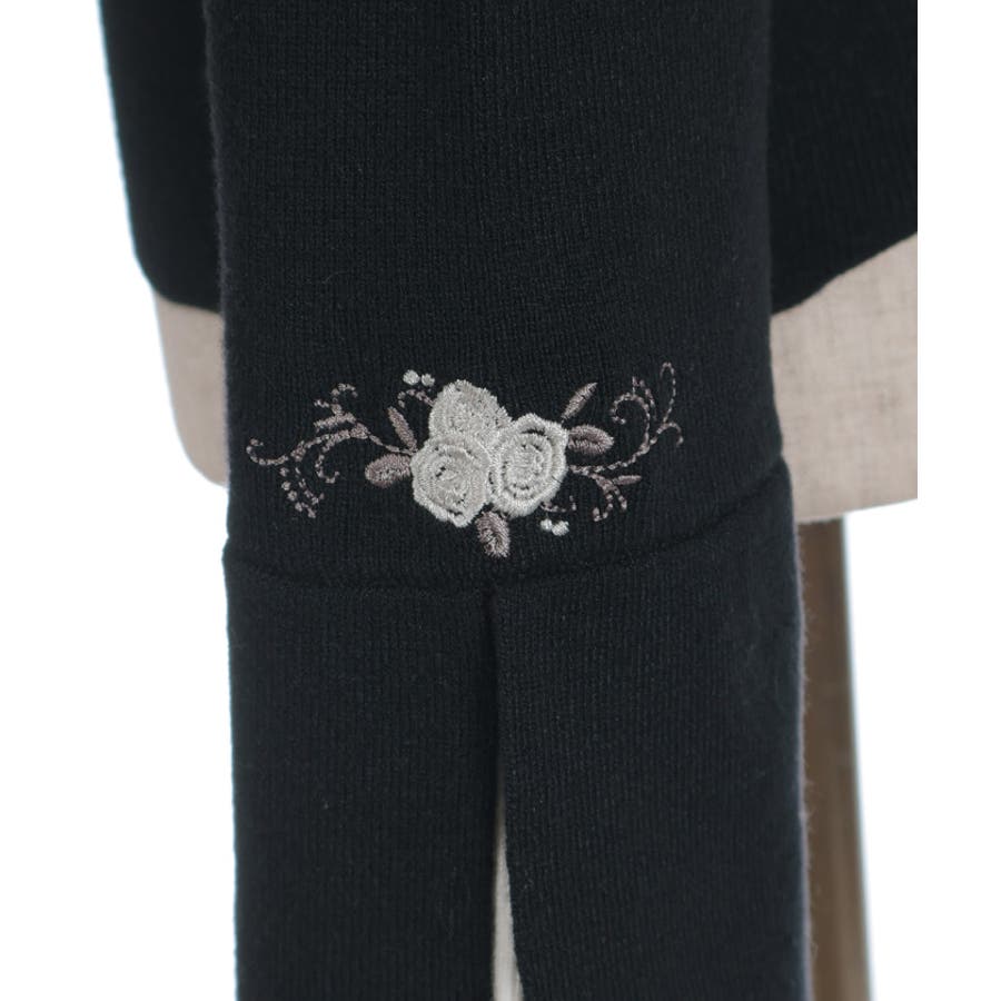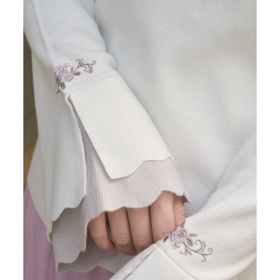 ローズ刺繍とバイカラーデザインの袖が目を惹く、フェミニンなフレア袖のニットプルオーバーです。