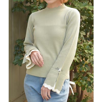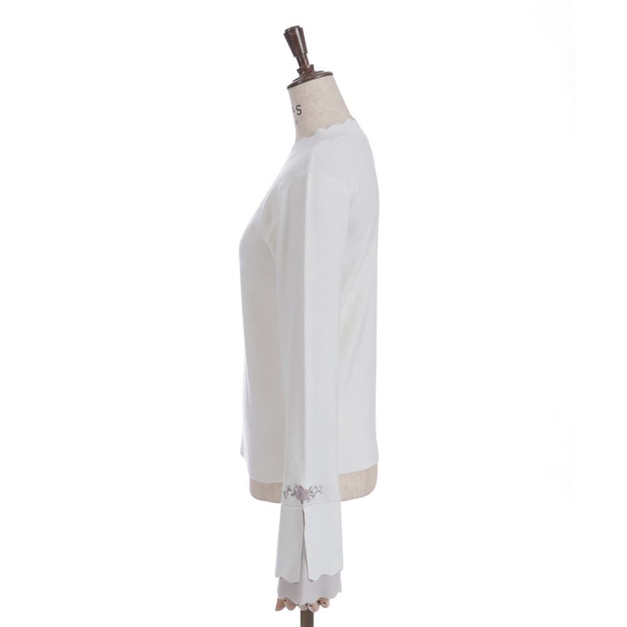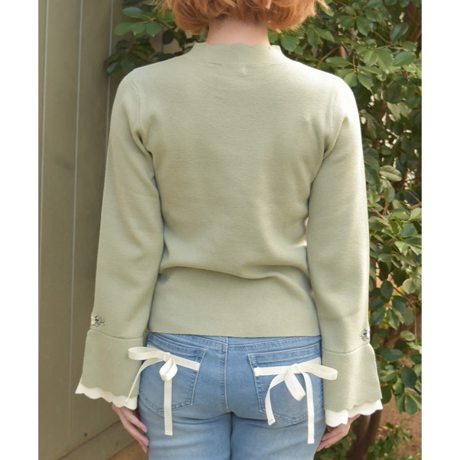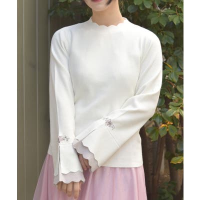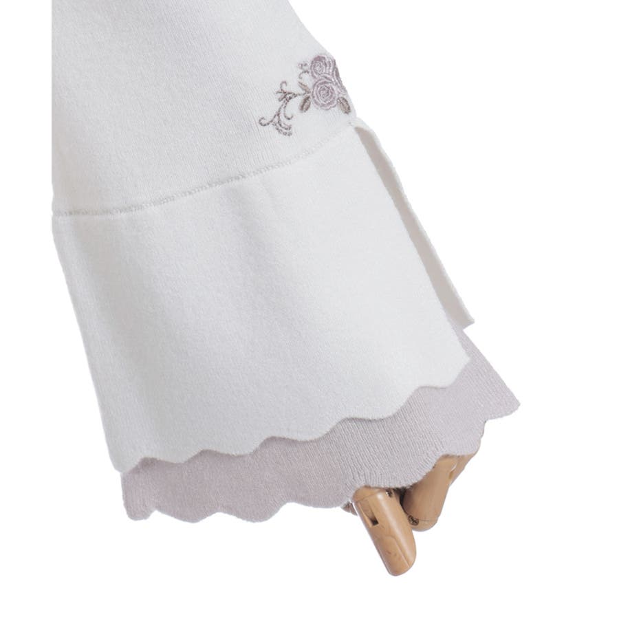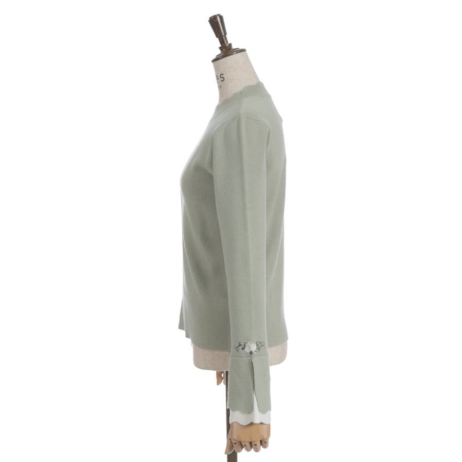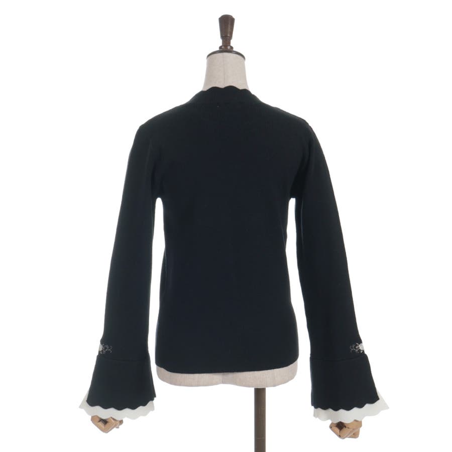 ローズ刺繍とバイカラーデザインの袖が目を惹く、フェミニンなフレア袖のニットプルオーバーです。