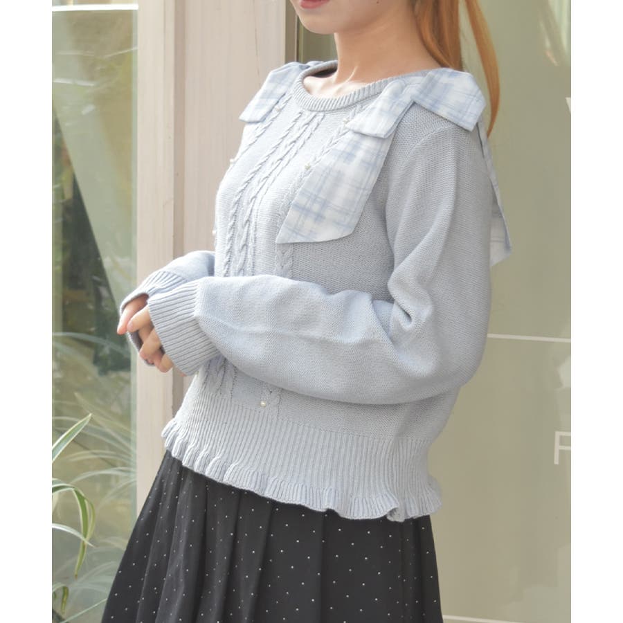 チェック柄のショルダーリボンデザインがポイントのニットです。