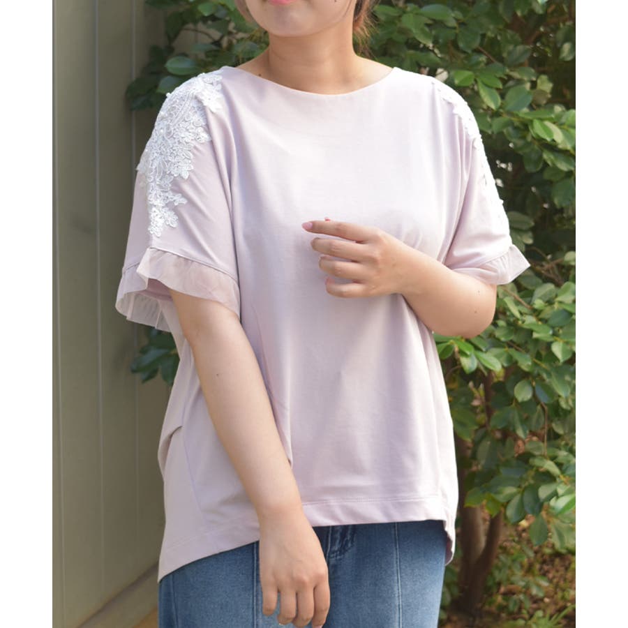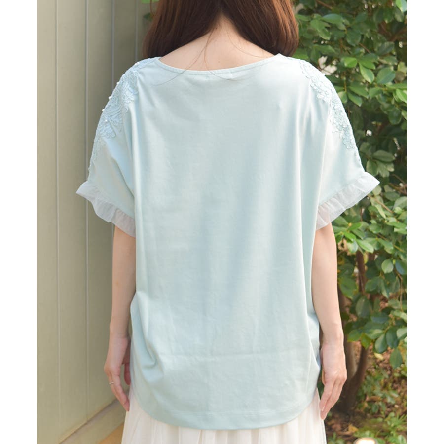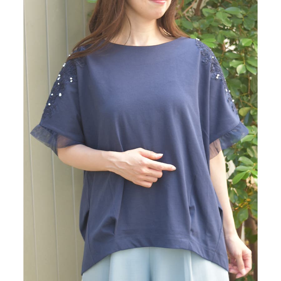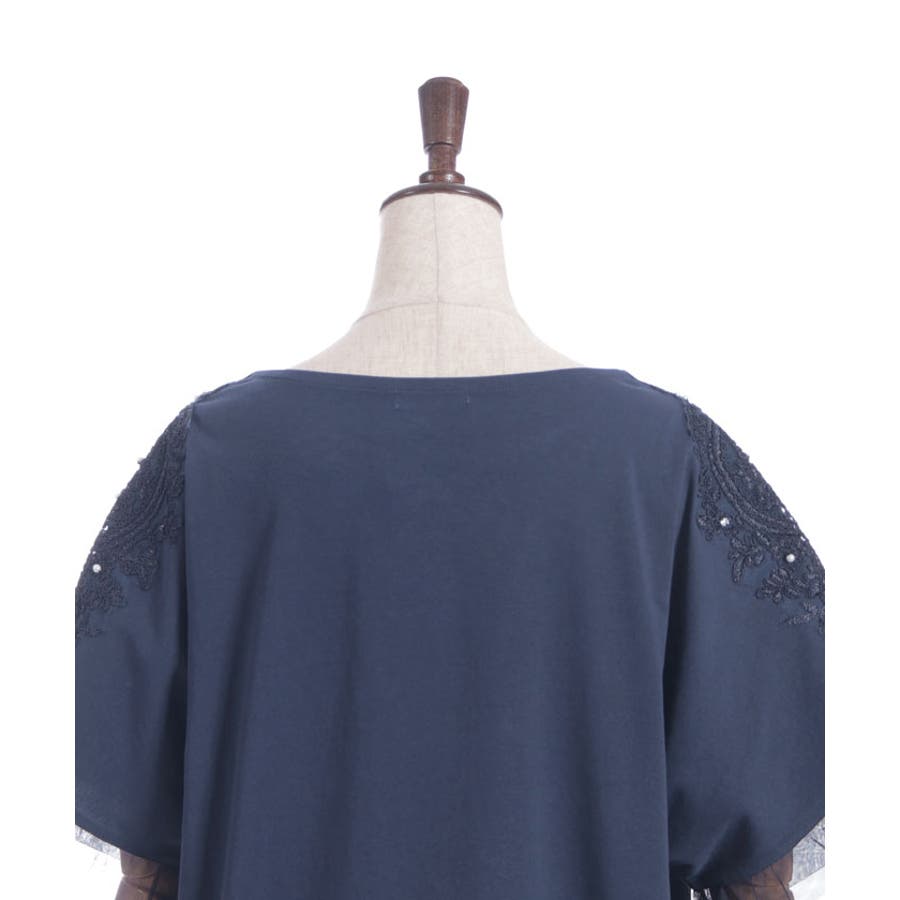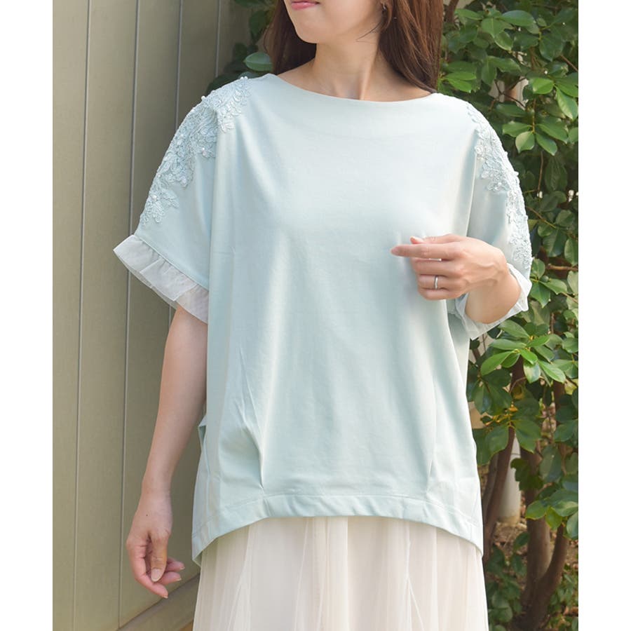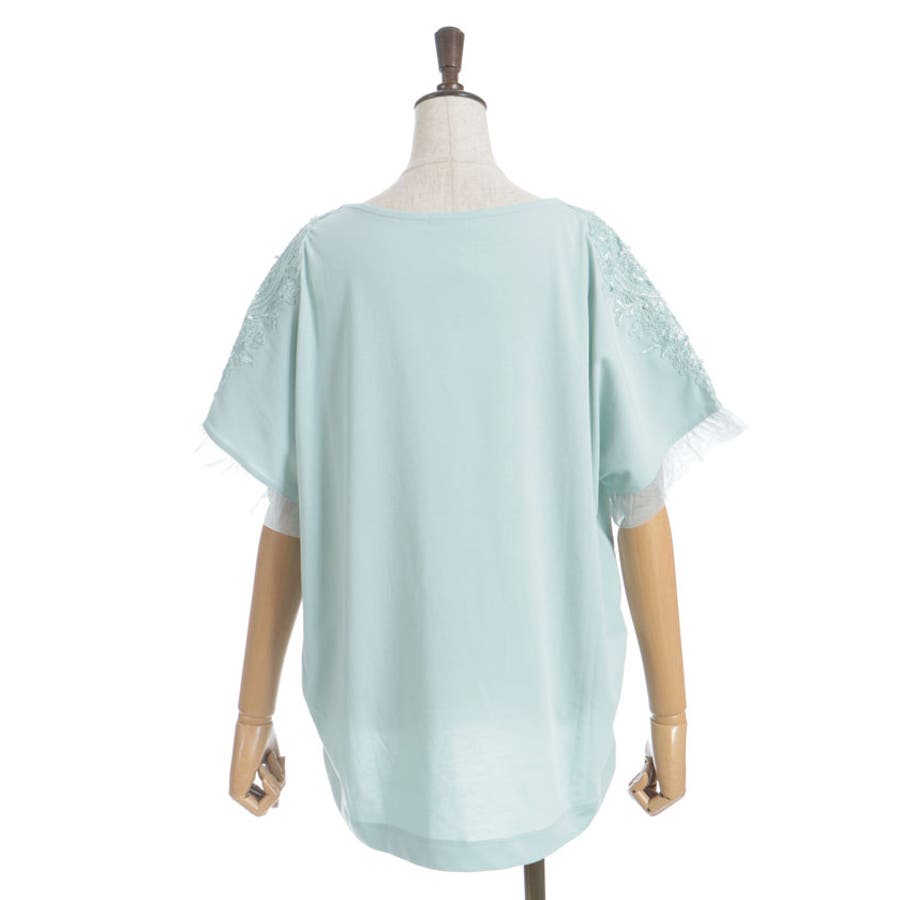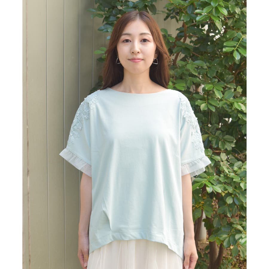 体のシルエットを拾いにくいドルマンスリーブで、袖口は異素材切替でチュールフリルをあしらったデザイン。