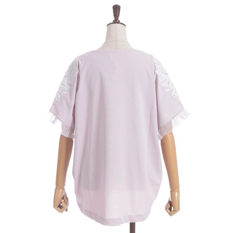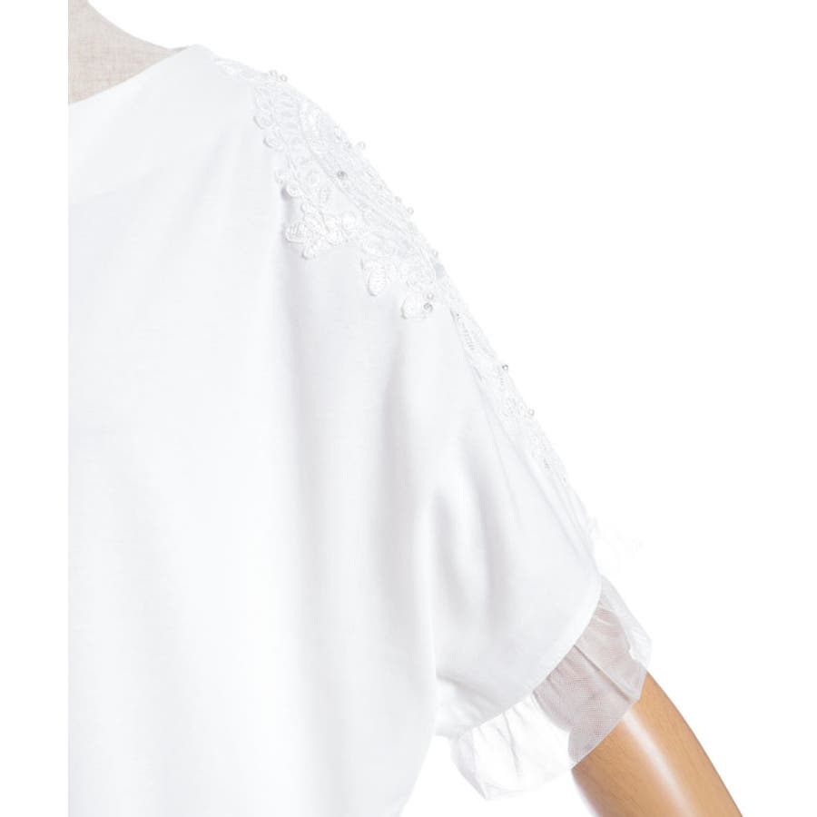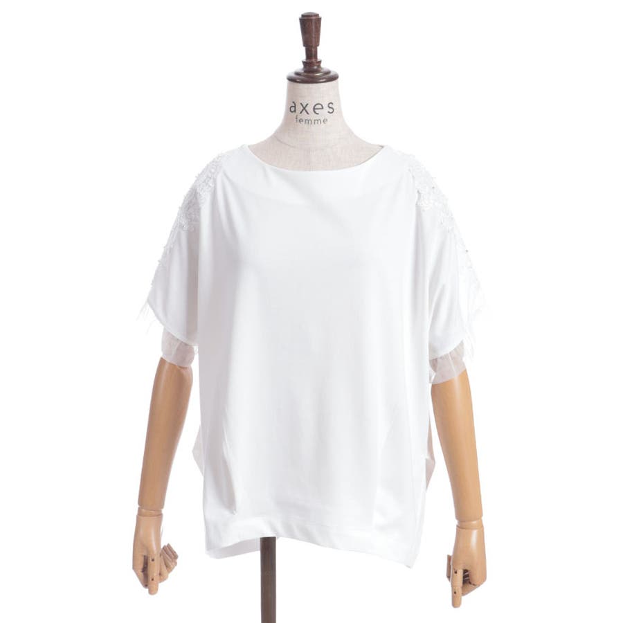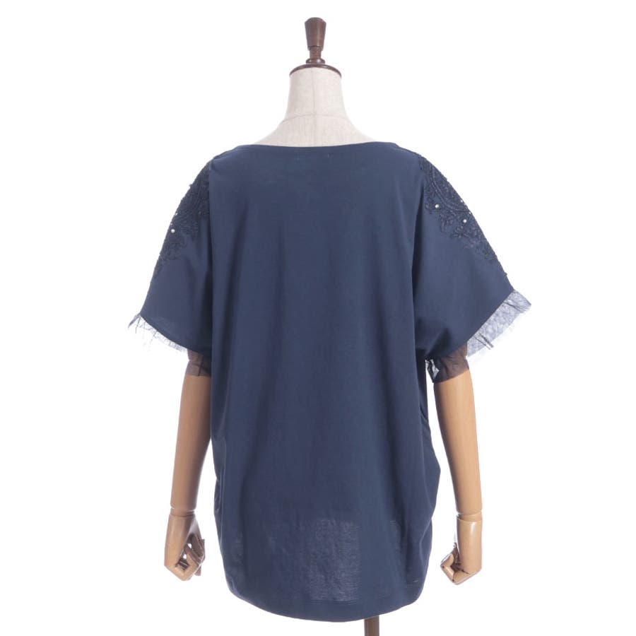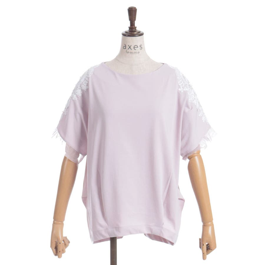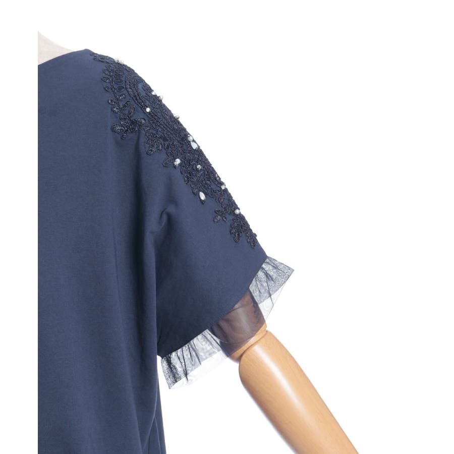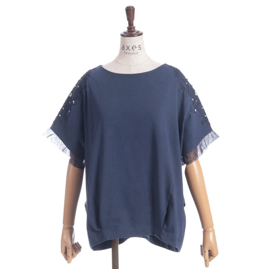 体のシルエットを拾いにくいドルマンスリーブで、袖口は異素材切替でチュールフリルをあしらったデザイン。