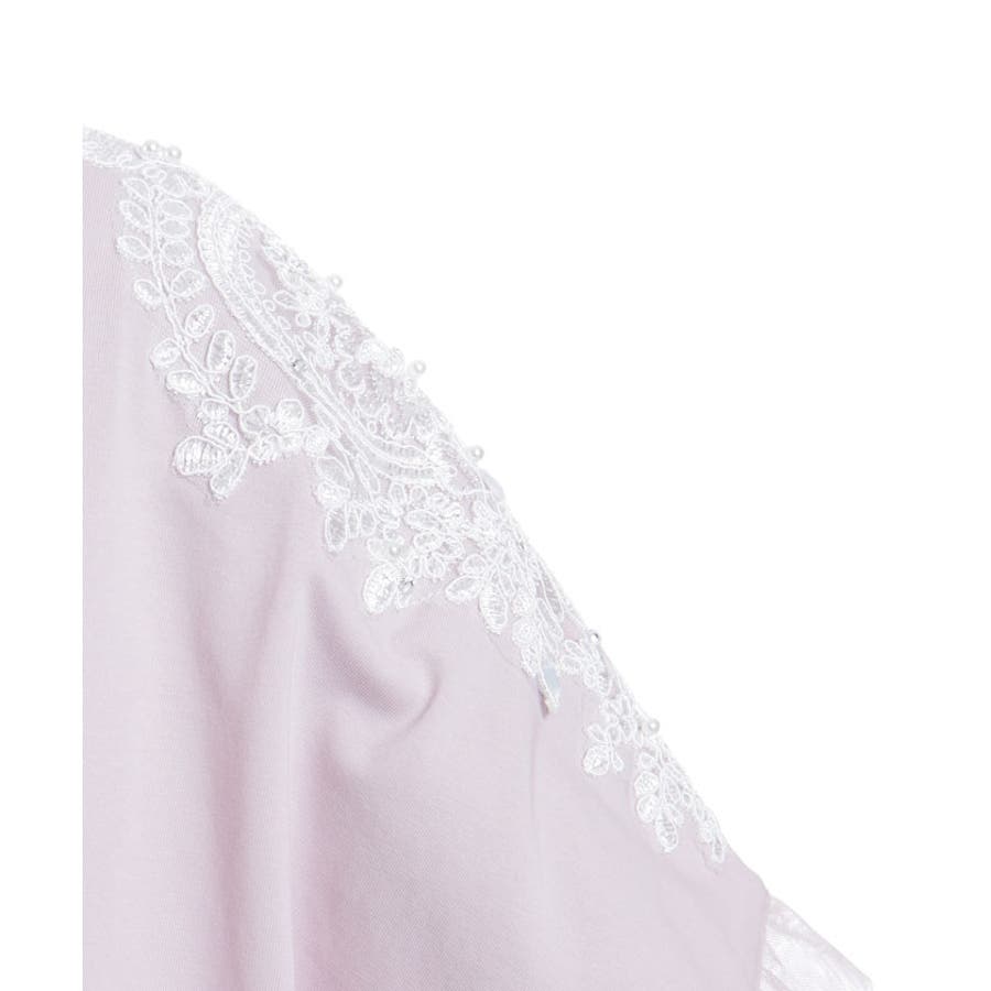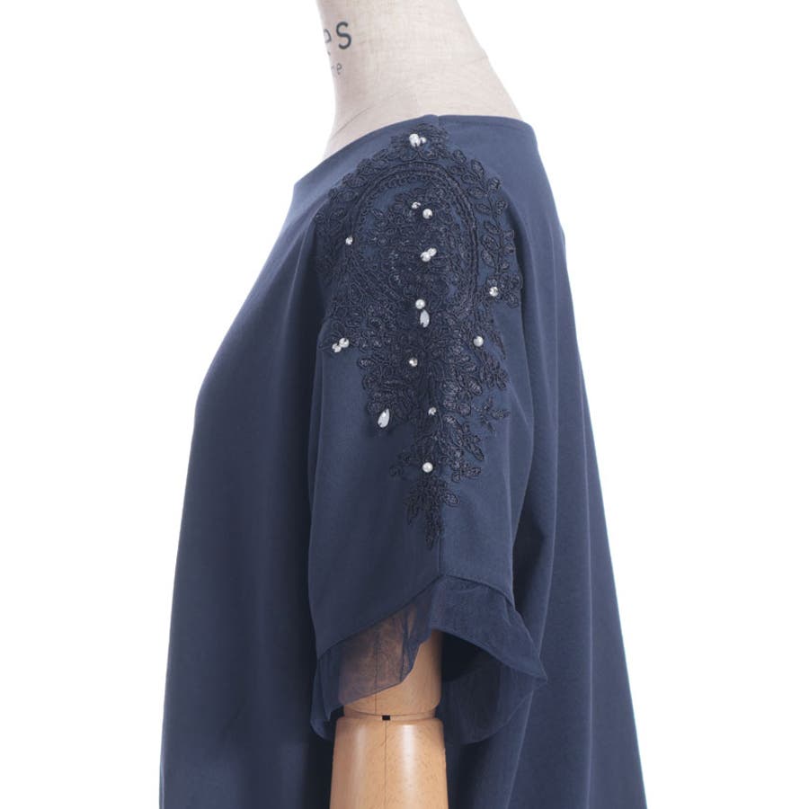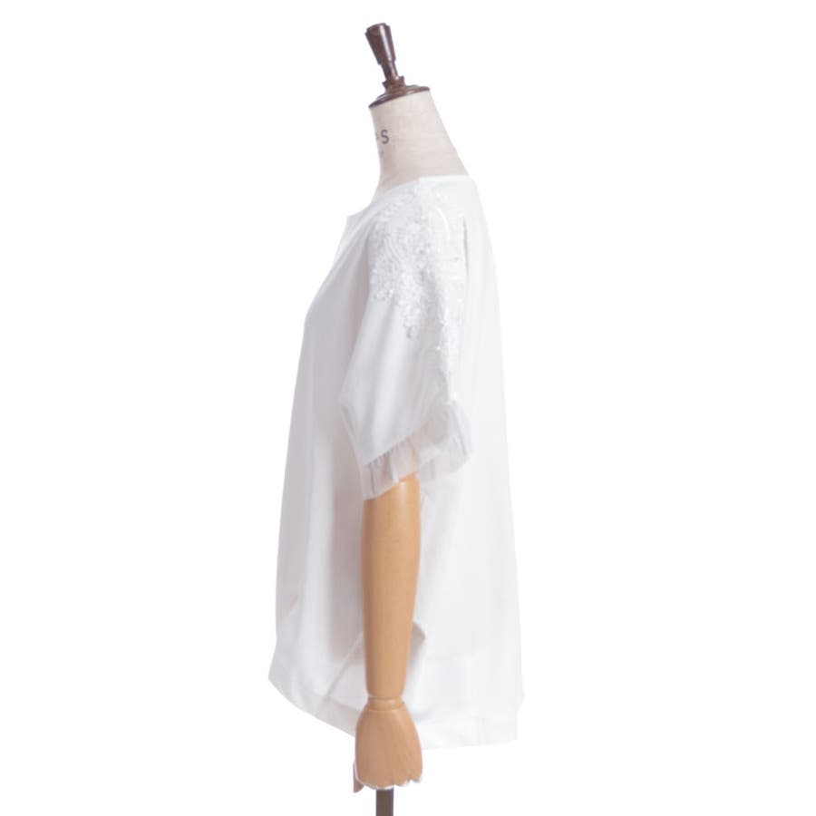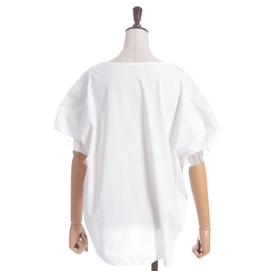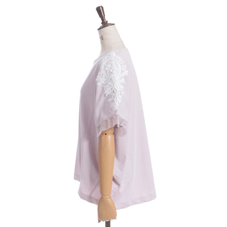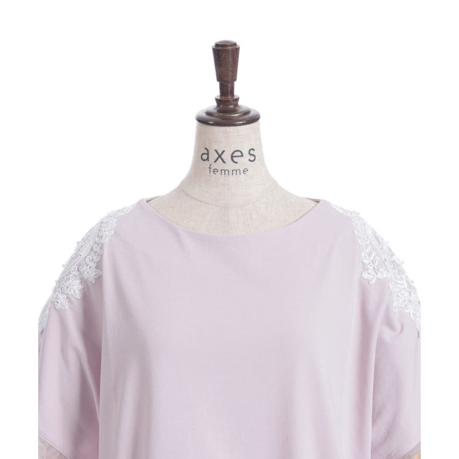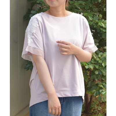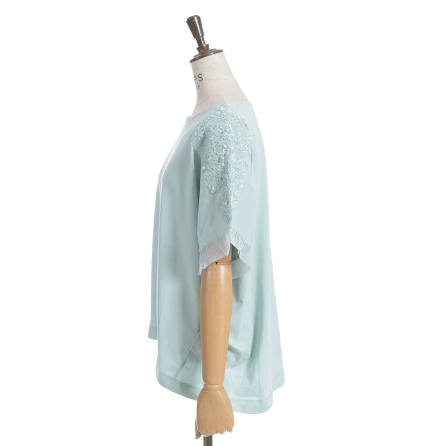 体のシルエットを拾いにくいドルマンスリーブで、袖口は異素材切替でチュールフリルをあしらったデザイン。