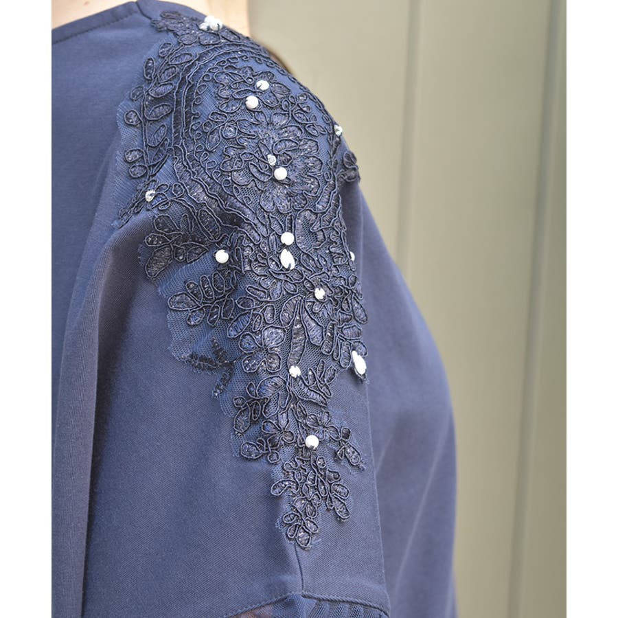 肩にあしらわれた存在感のある華やかなフラワーレースがポイント。