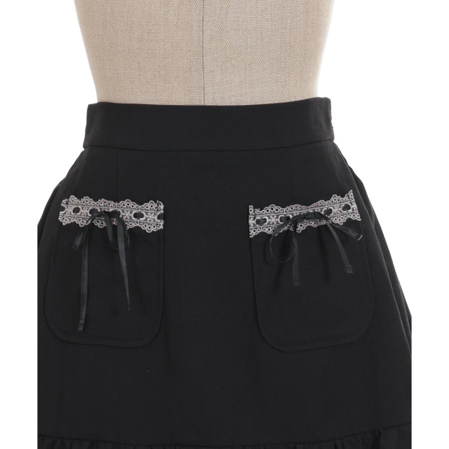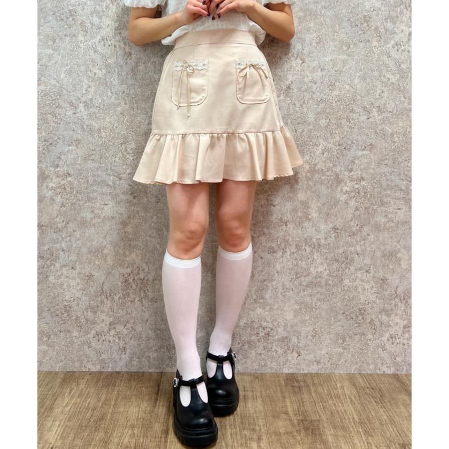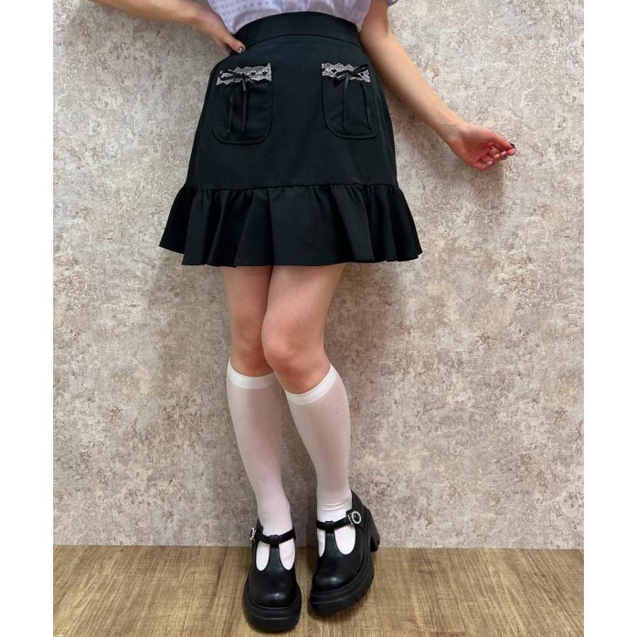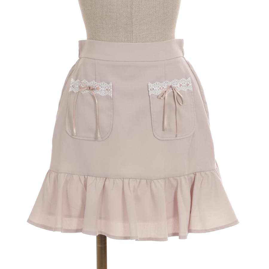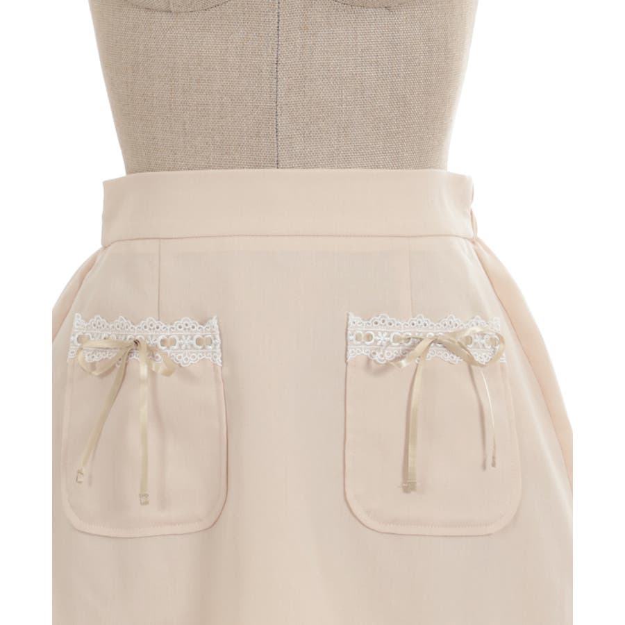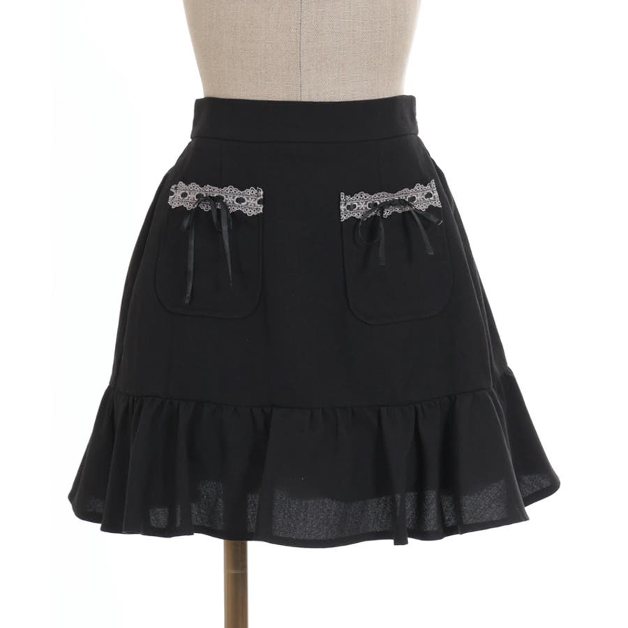ポケットの縁にレースとリボンをあしらい、ガーリームードたっぷりに仕上げたスカートです♪