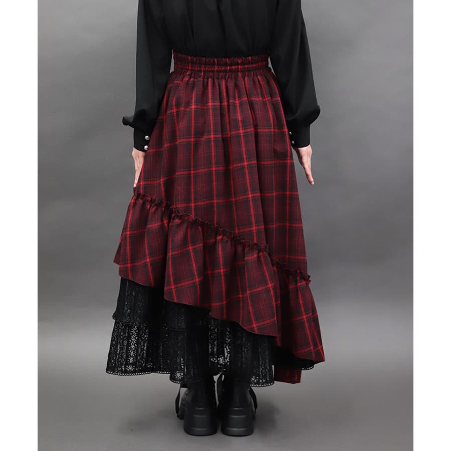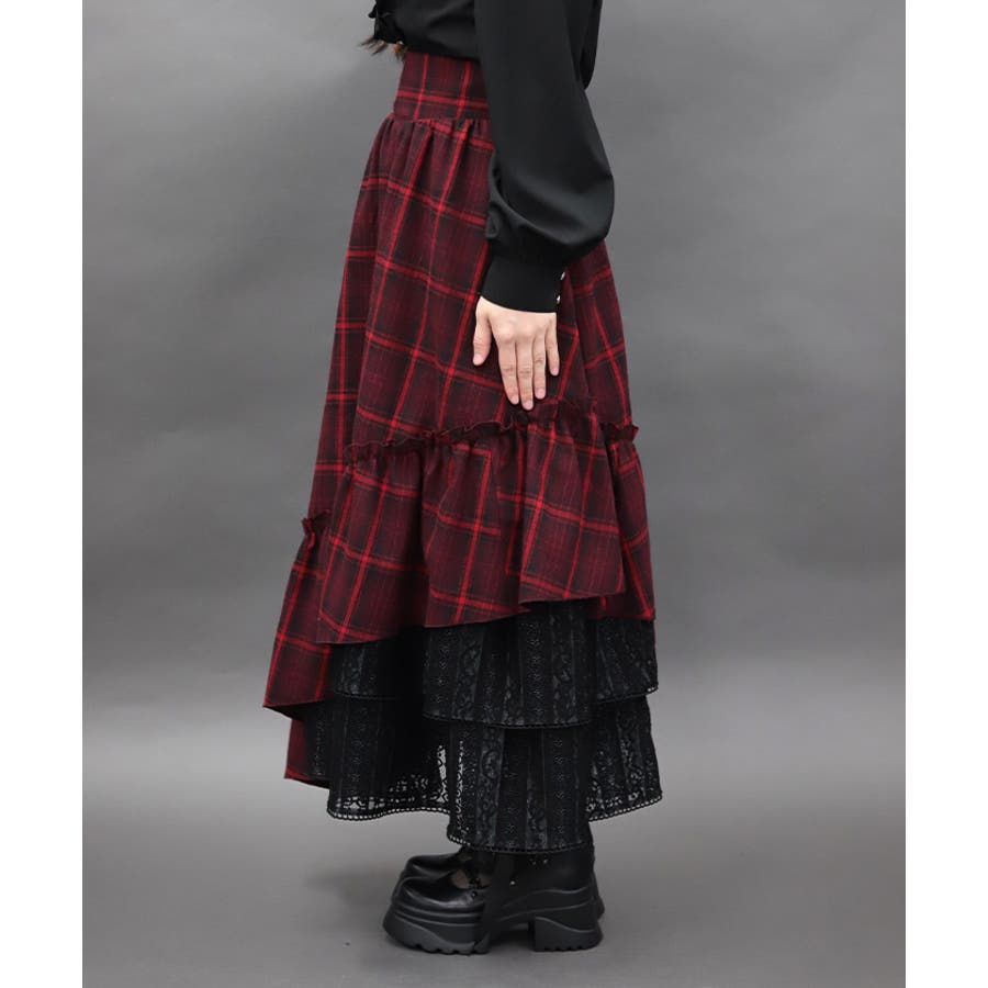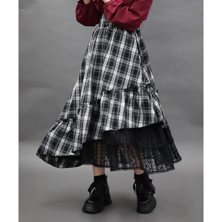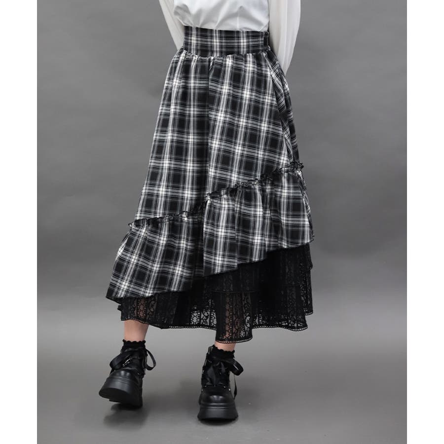 チェック×レースを使用したアシメデザインのティアードスカートです。
