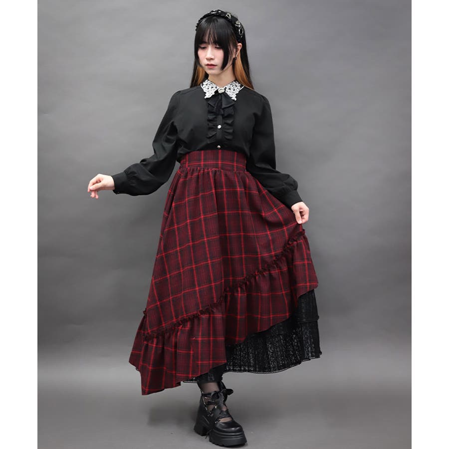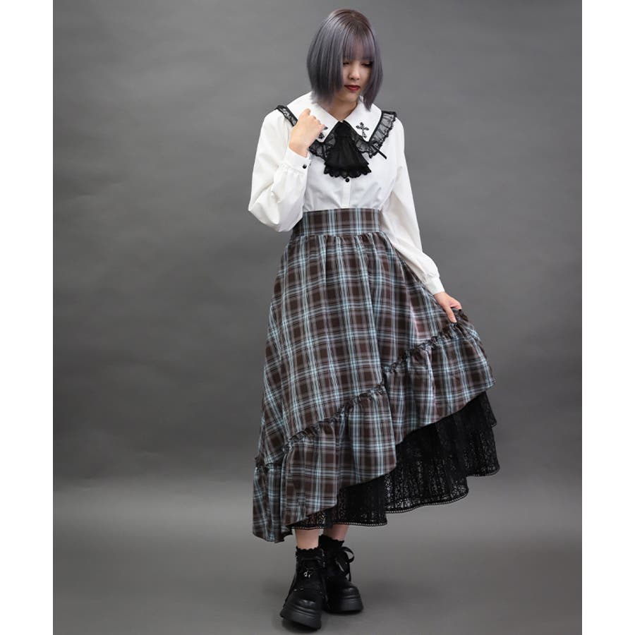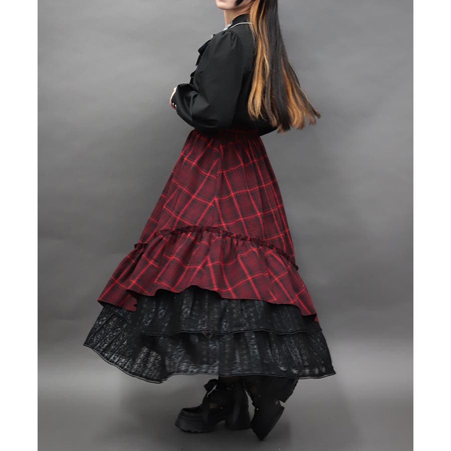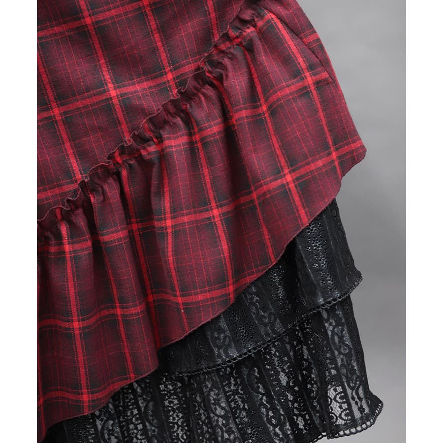チェック×レースを使用したアシメデザインのティアードスカートです。
