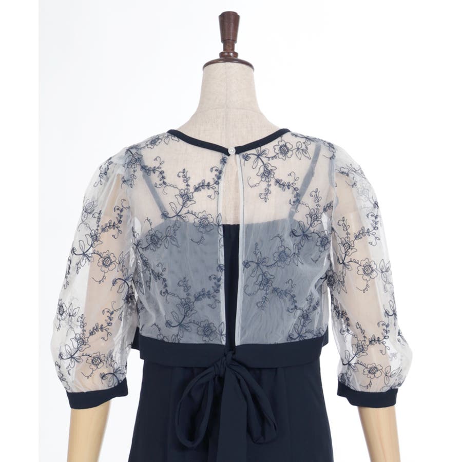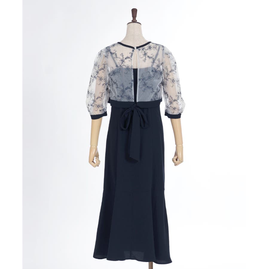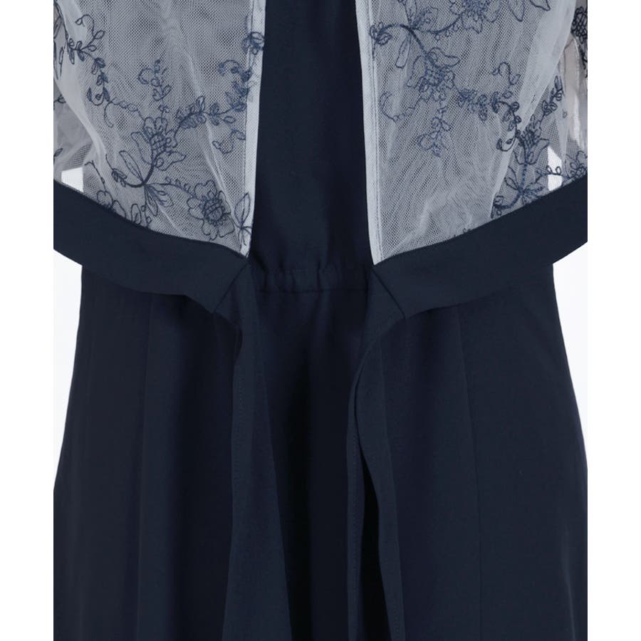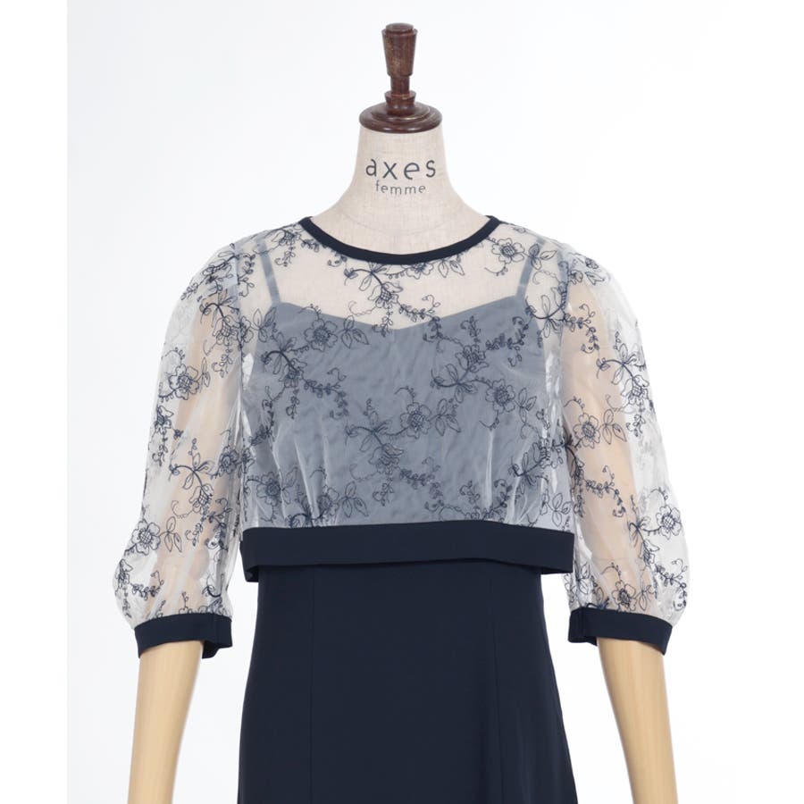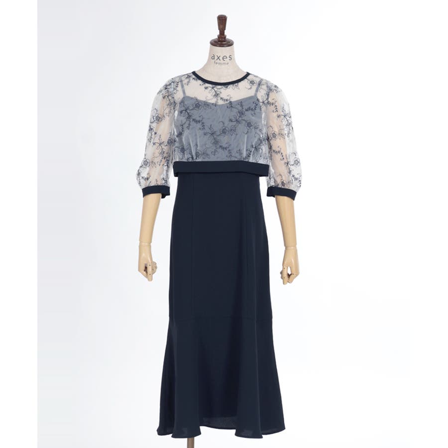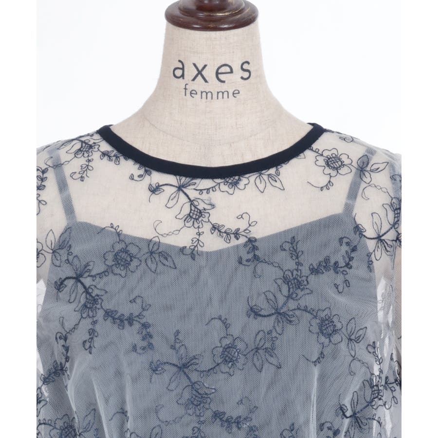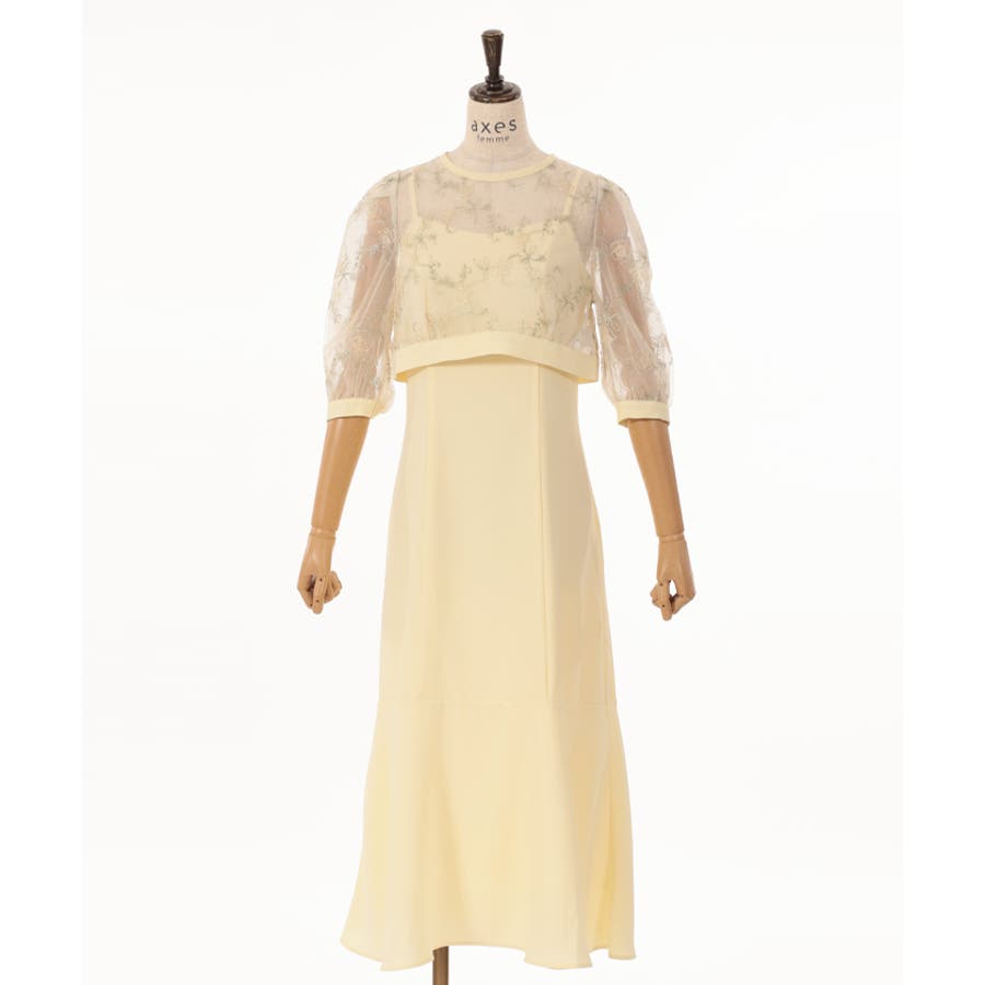 繊細なチュールレースのトップスとシンプルなキャミワンピースがセットになったアイテム。裾の切り替えが広がりすぎないエレガントなシルエットに。