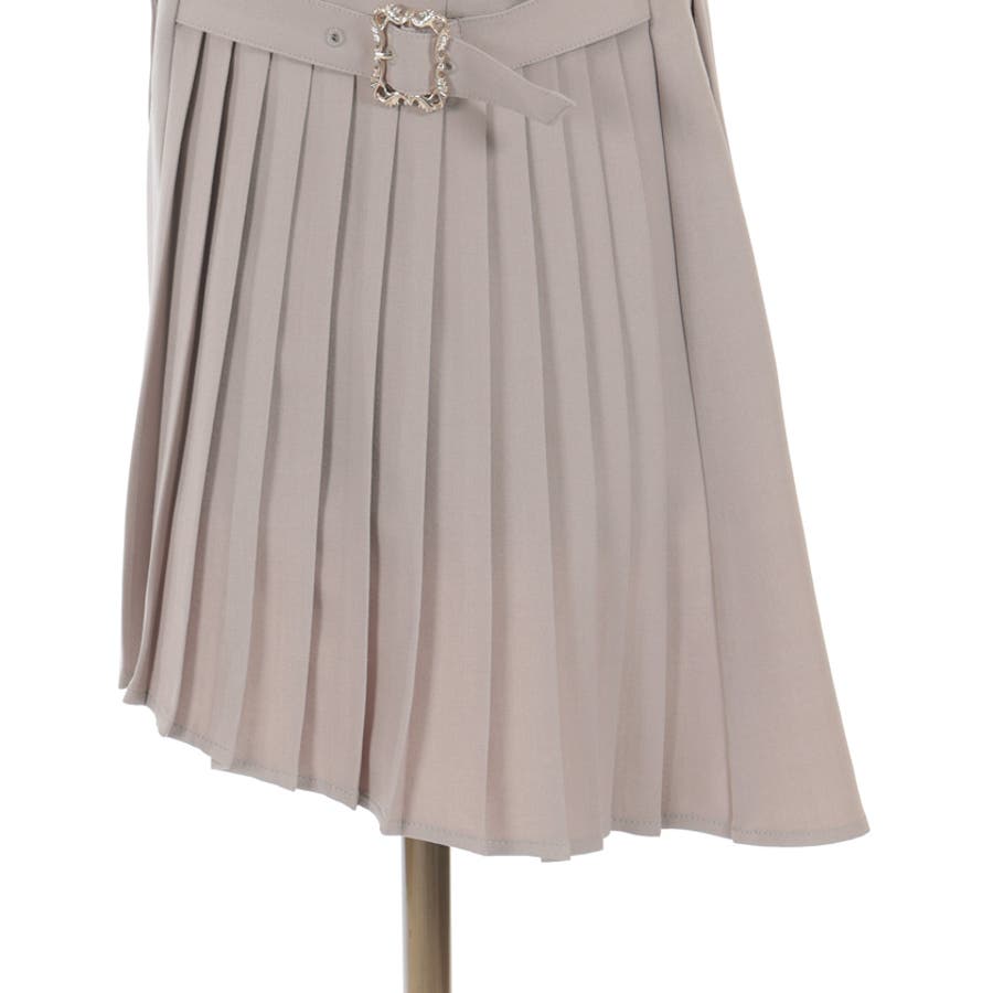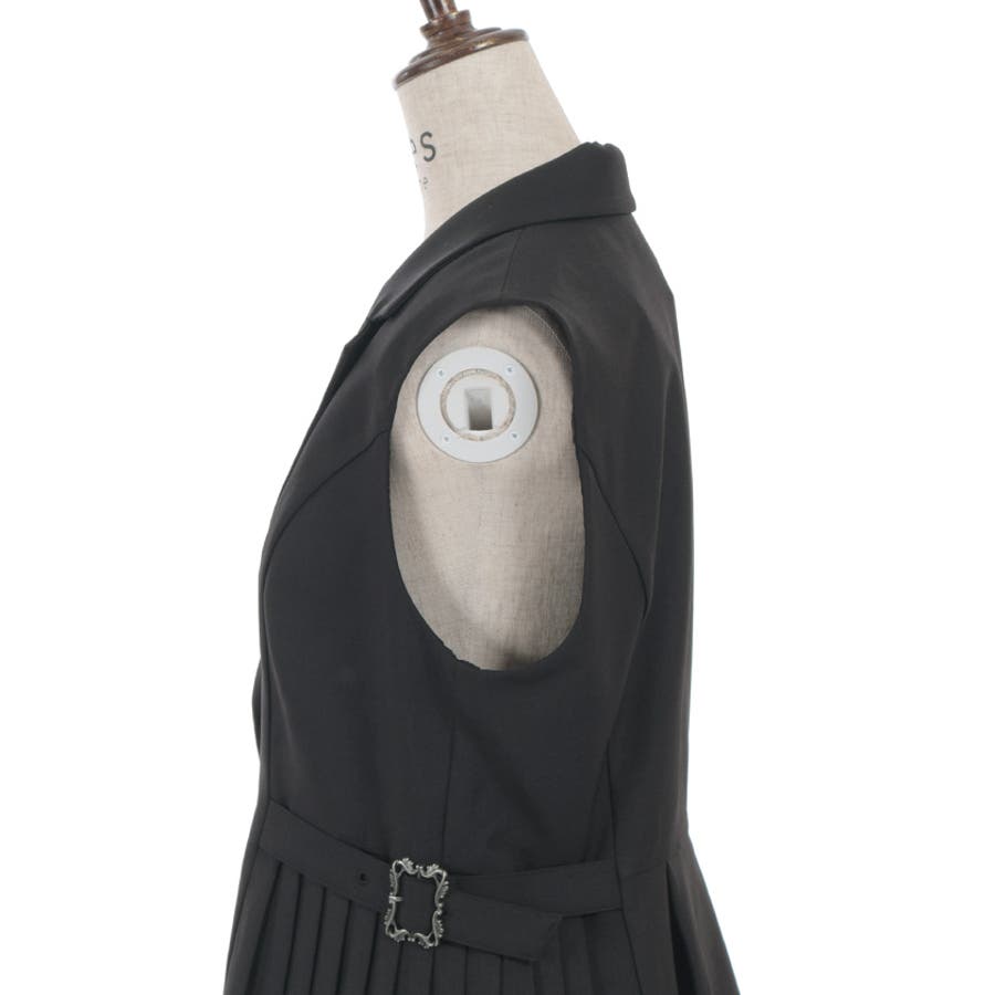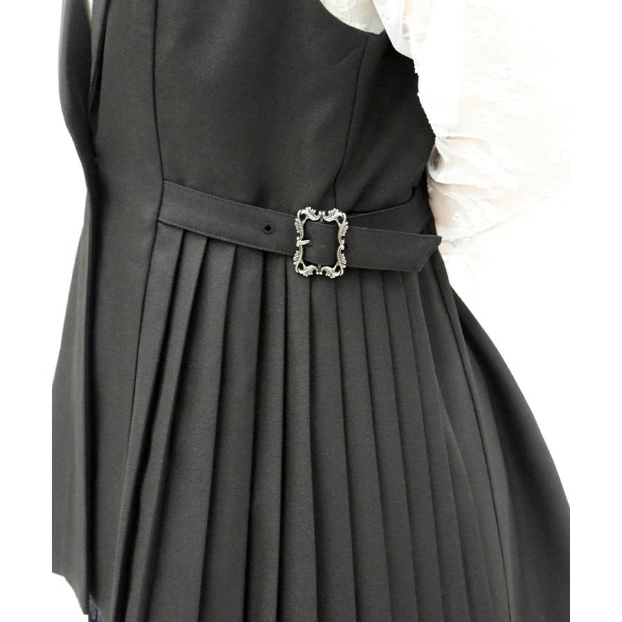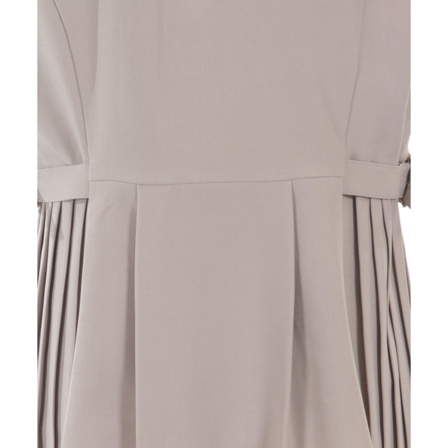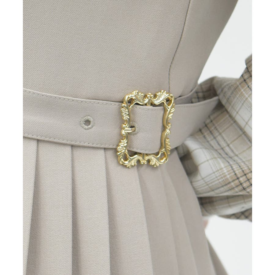 サイドプリーツのすっきりした縦ラインのシルエットに、装飾バックルがアンティークな雰囲気なワンポイントデザイン。