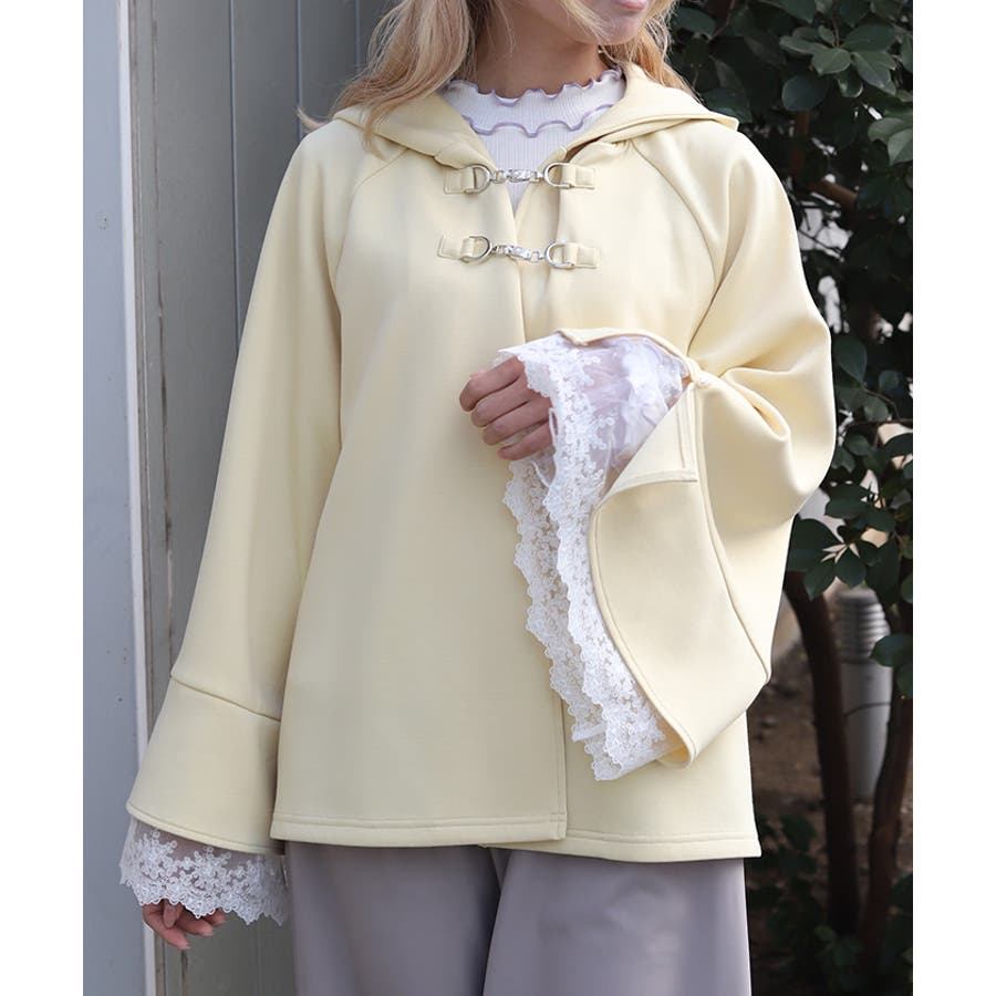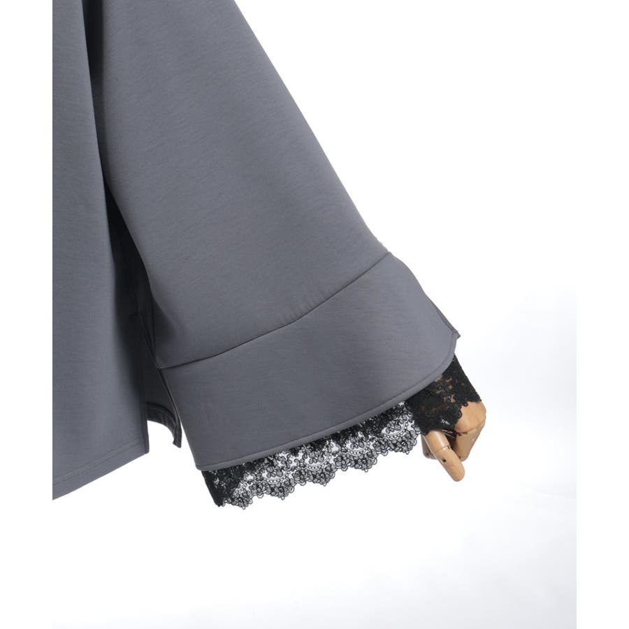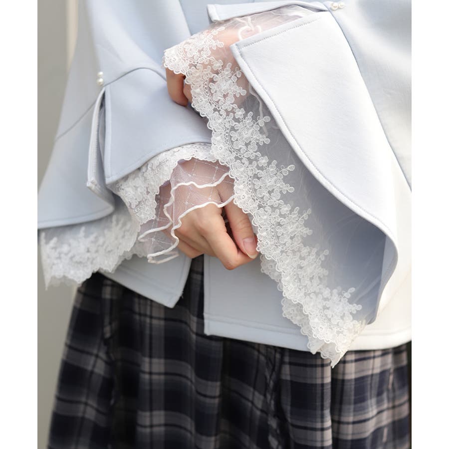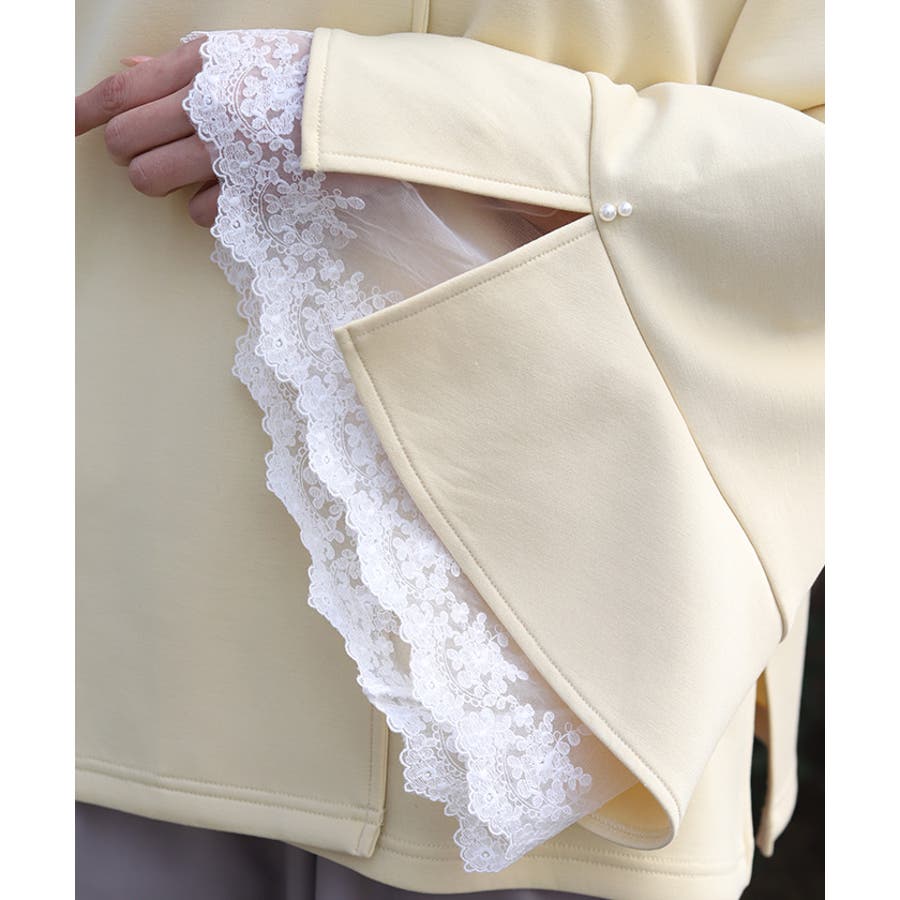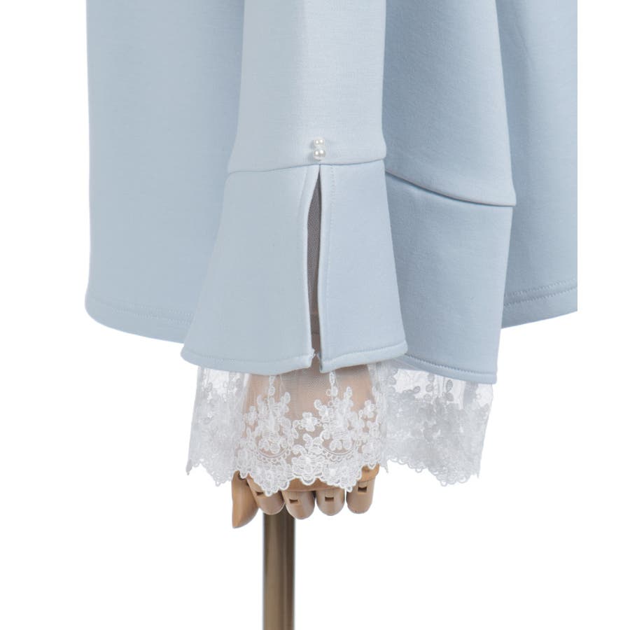 フレア展開のふわっと広がるベルスリーブから、繊細なチュール刺繍レースが覗くデザイン。