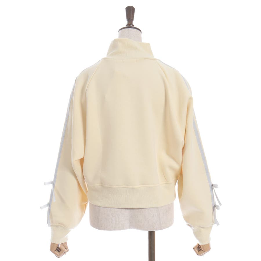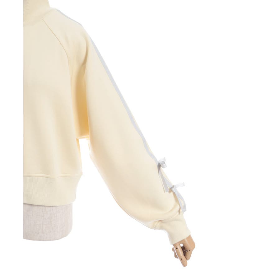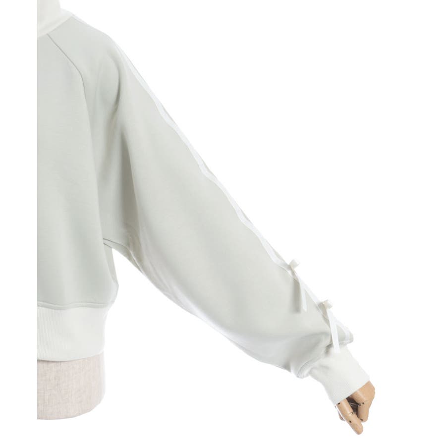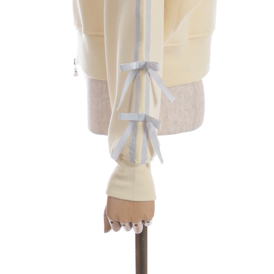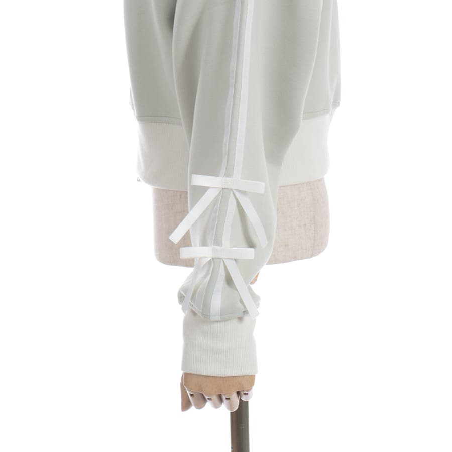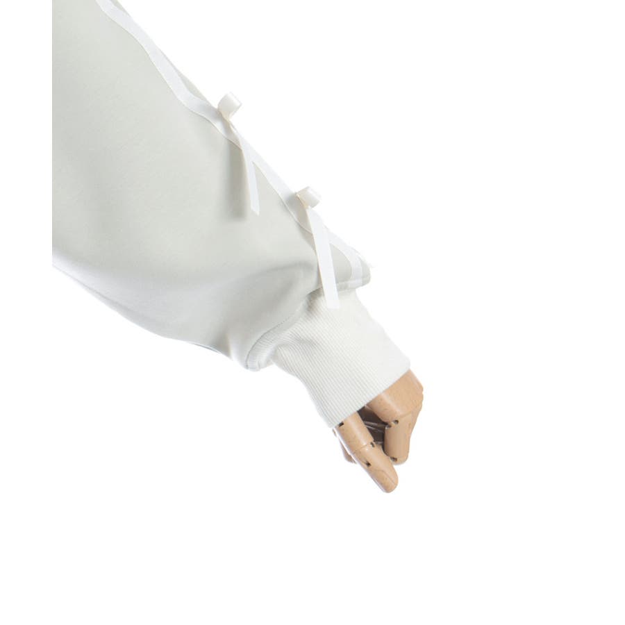 袖のライン×リボンディティールがワンポイントです。ふっくらとしたやわらかく優しい手触りが魅力的なアイテム。
