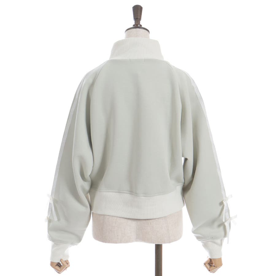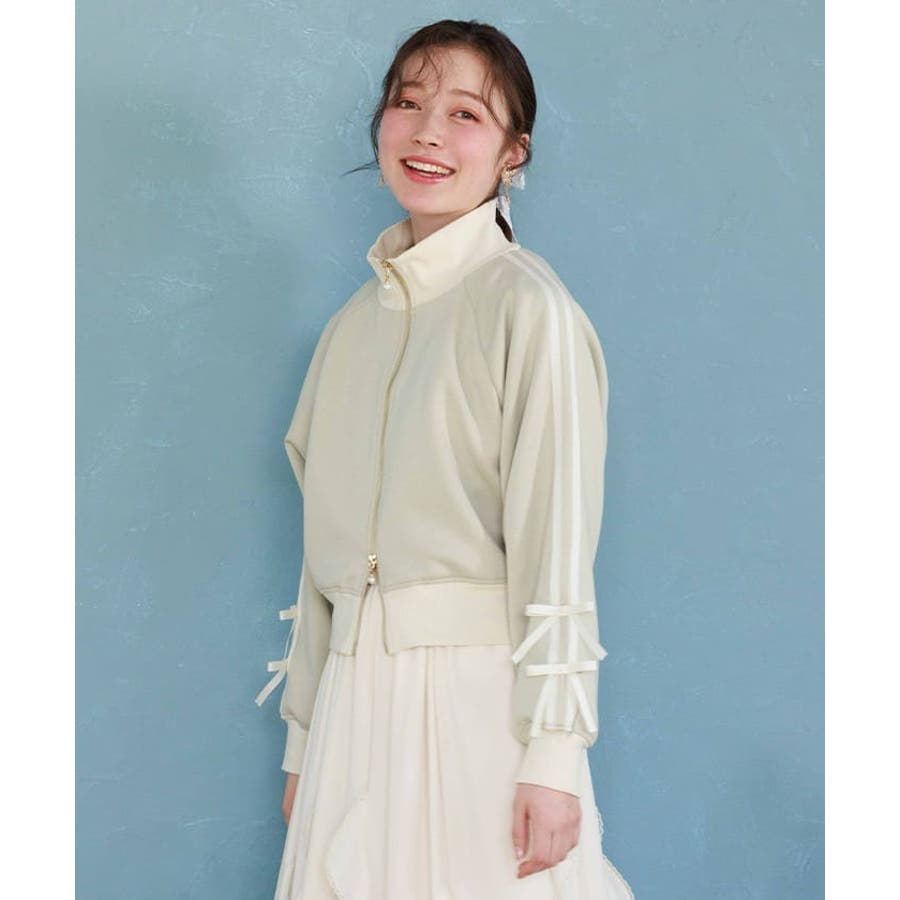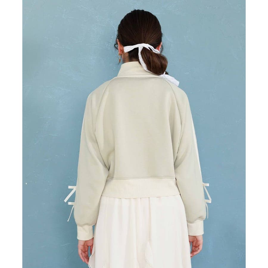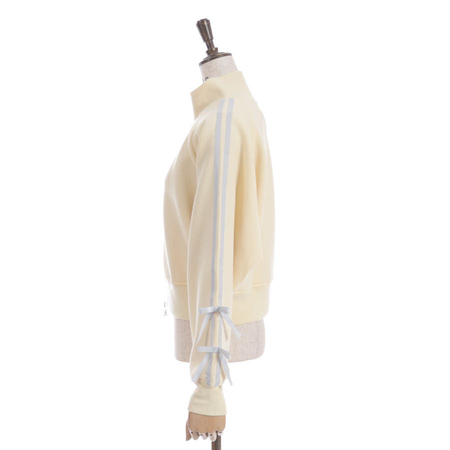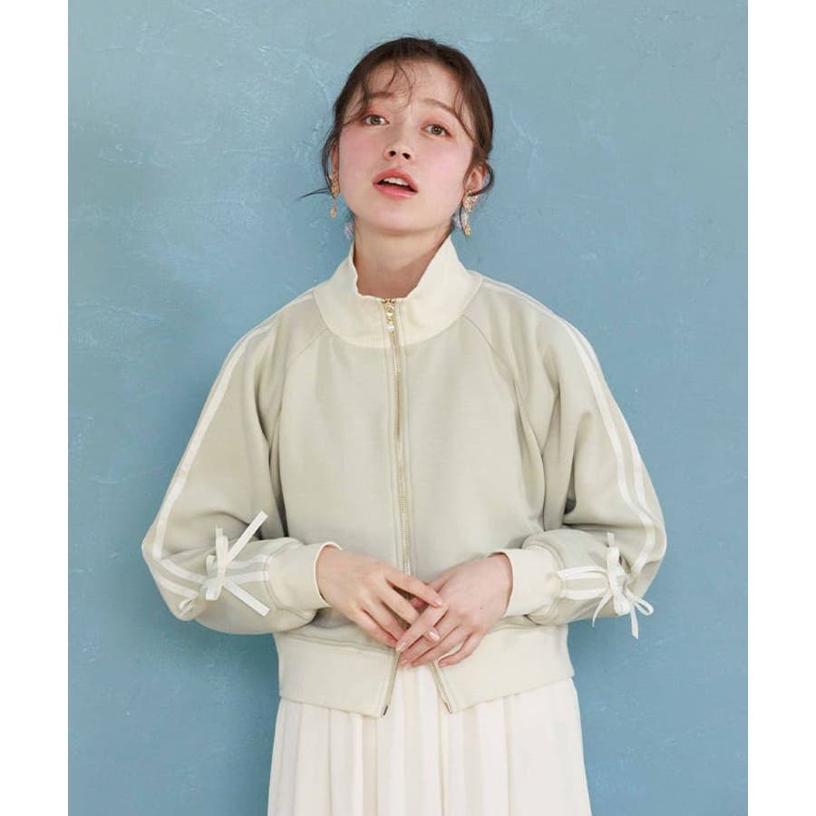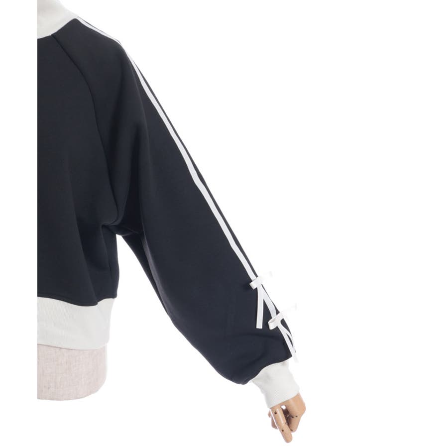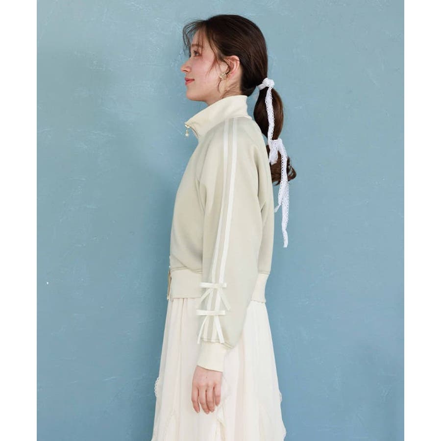 袖のライン×リボンディティールがワンポイントです。ふっくらとしたやわらかく優しい手触りが魅力的なアイテム。