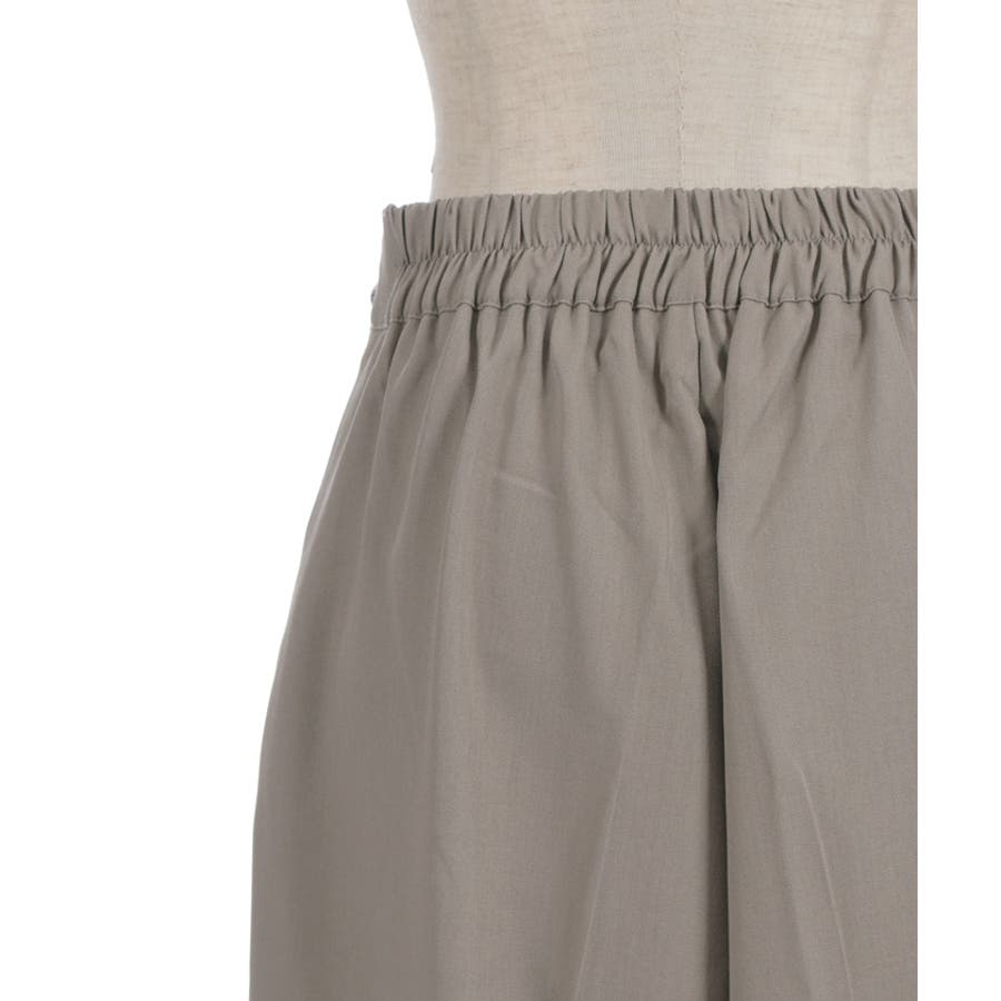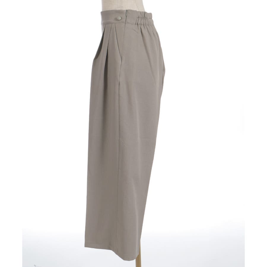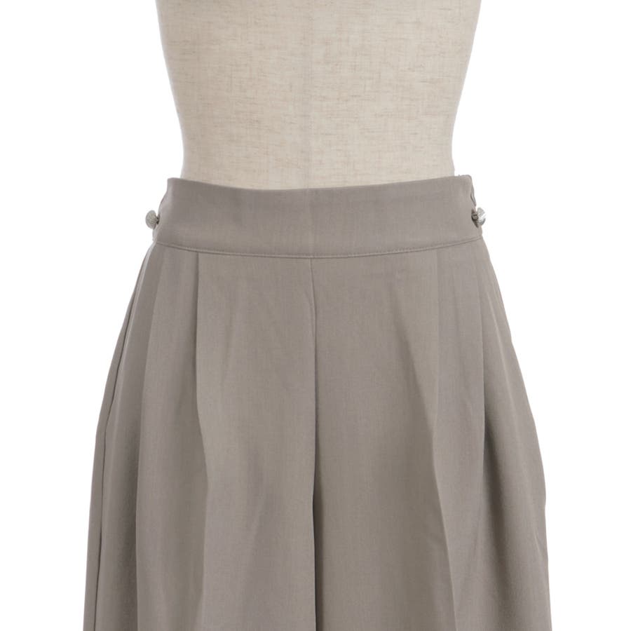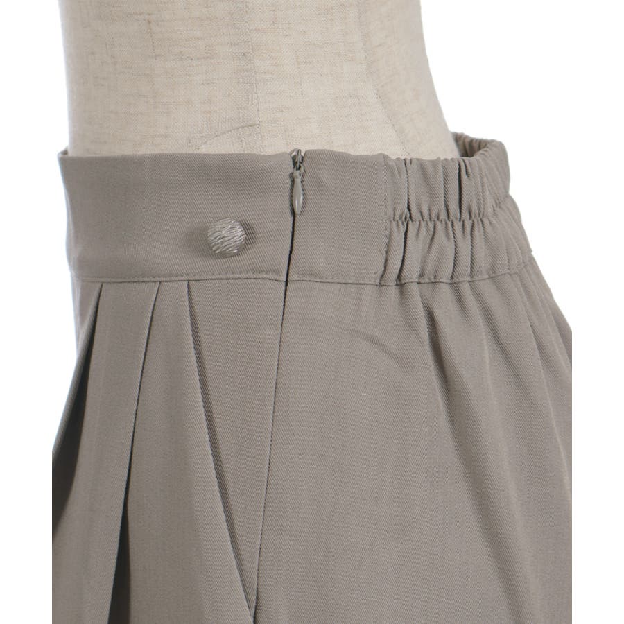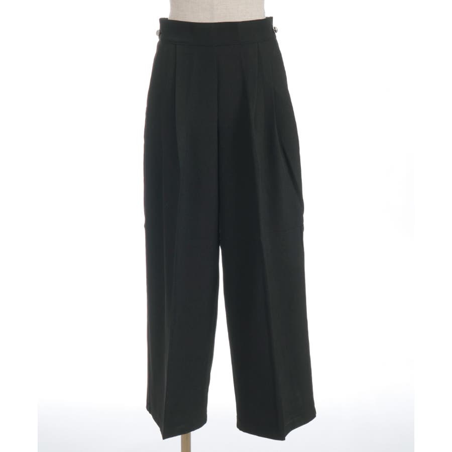 フロントに入れたタックが腰まわりをすっきり見せ、落ち感のあるシルエットで上品に仕上げています。サイドボタンがさりげないアクセントになり、シンプルな中にもデザイン性を感じられる一着です。