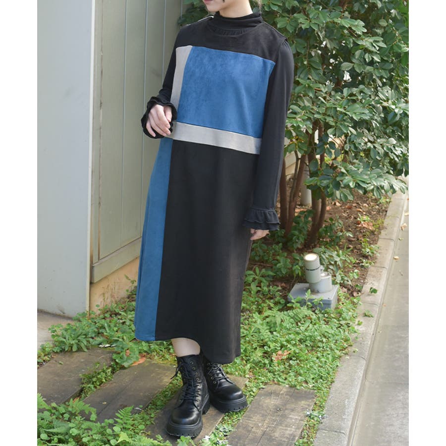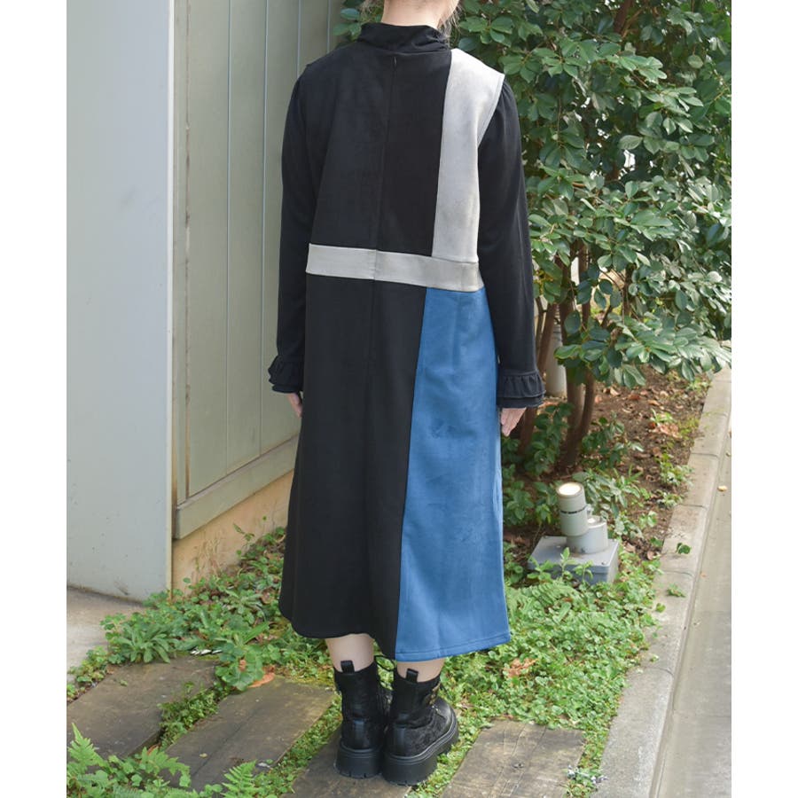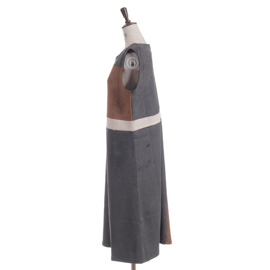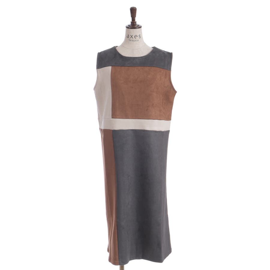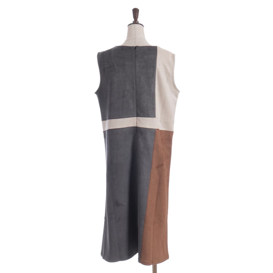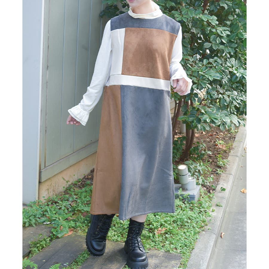 スエード調素材を使用した配色デザインのワンピース。異なるカラーの組み合わせがアクセントとなり、シンプルながらも存在感のあるスタイルを楽しめる一枚です。