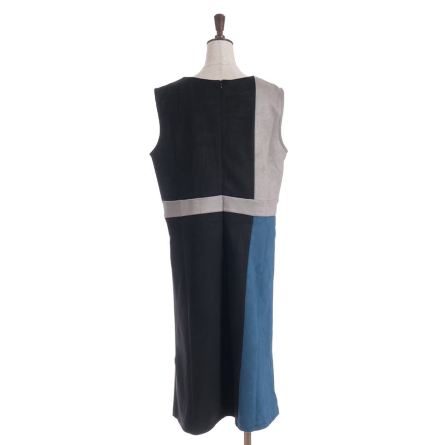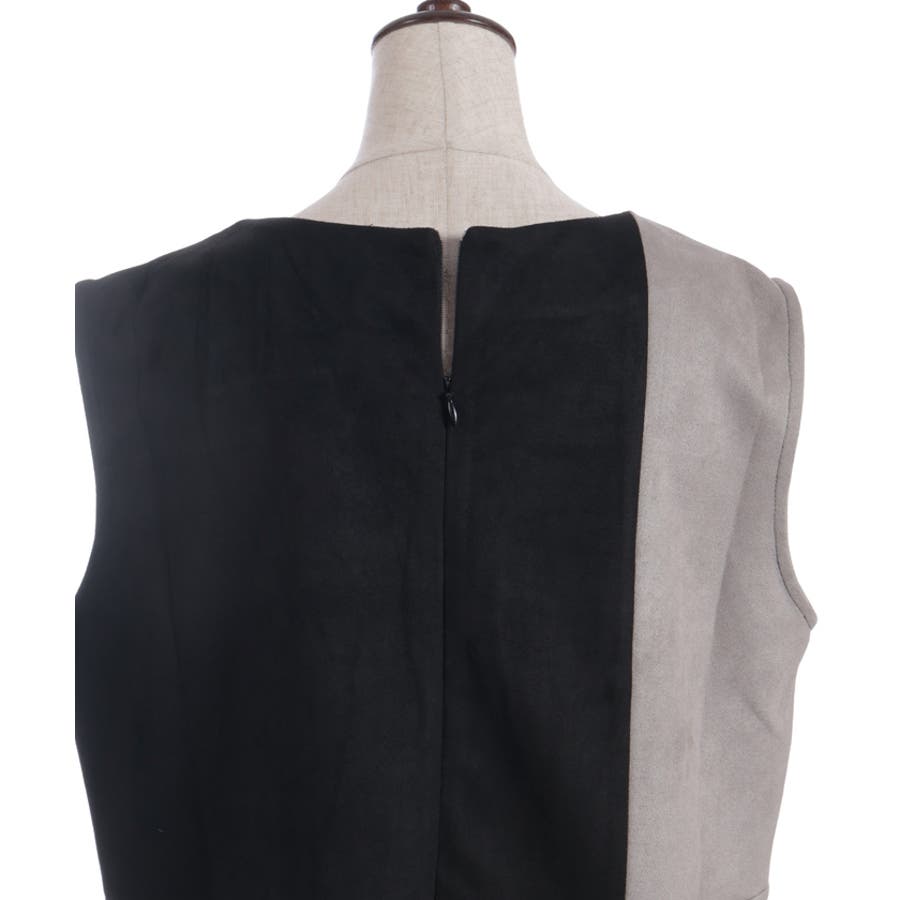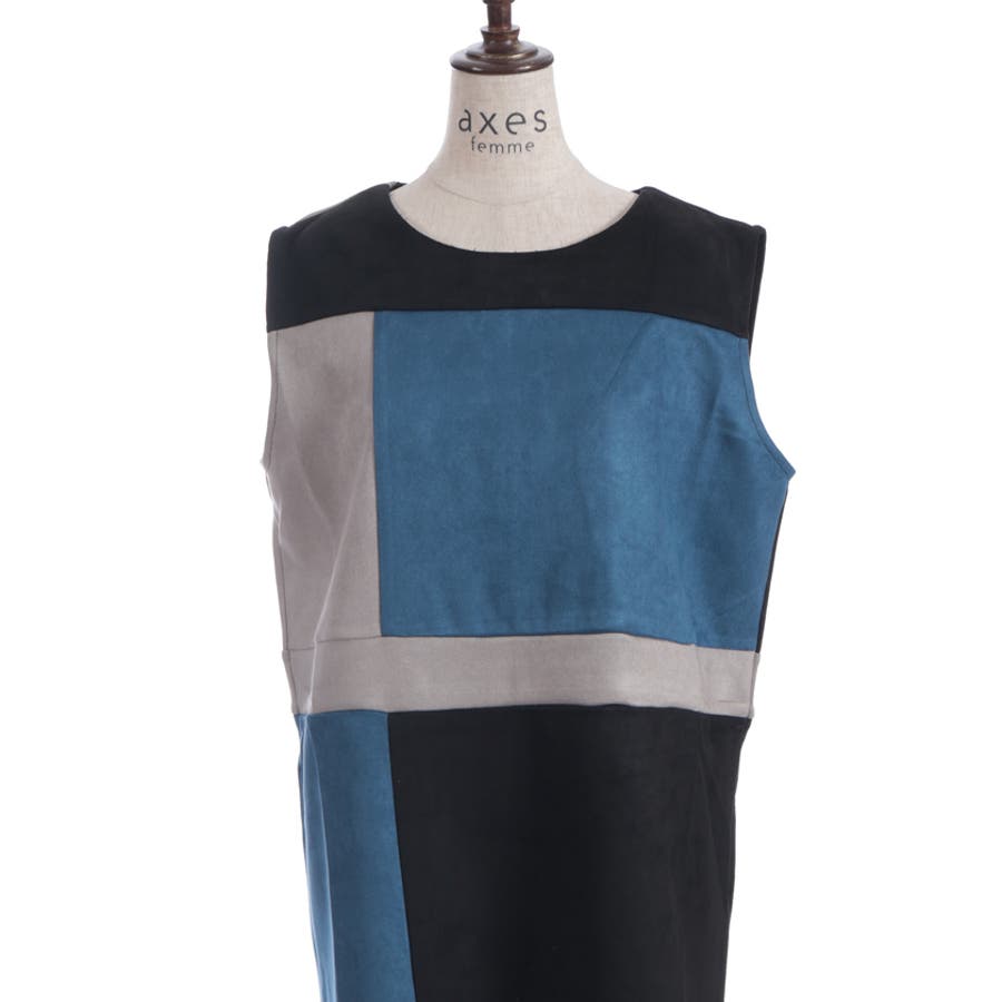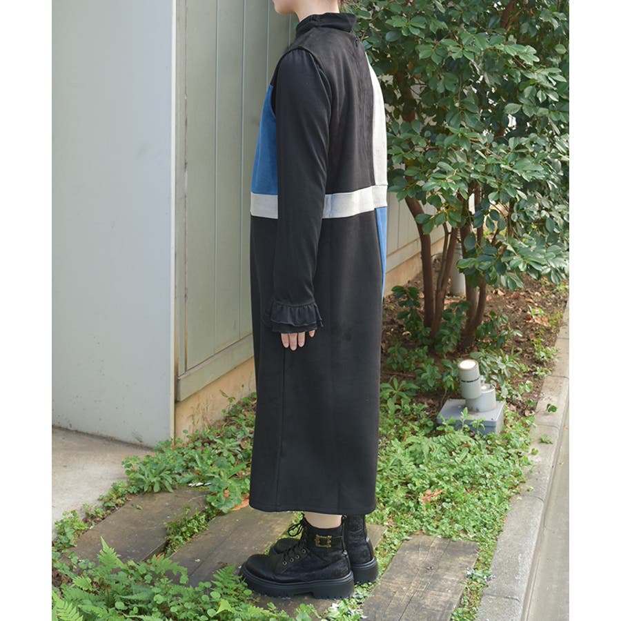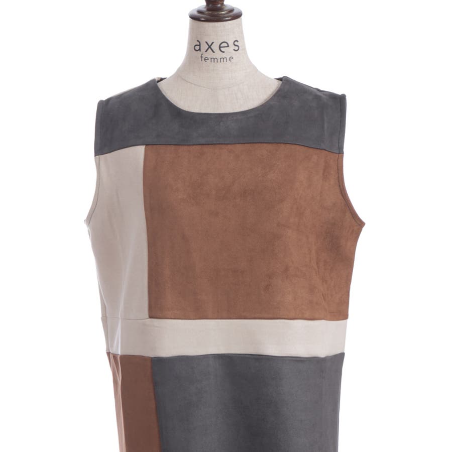 スエード調素材を使用した配色デザインのワンピース。異なるカラーの組み合わせがアクセントとなり、シンプルながらも存在感のあるスタイルを楽しめる一枚です。