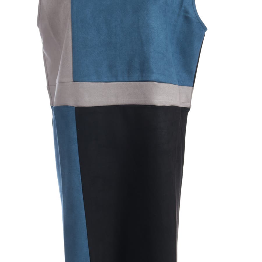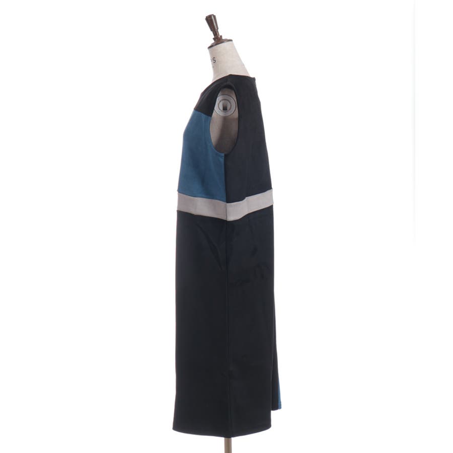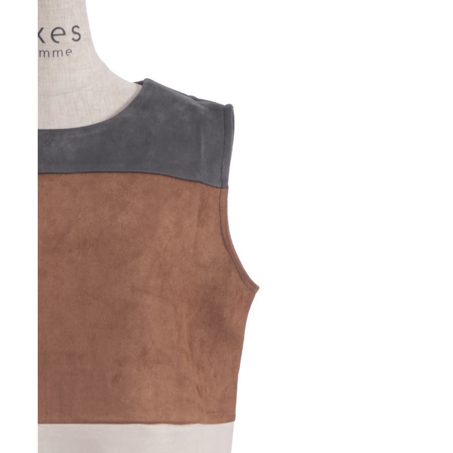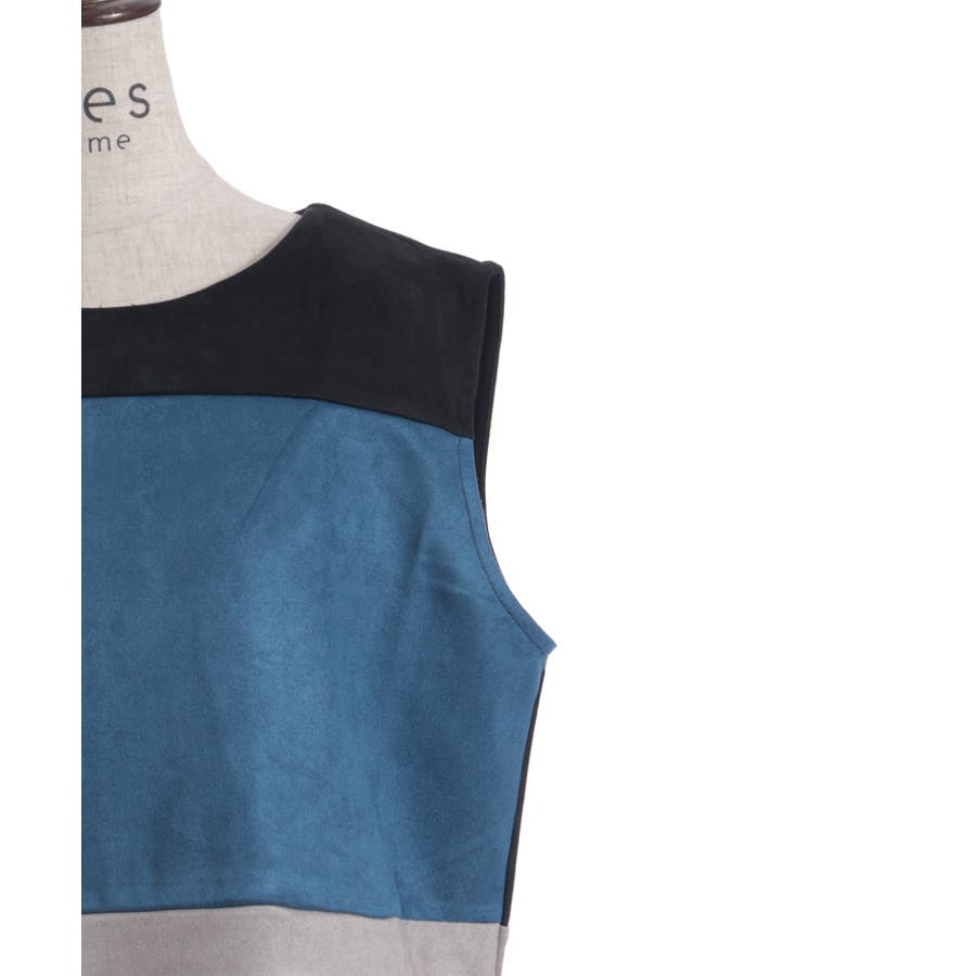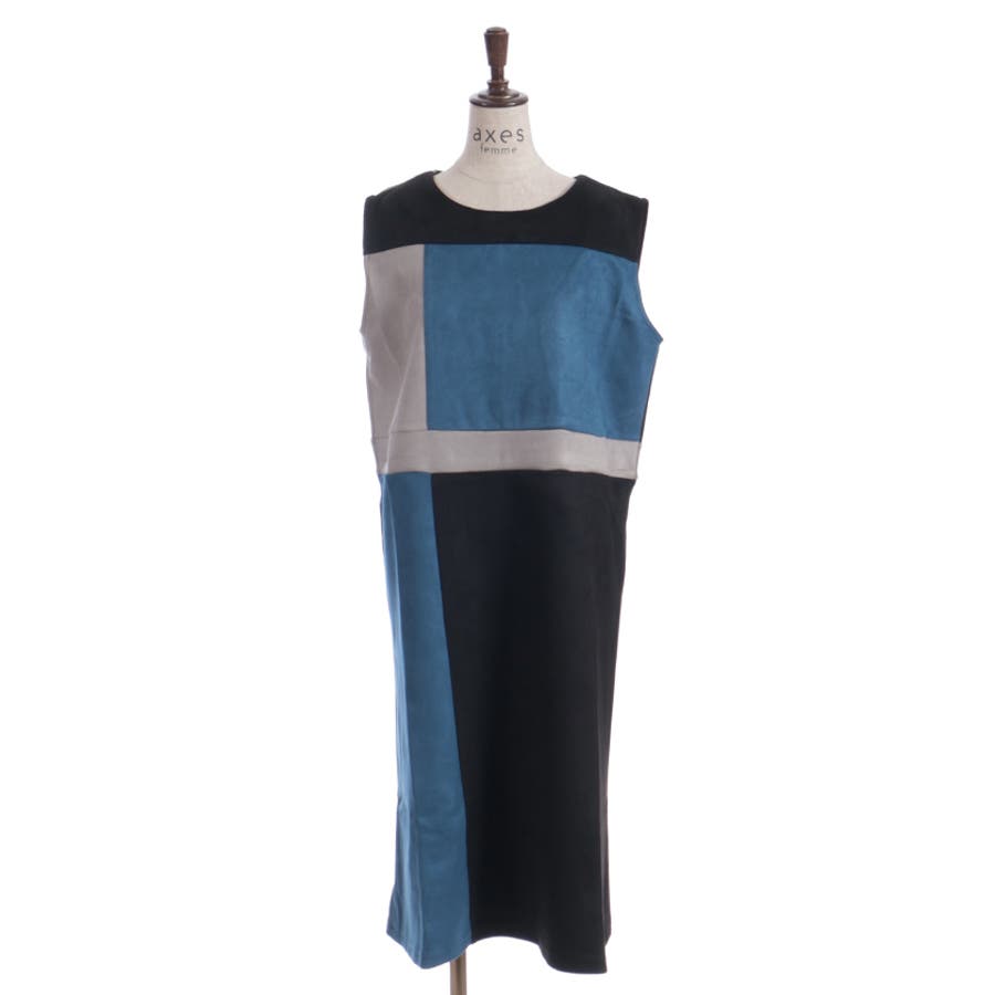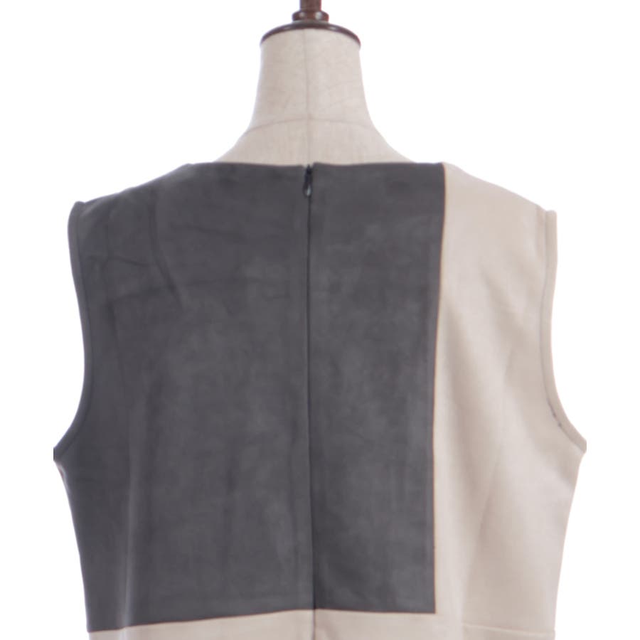 スエード調素材を使用した配色デザインのワンピース。異なるカラーの組み合わせがアクセントとなり、シンプルながらも存在感のあるスタイルを楽しめる一枚です。
