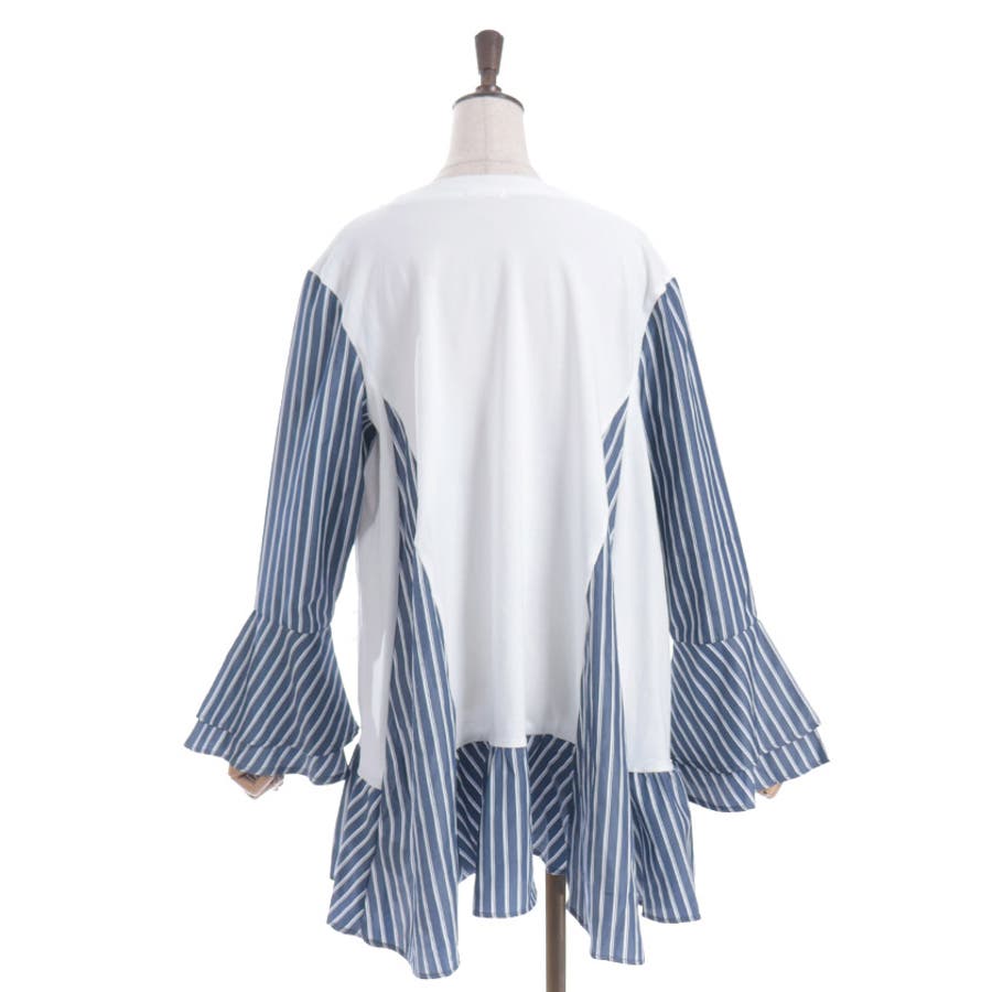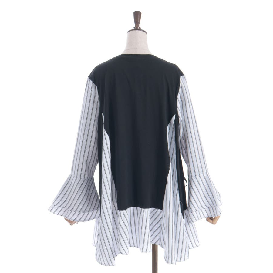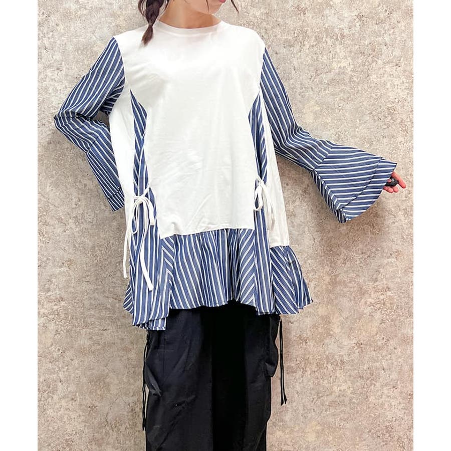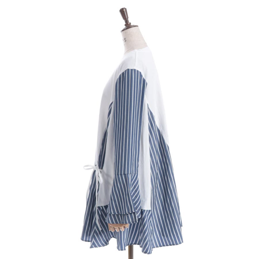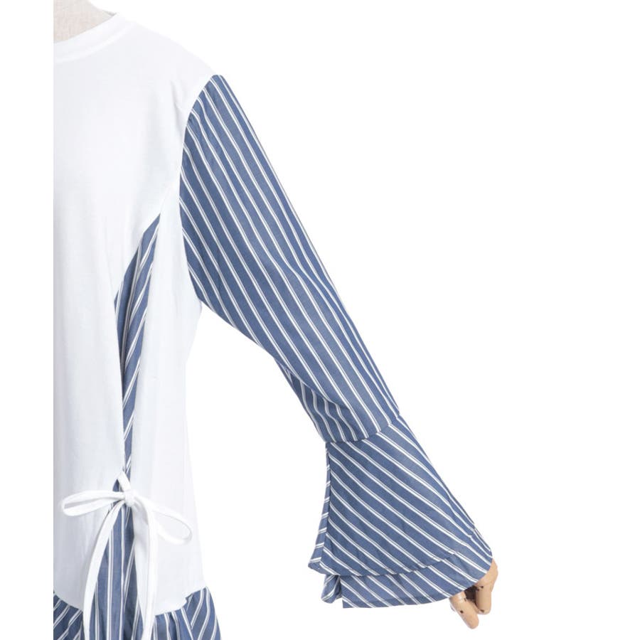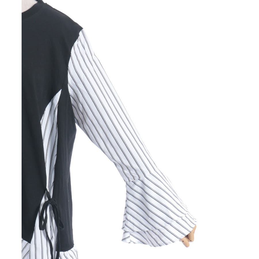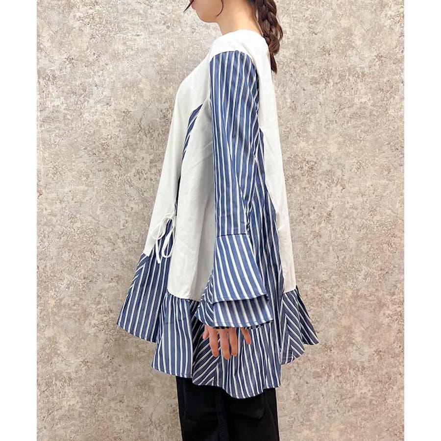 ボディ部分はシンプルなデザインで、袖や裾部分にストライプ柄が施されているため、バランスが取れた印象を与えます。袖のフレア感が女性らしさを引き立て、動きのあるシルエットを作り出します。