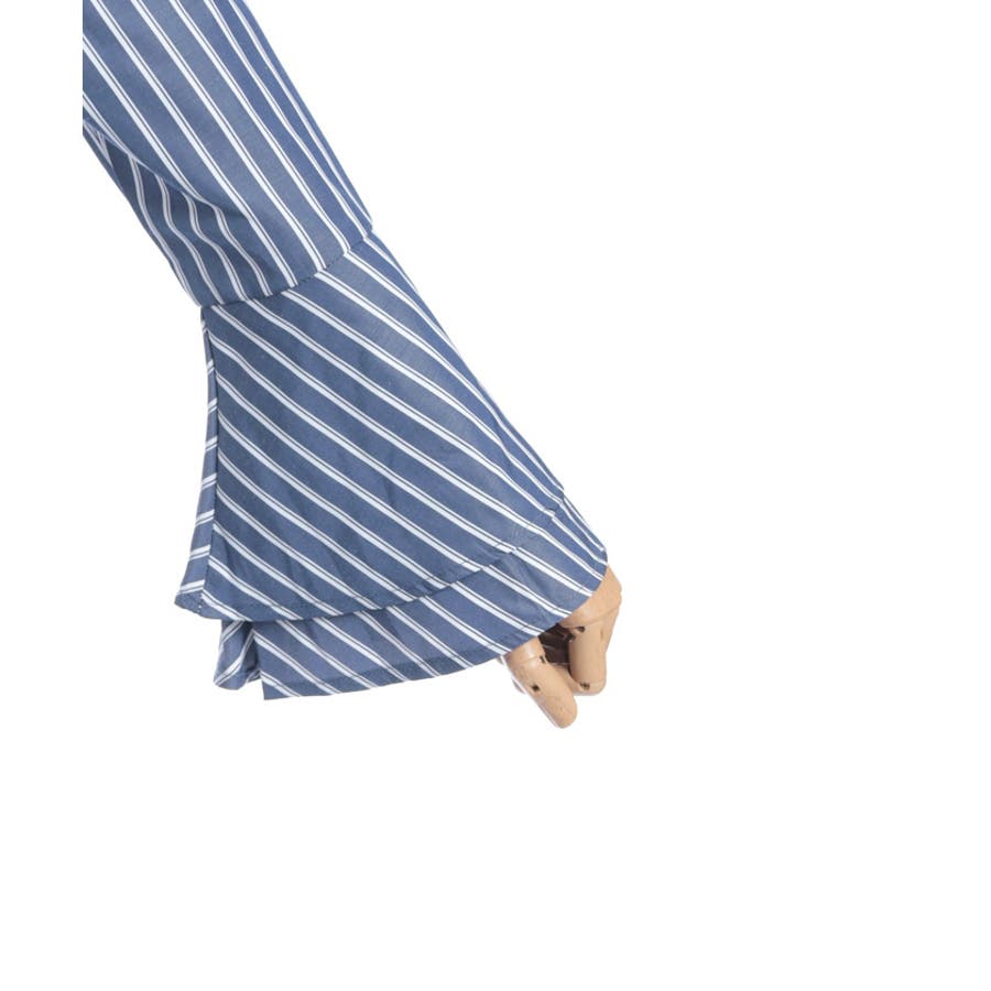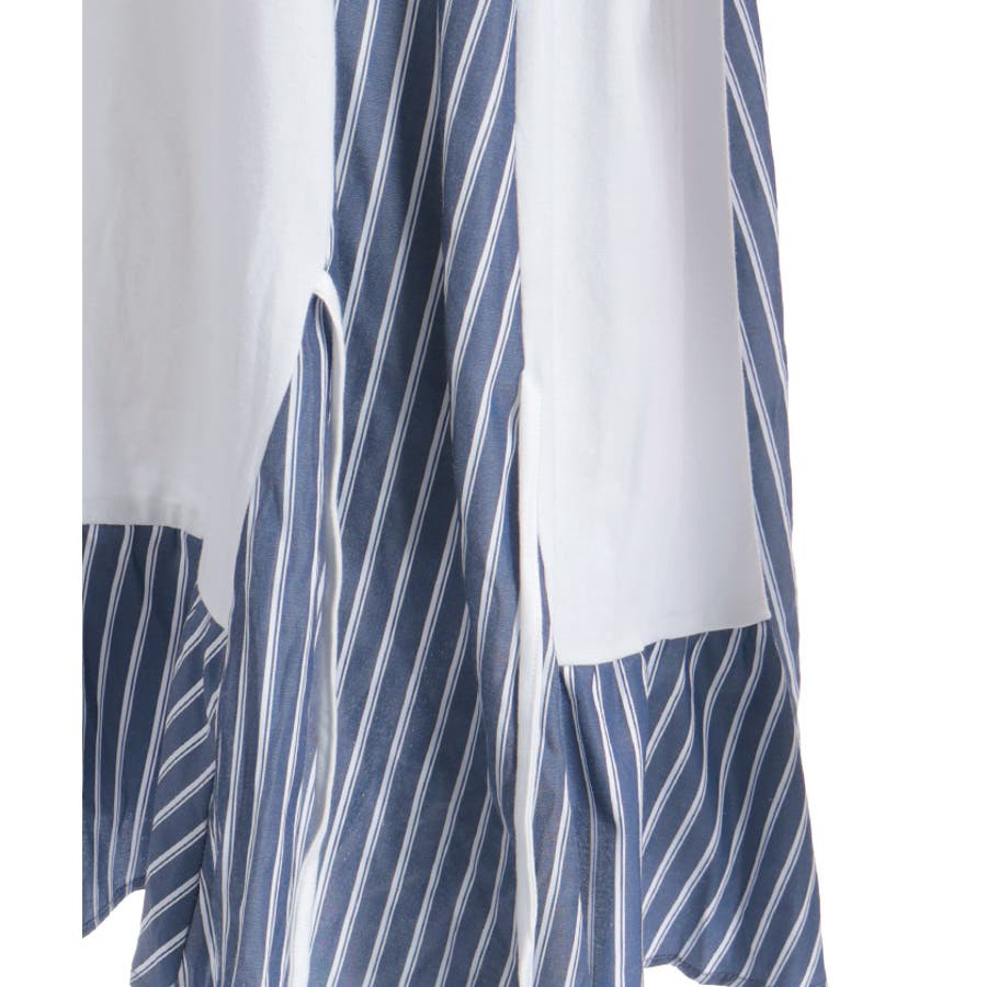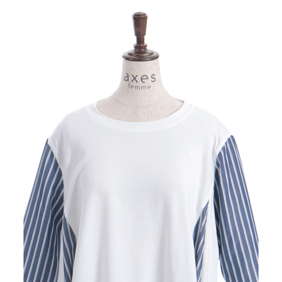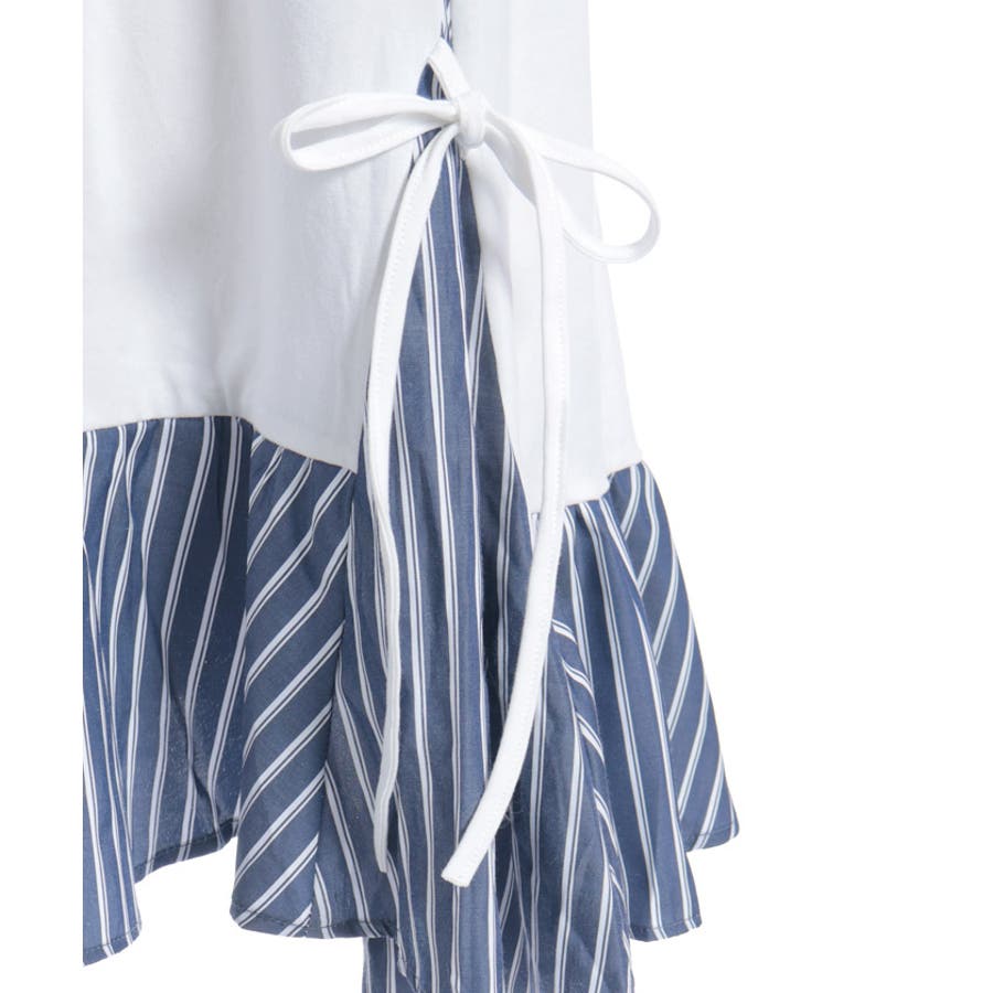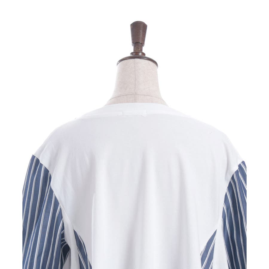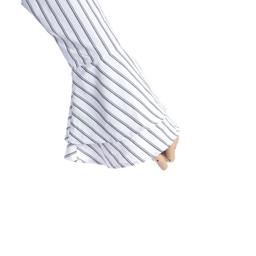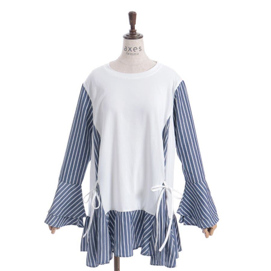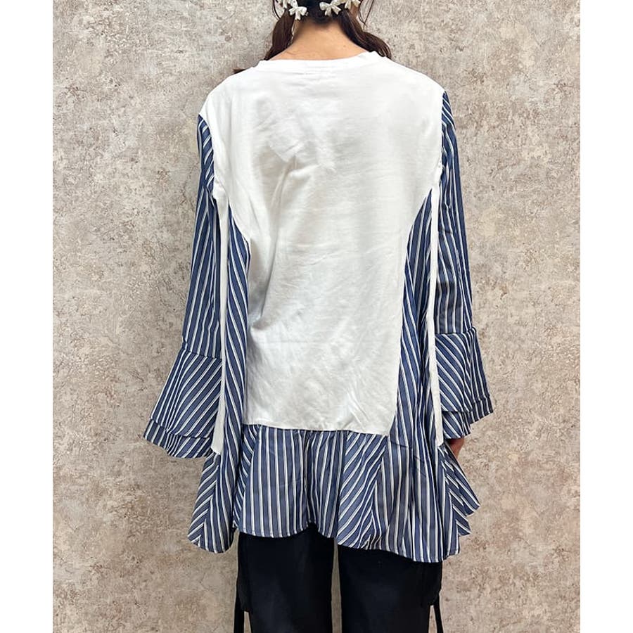 ボディ部分はシンプルなデザインで、袖や裾部分にストライプ柄が施されているため、バランスが取れた印象を与えます。袖のフレア感が女性らしさを引き立て、動きのあるシルエットを作り出します。