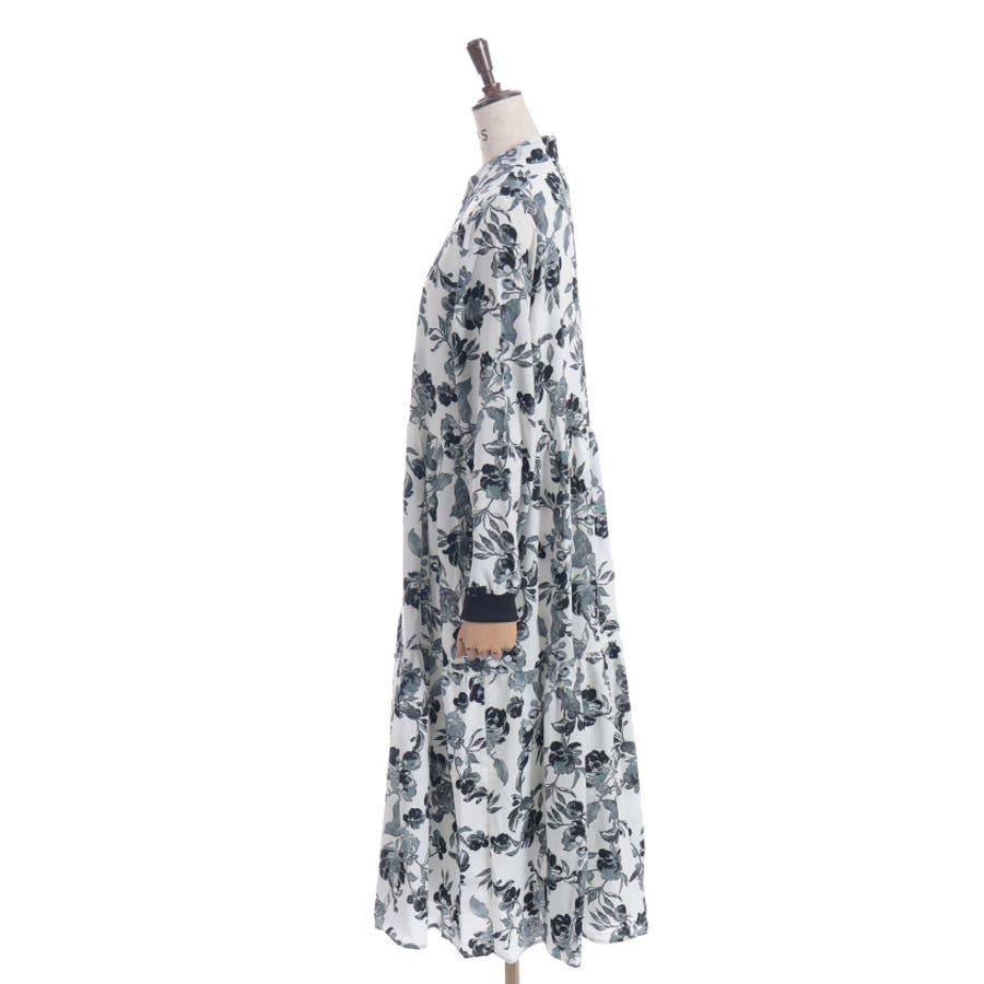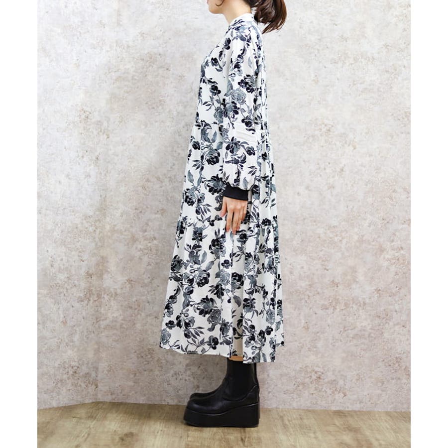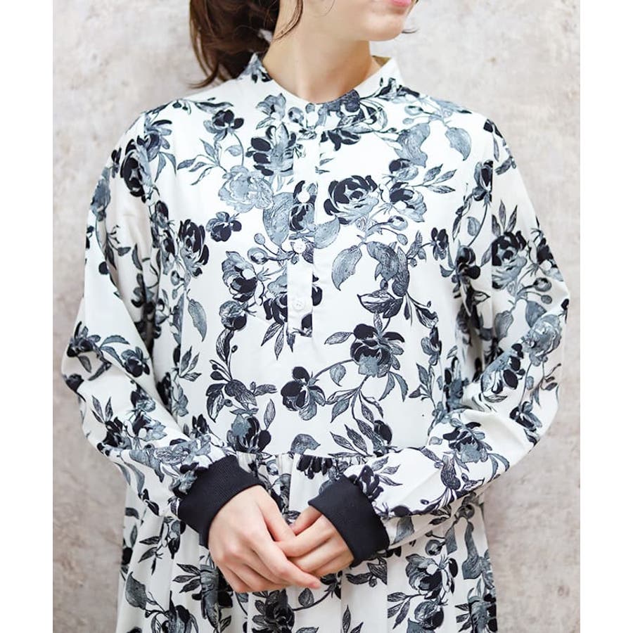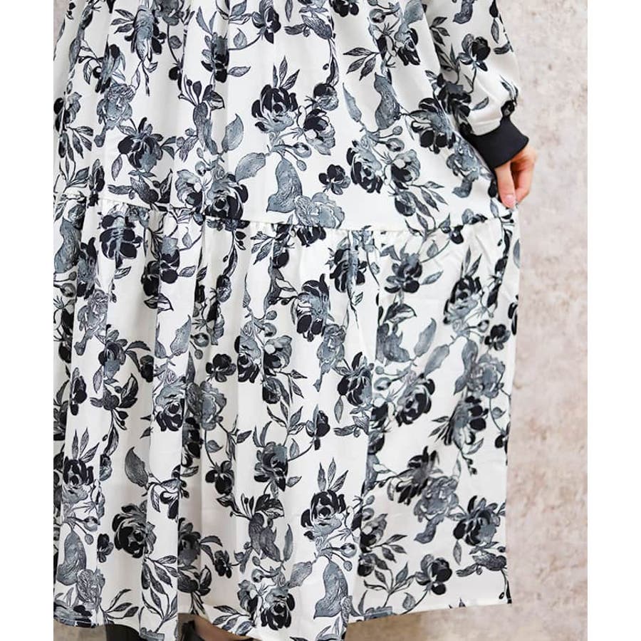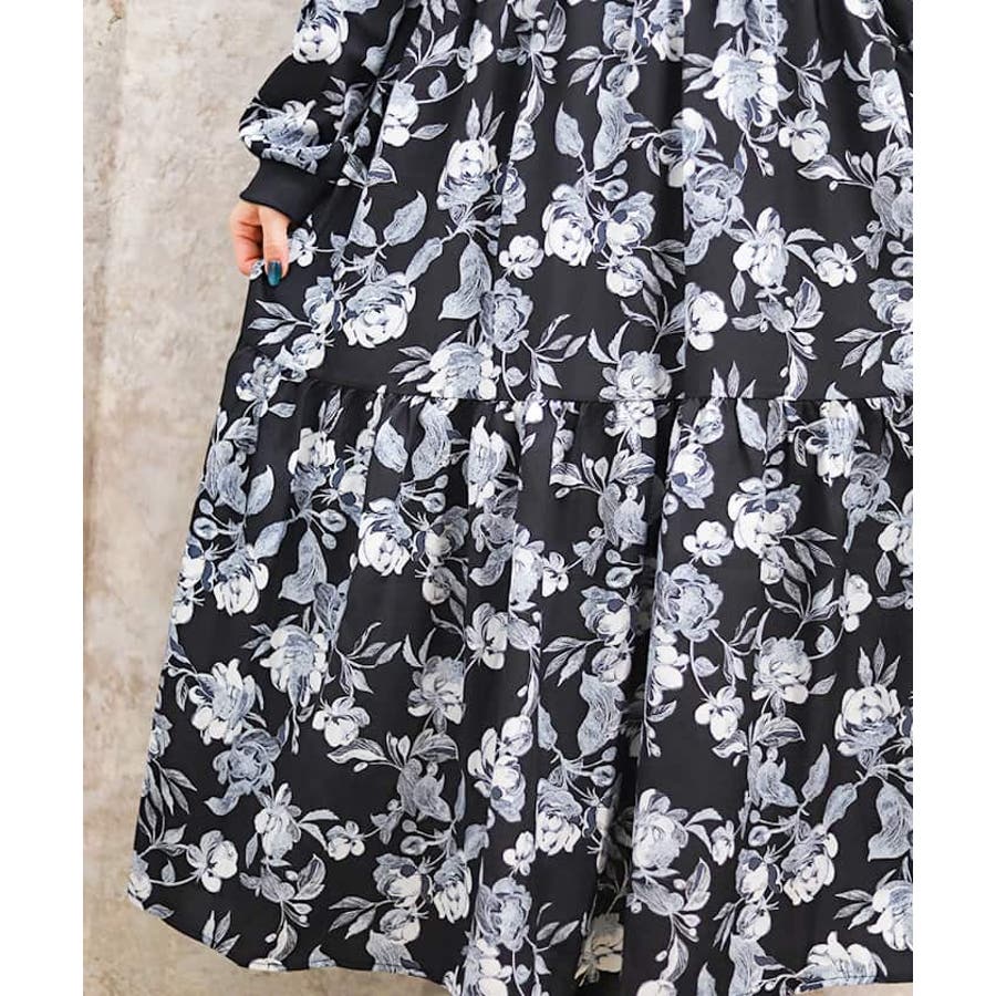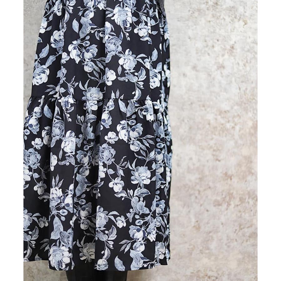 落ち着いたカラーに繊細な花柄が映えるデザイン。程よくゆとりのあるシルエットで、体のラインを拾いすぎず上品に着こなせます。ウエストにはさりげない切り替えが施され、スタイルアップ効果も期待できます。長めの丈感が大人っぽい雰囲気をプラスし、軽やかな動きを演出します。