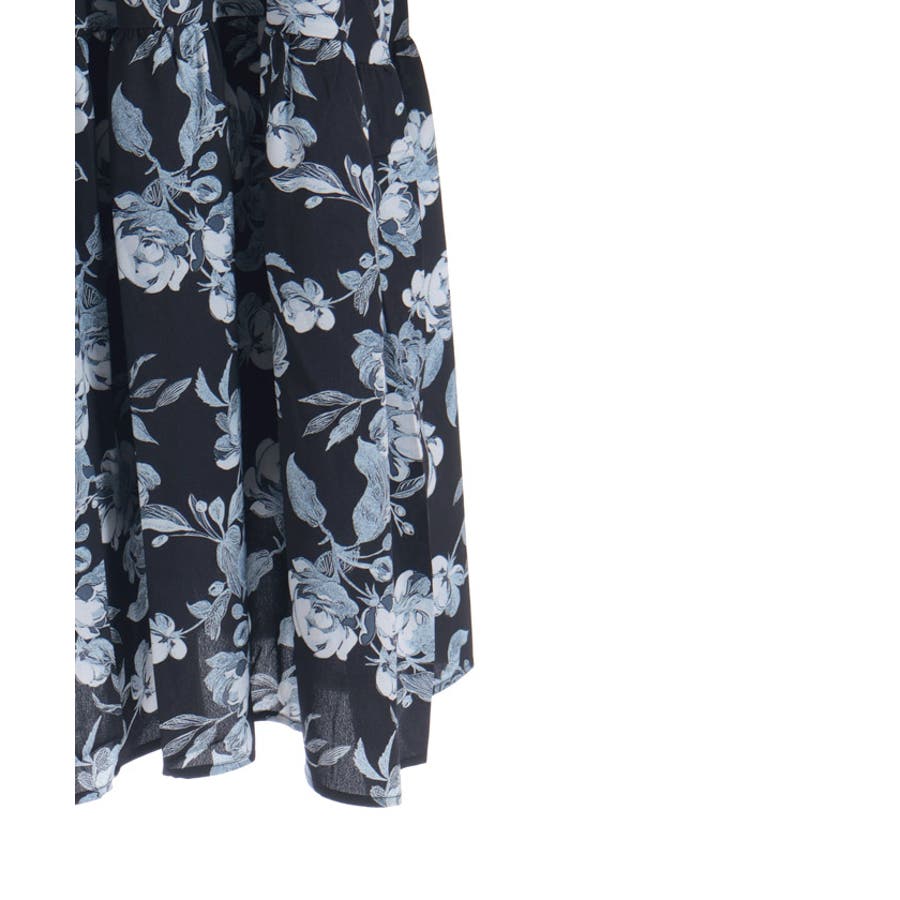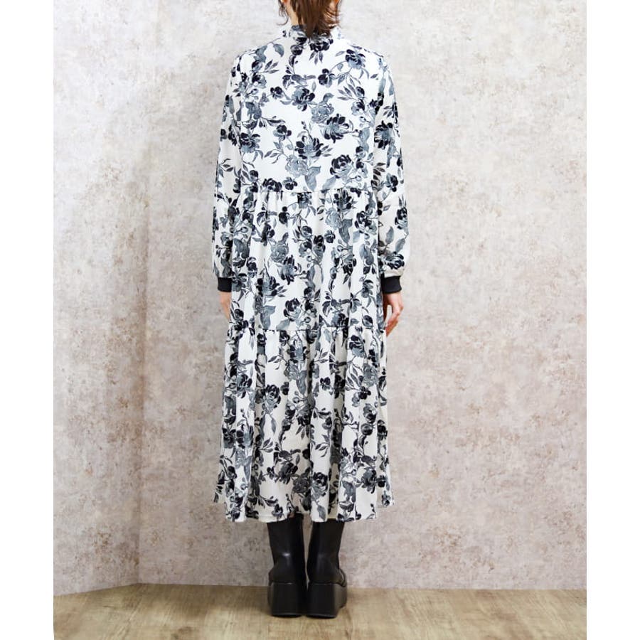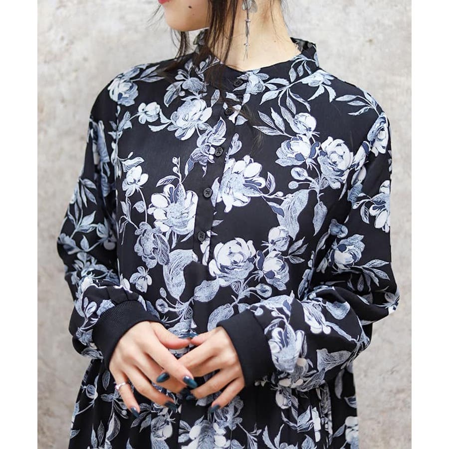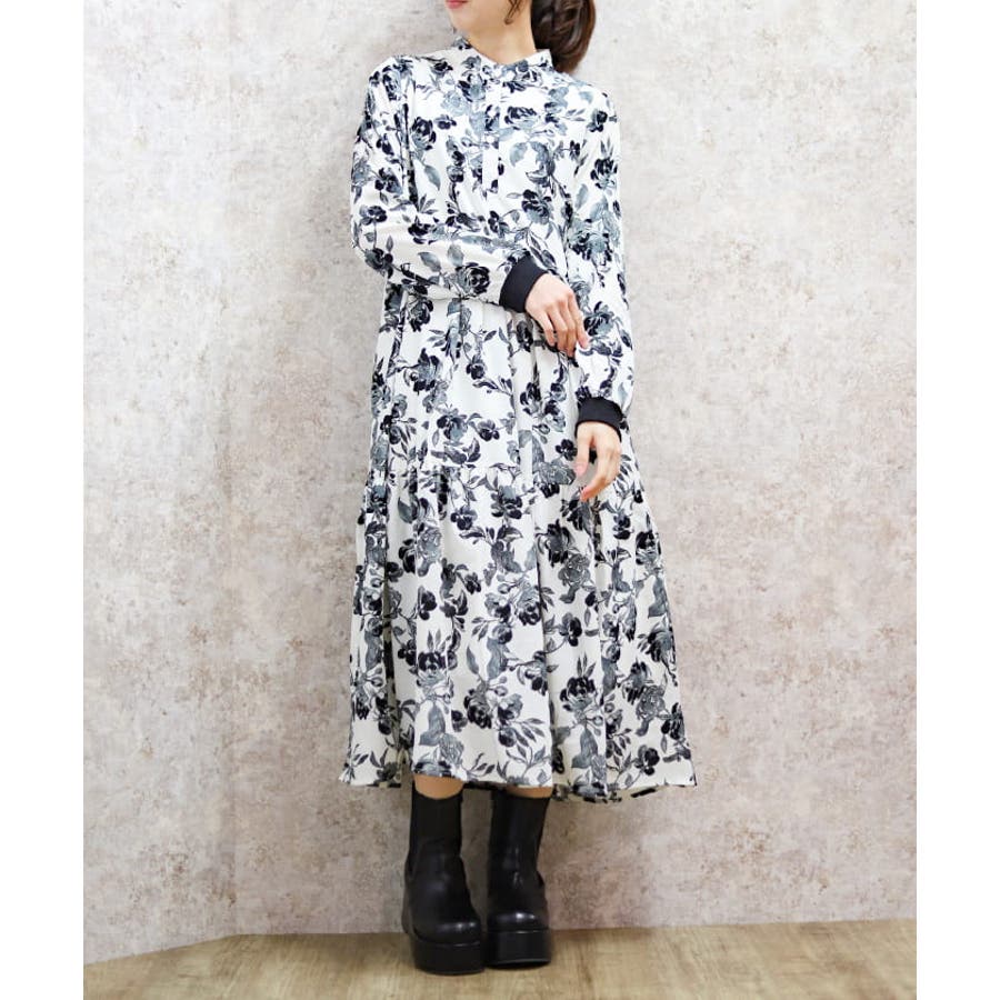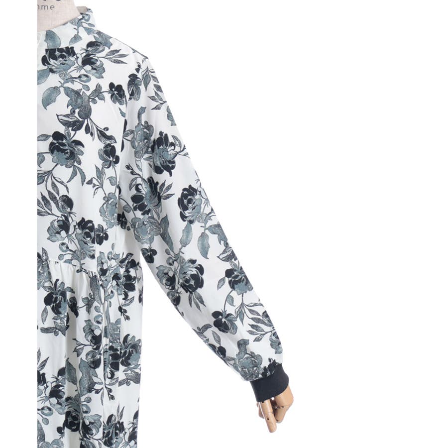 落ち着いたカラーに繊細な花柄が映えるデザイン。程よくゆとりのあるシルエットで、体のラインを拾いすぎず上品に着こなせます。ウエストにはさりげない切り替えが施され、スタイルアップ効果も期待できます。長めの丈感が大人っぽい雰囲気をプラスし、軽やかな動きを演出します。