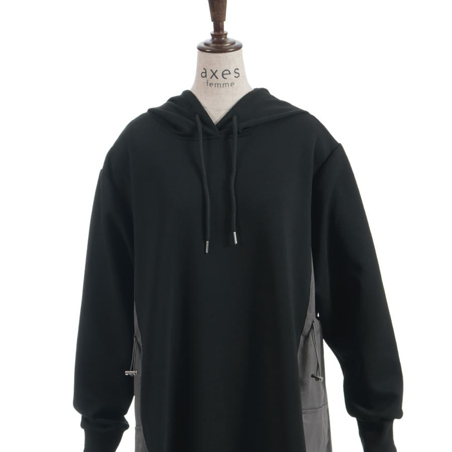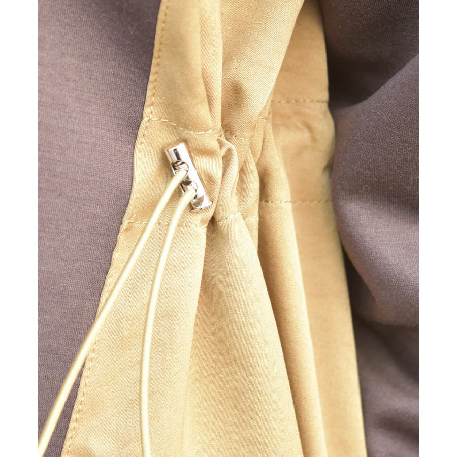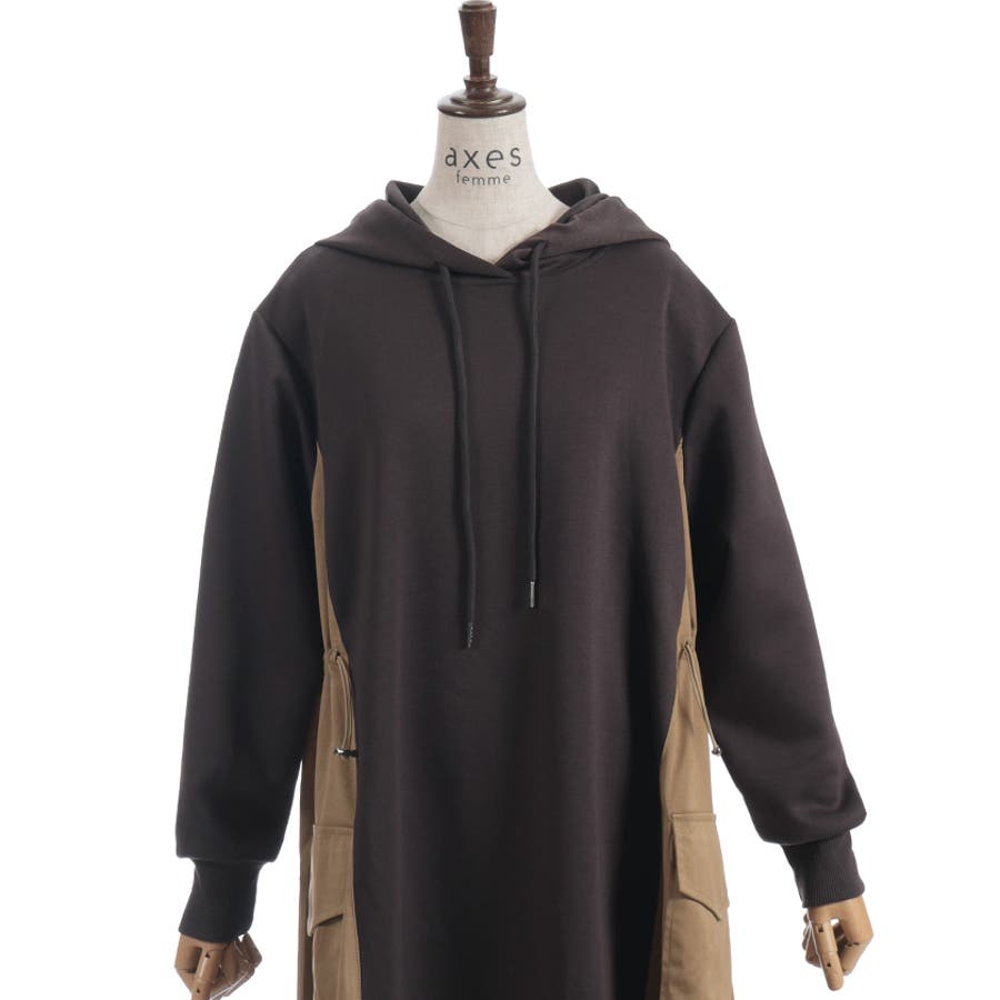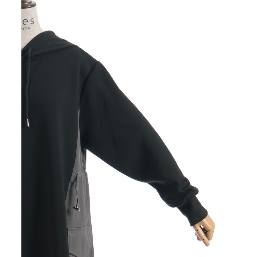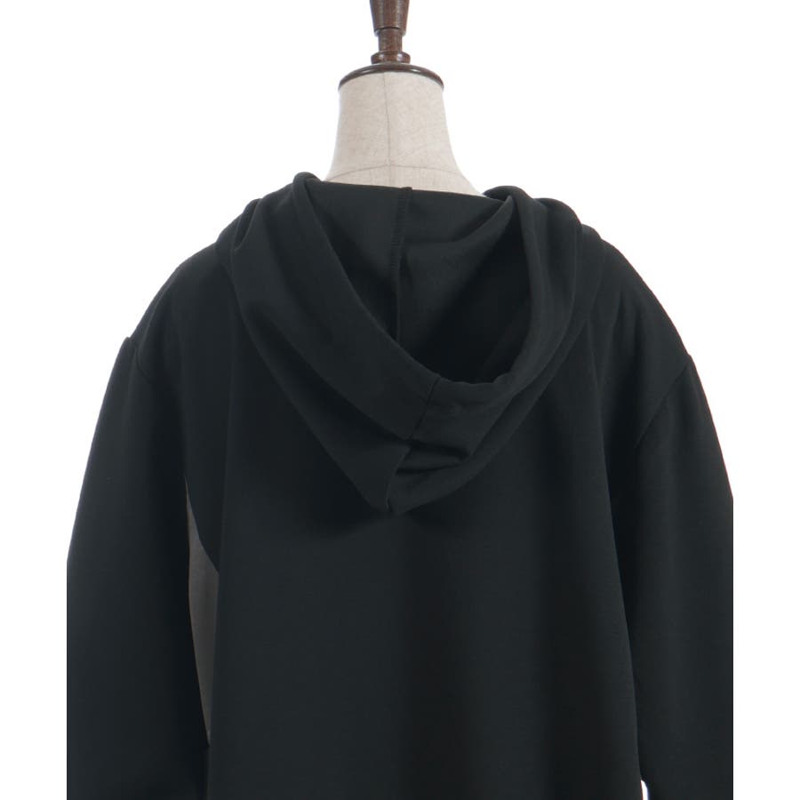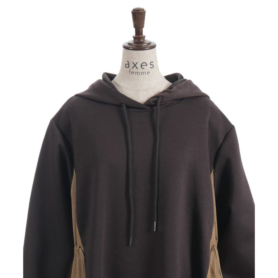 フロントはシンプルなパーカー仕様、サイドには大胆な異素材切替をプラスし、立体的なシルエットを演出。動くたびに揺れる切替部分がスタイルに表情を与え、レディライクな雰囲気もひとさじ。フードのドロストやリブ袖など細部にもこだわりました。
