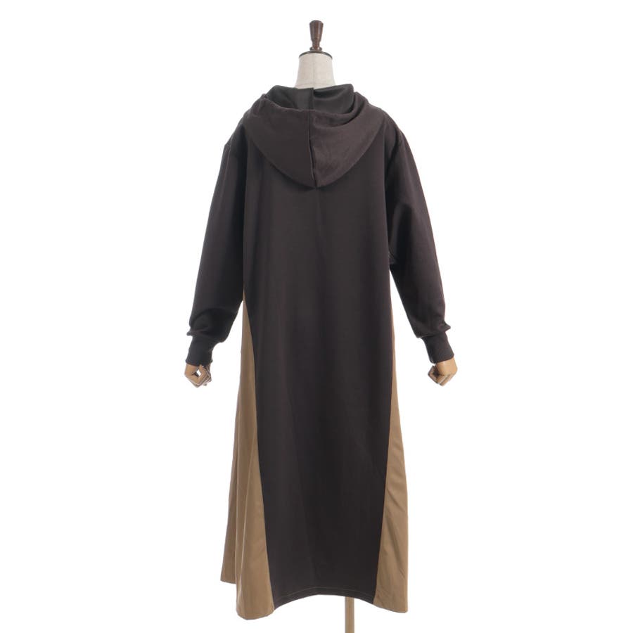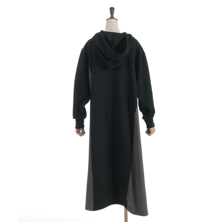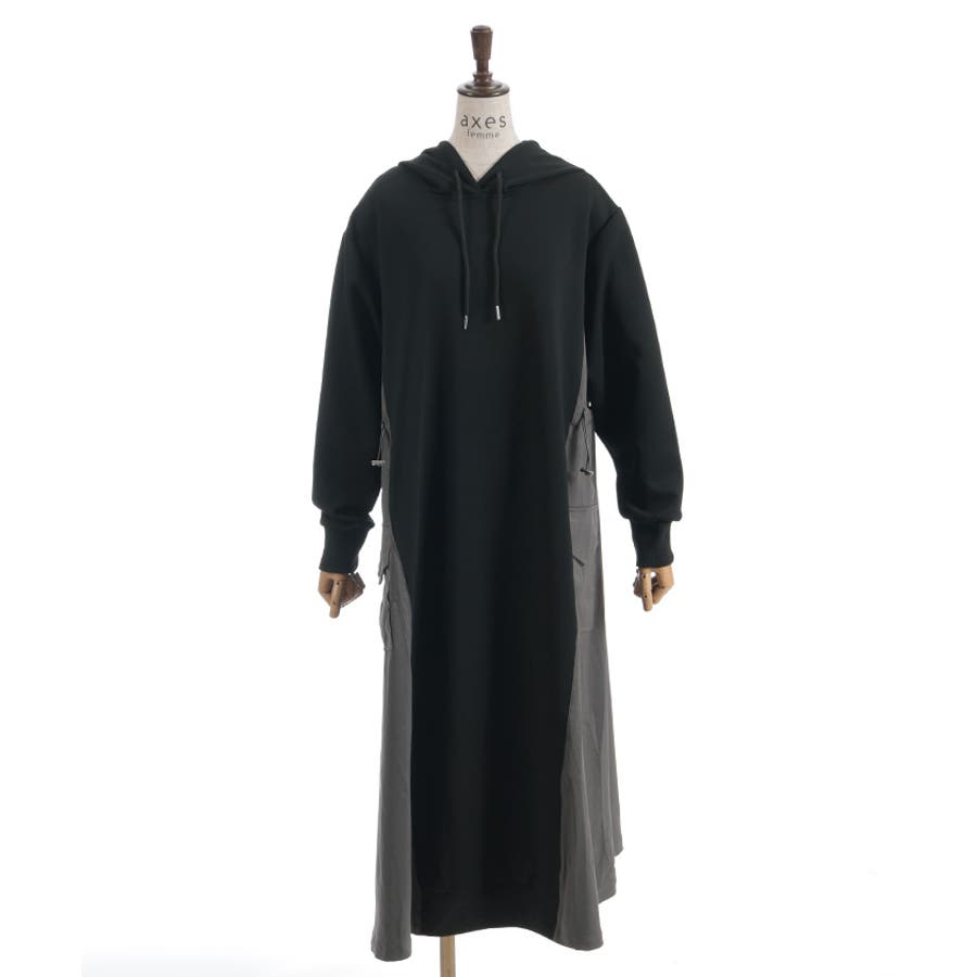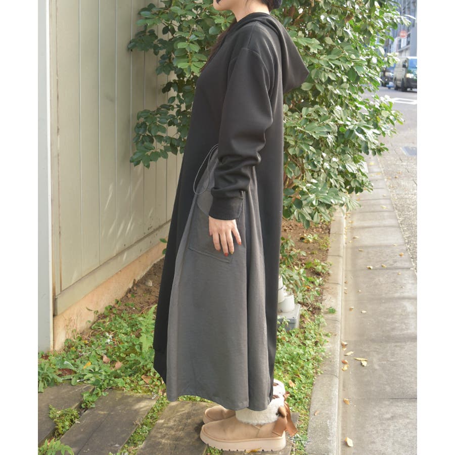 配色切替が目を惹くパーカーワンピース。リラックス感のある着心地ながら、ひと癖あるデザインで“着るだけでおしゃれ”が叶う一枚です。カジュアルにもモードにも寄せられる万能アイテム。