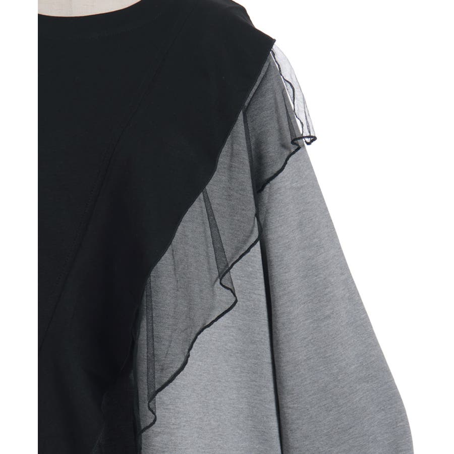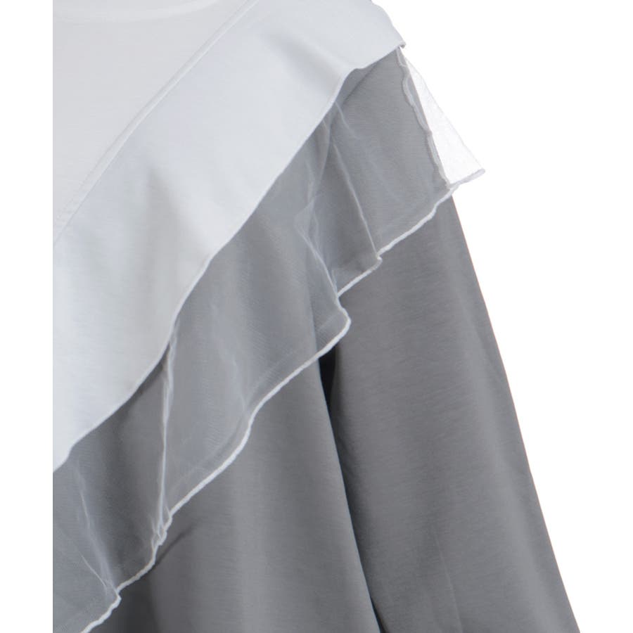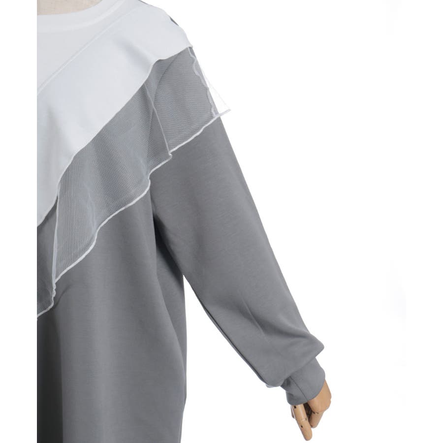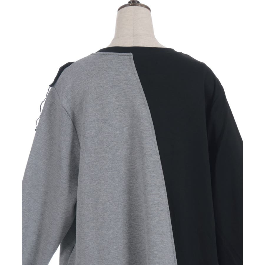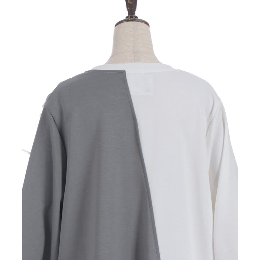 斜めに切り替えた配色ラインが全体をすっきり見せ、動きのあるシルエットを演出します。カットソー素材で着心地がよく、デザイン性とリラックス感を両立した一着です。