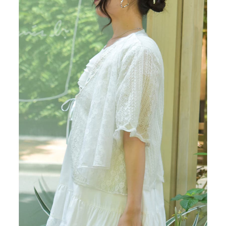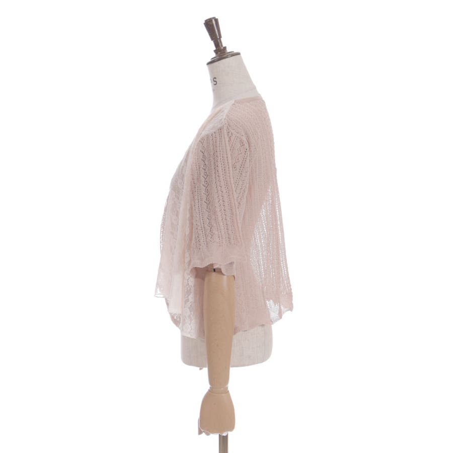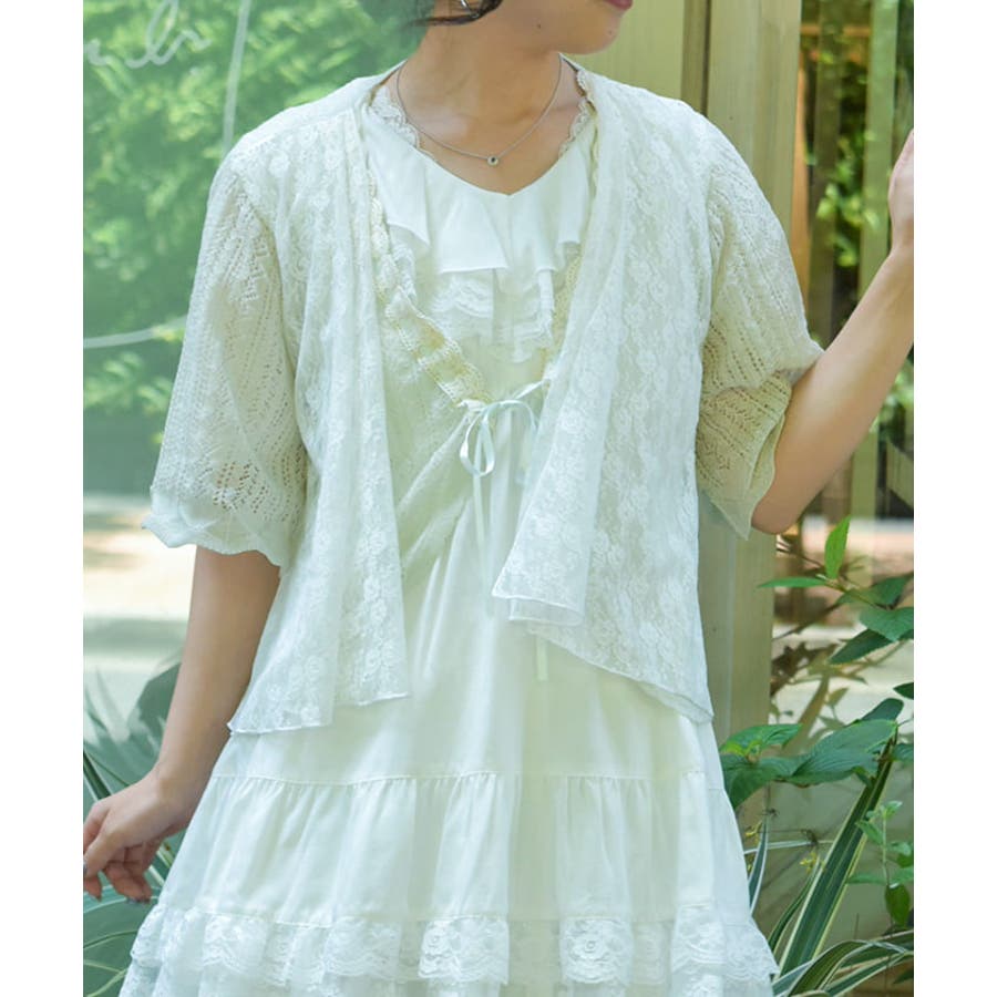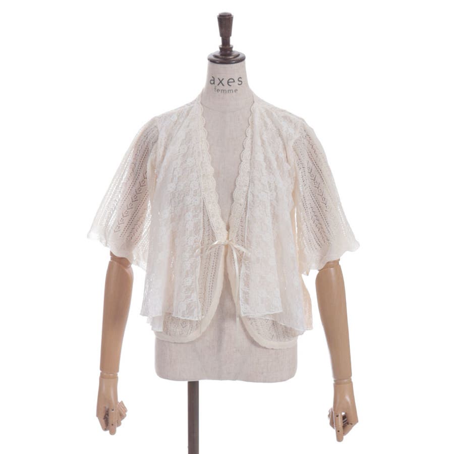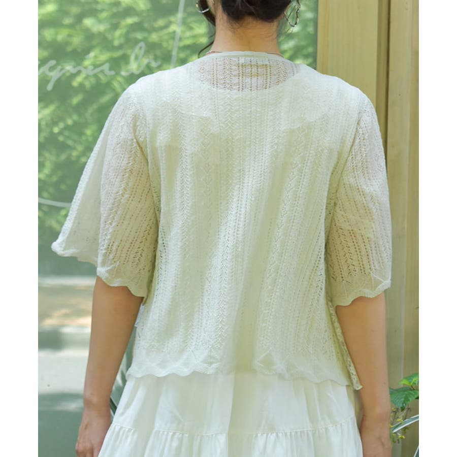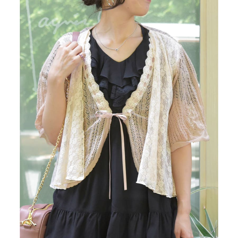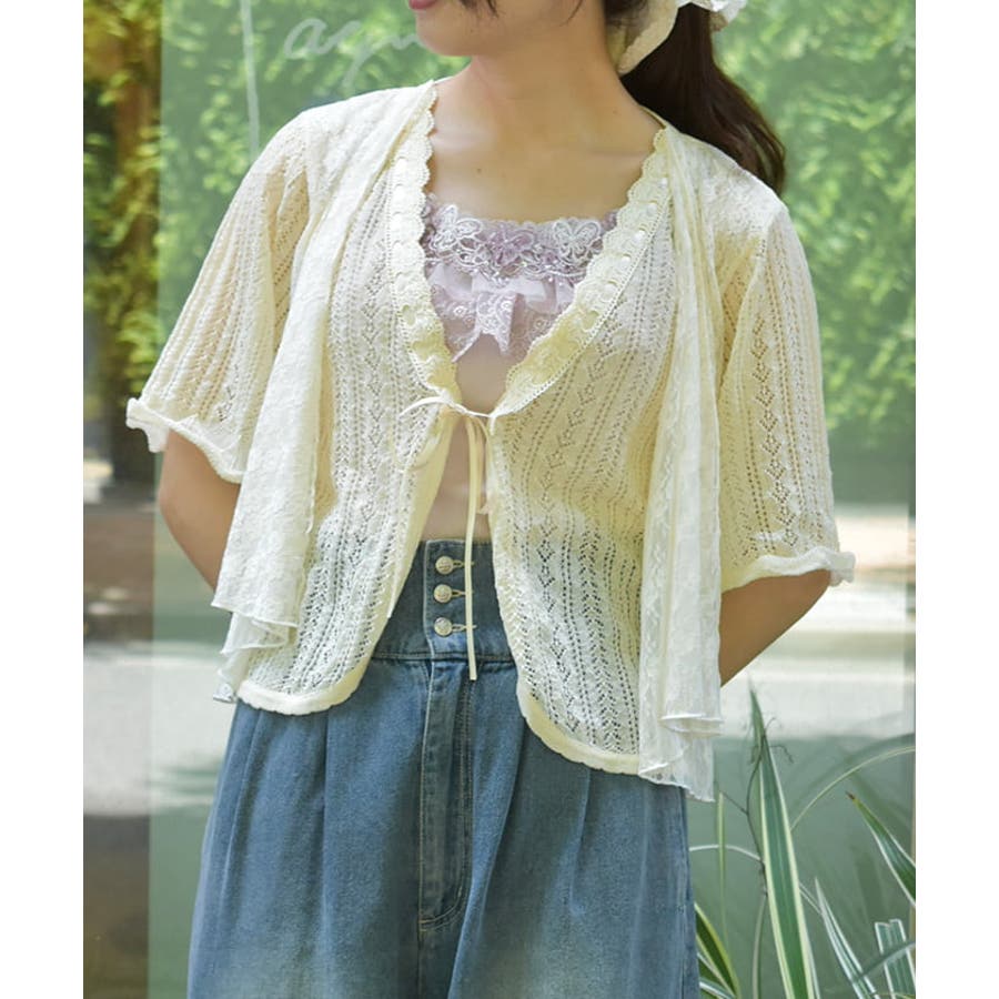 繊細なレース風の編地がフェミニンな印象を与えるショートカーデは、1枚でレイヤードスタイルが完成する便利なアイテムです。