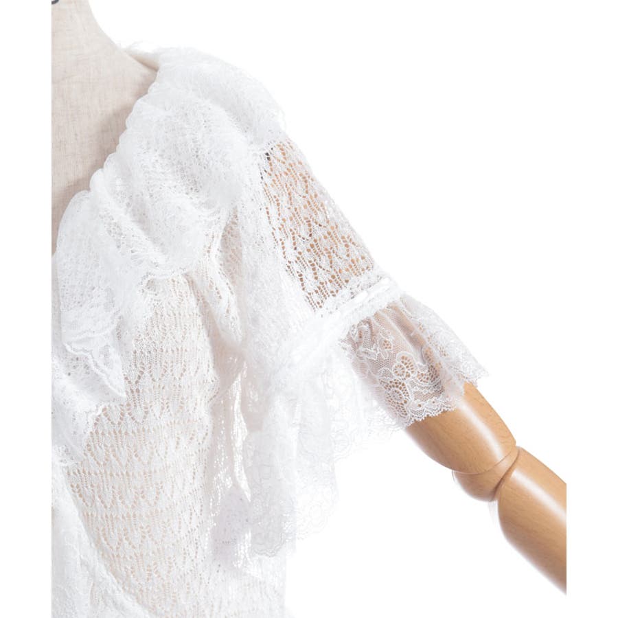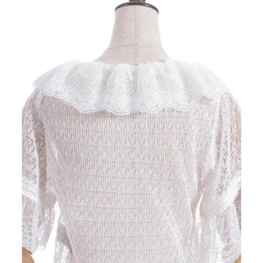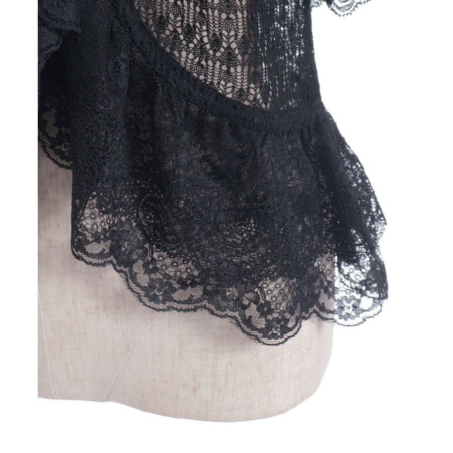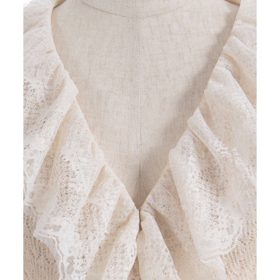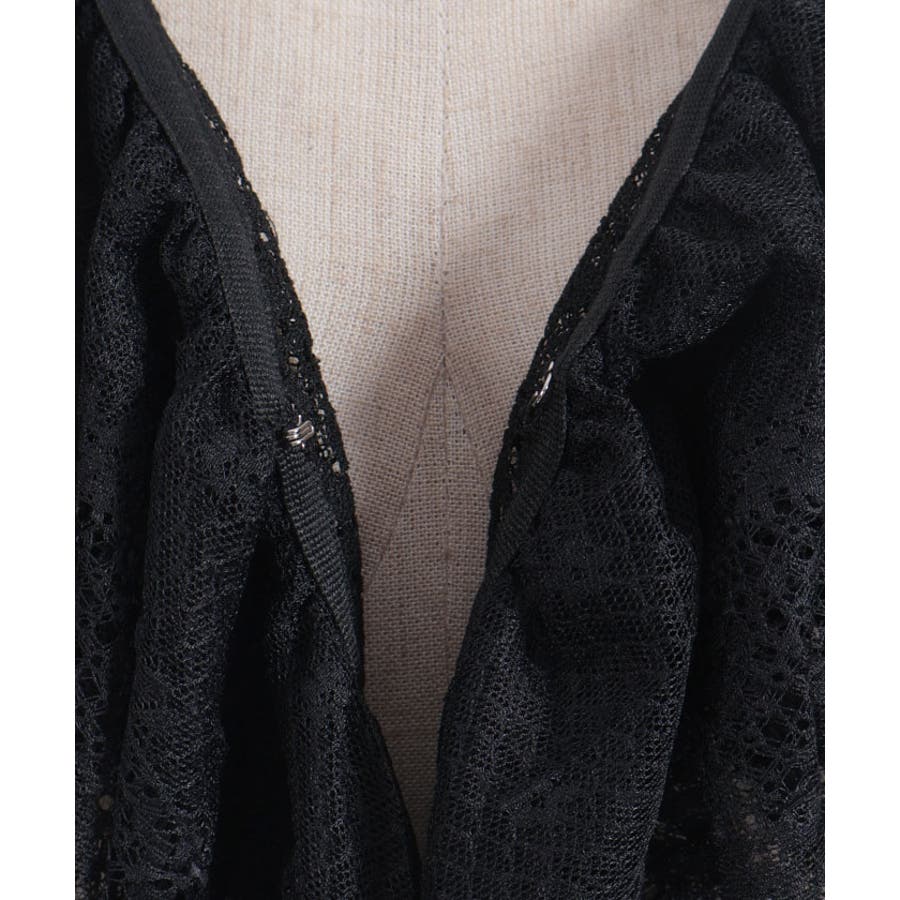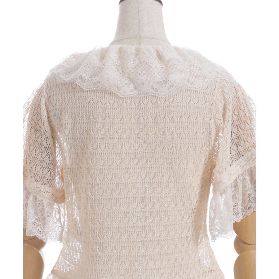 繊細なレース風編地とウエストのくびれラインが女性らしさを引き立て、適度にボリュームのあるシルエットを演出します。フロントは鍵ホックで留められる仕様です。