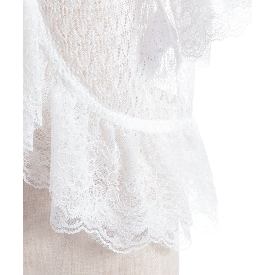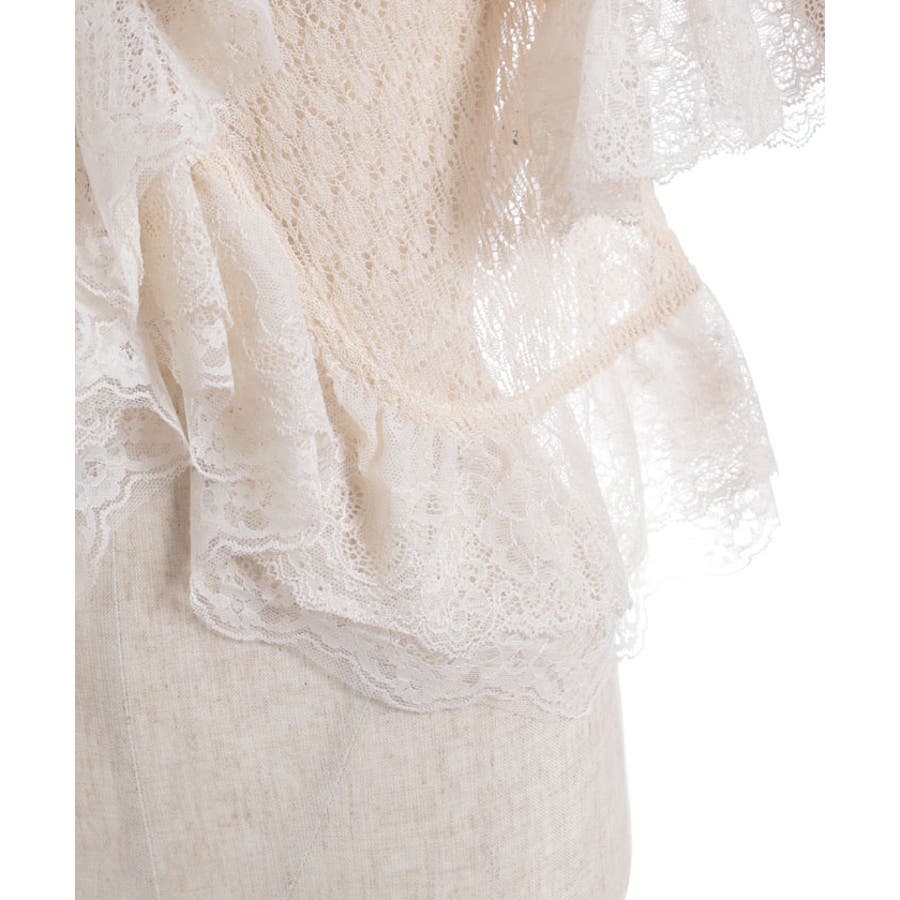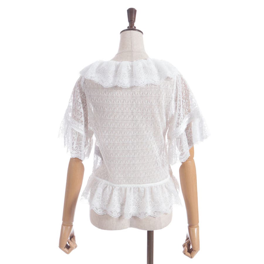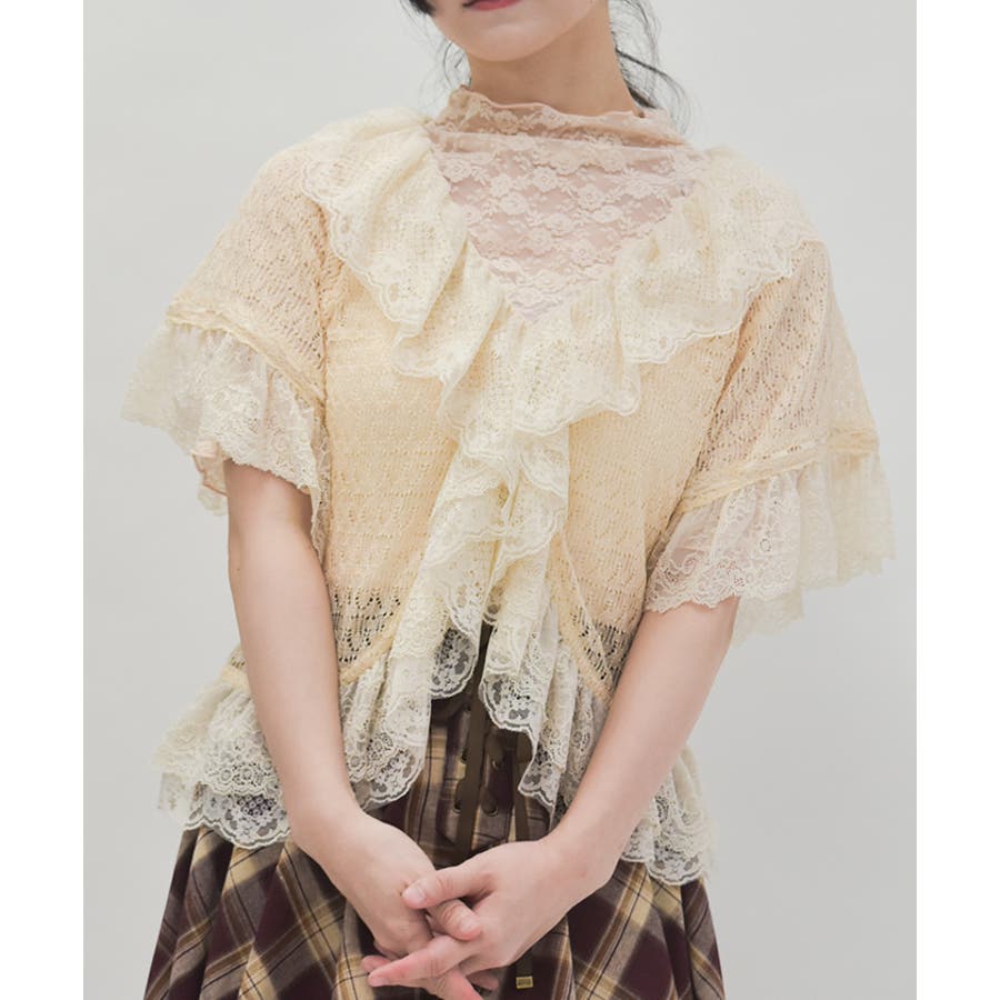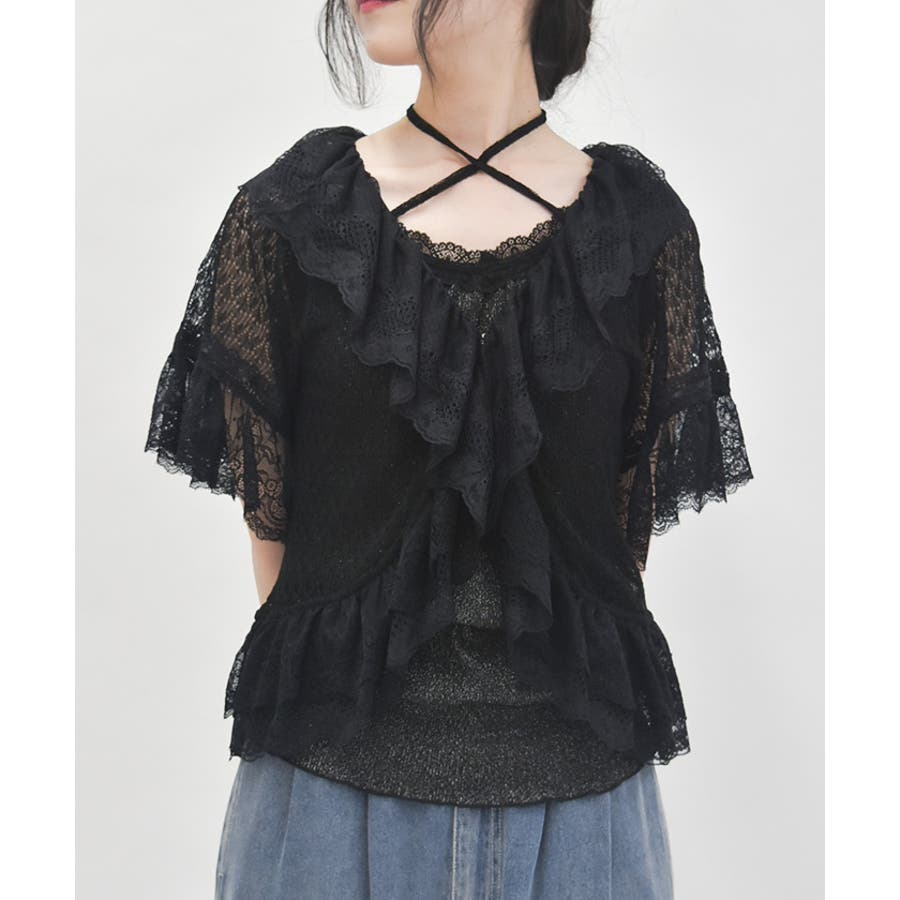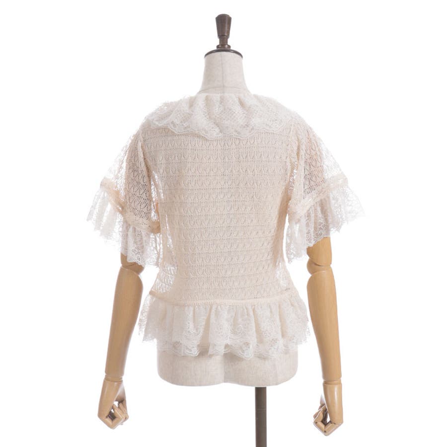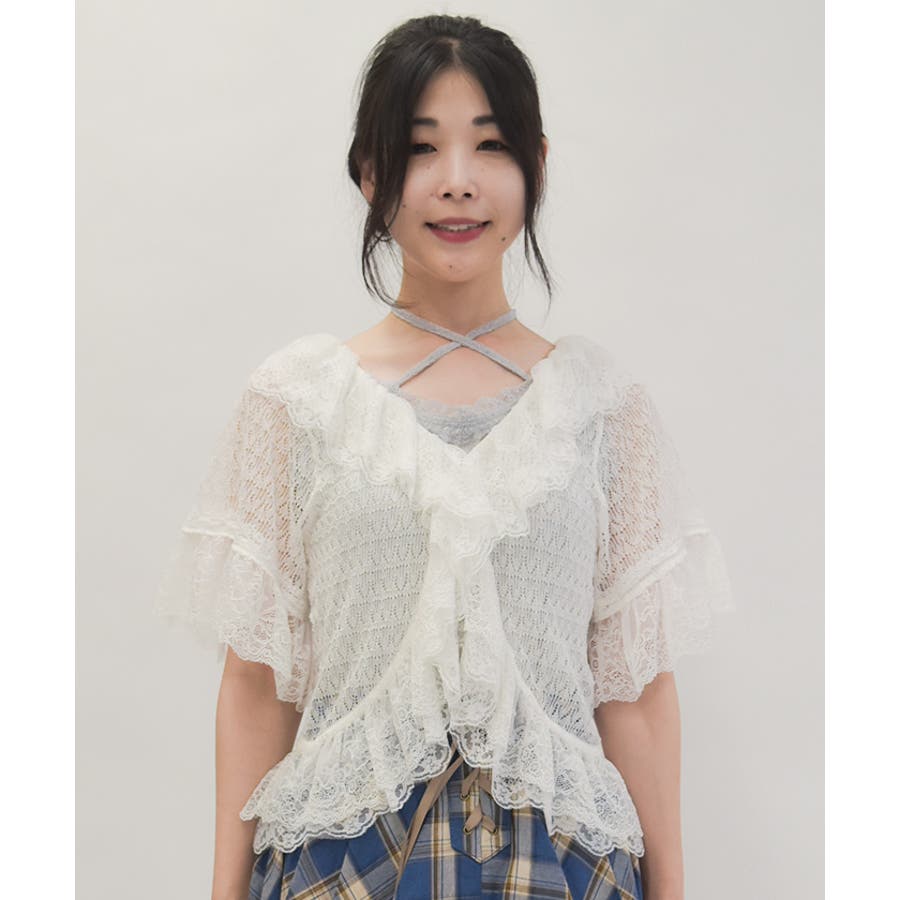 ボリュームたっぷりのフリルが目を引く、存在感のあるサマーニットトップス。