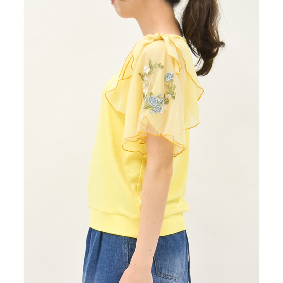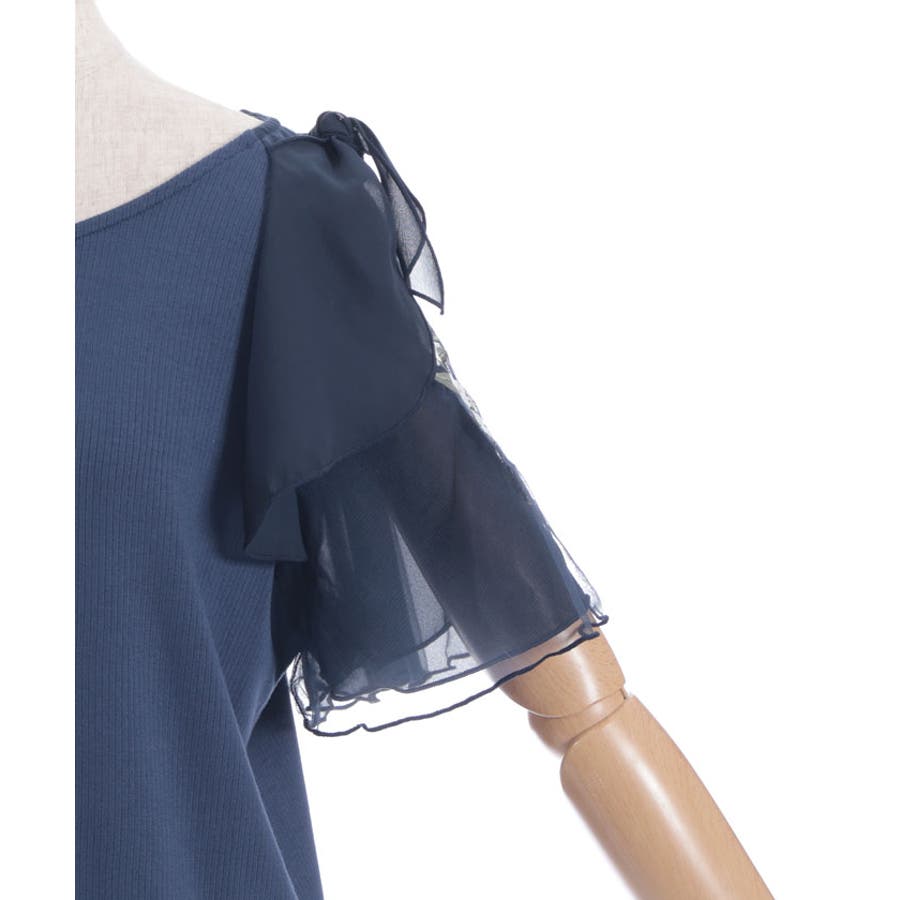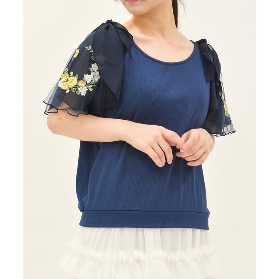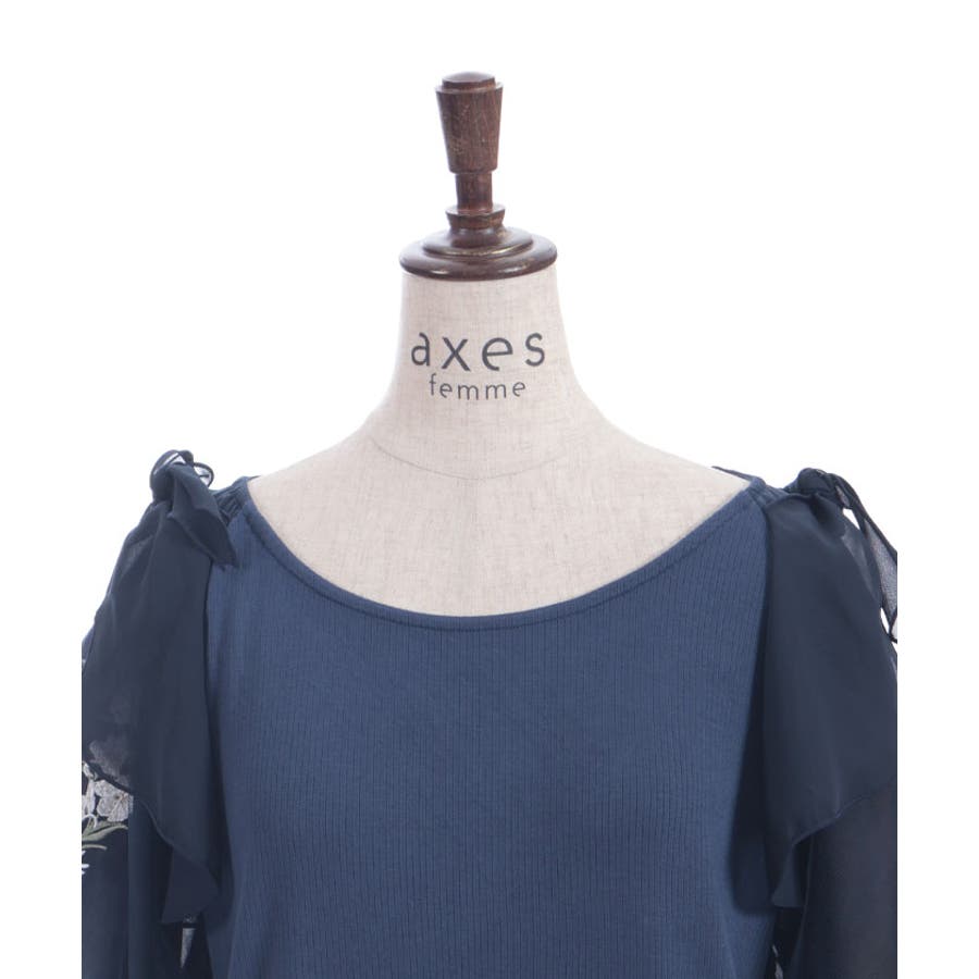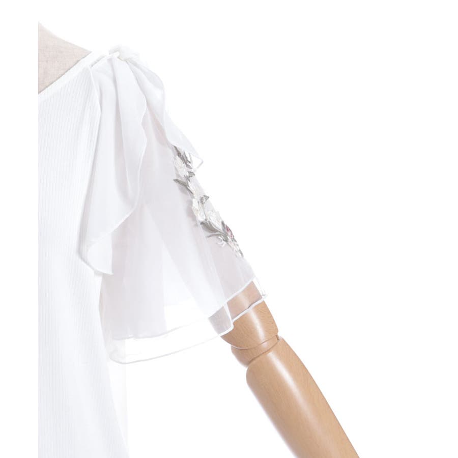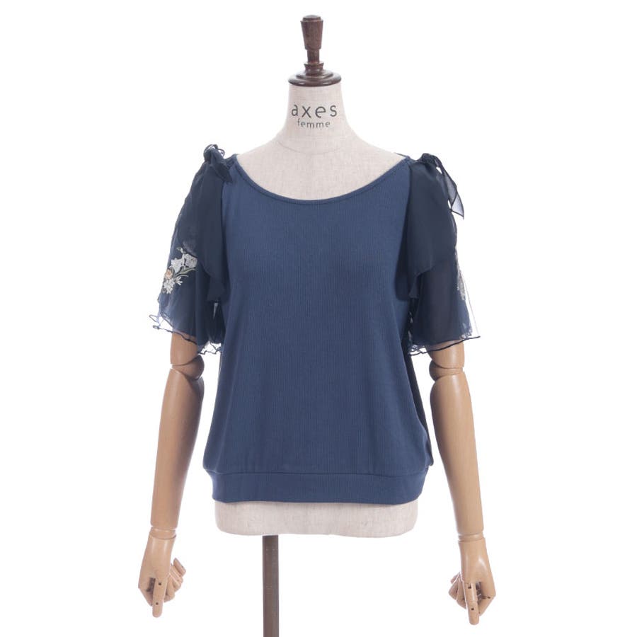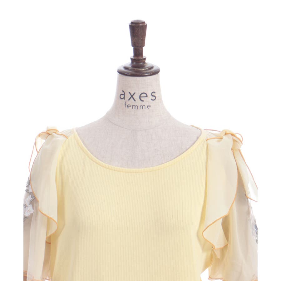 華やかな、チュール×ブーケ刺繍の袖がポイントのリブトップスです。