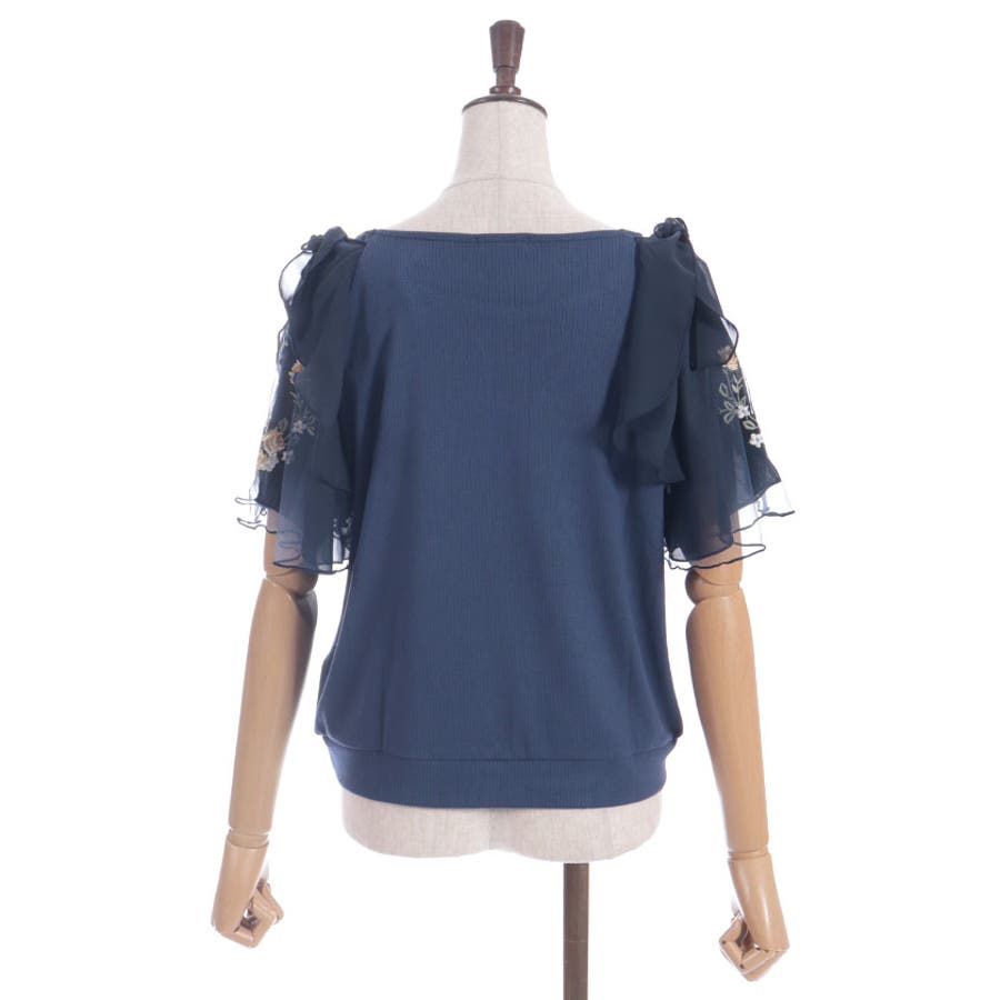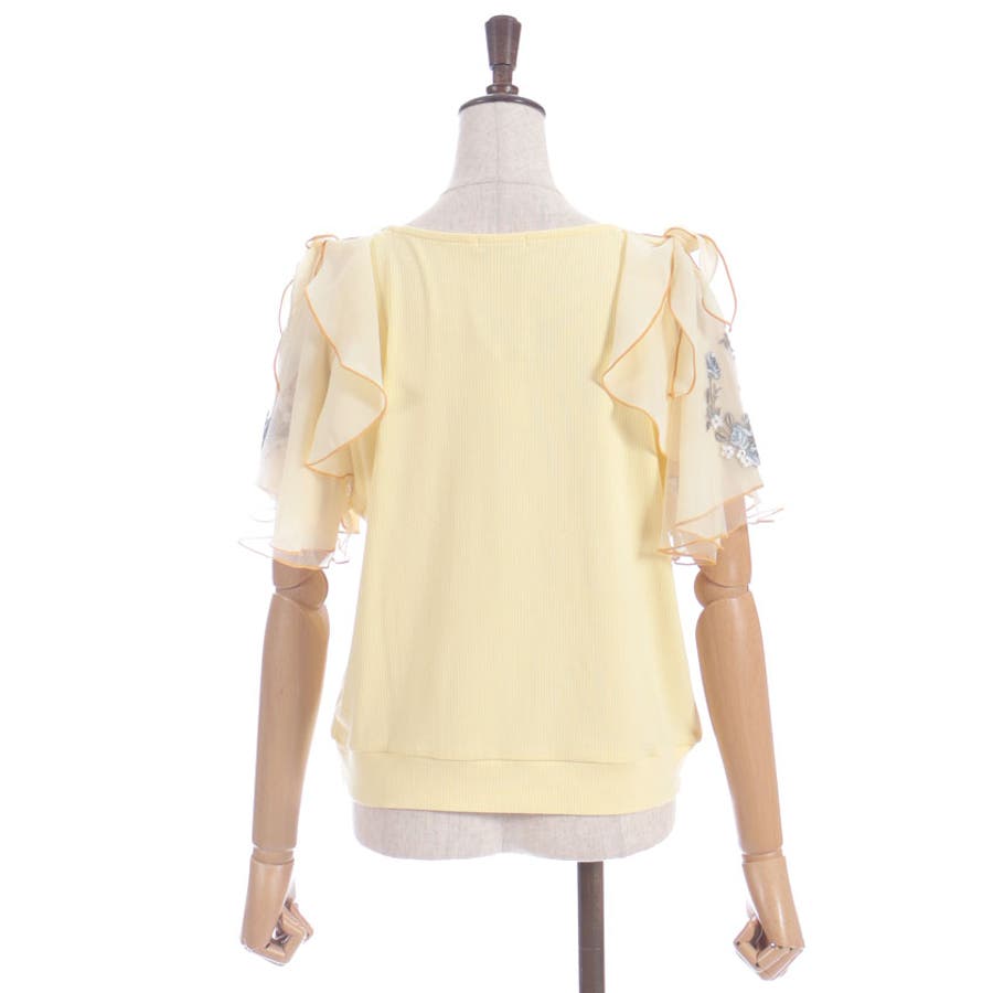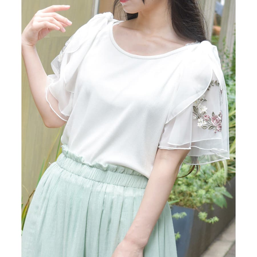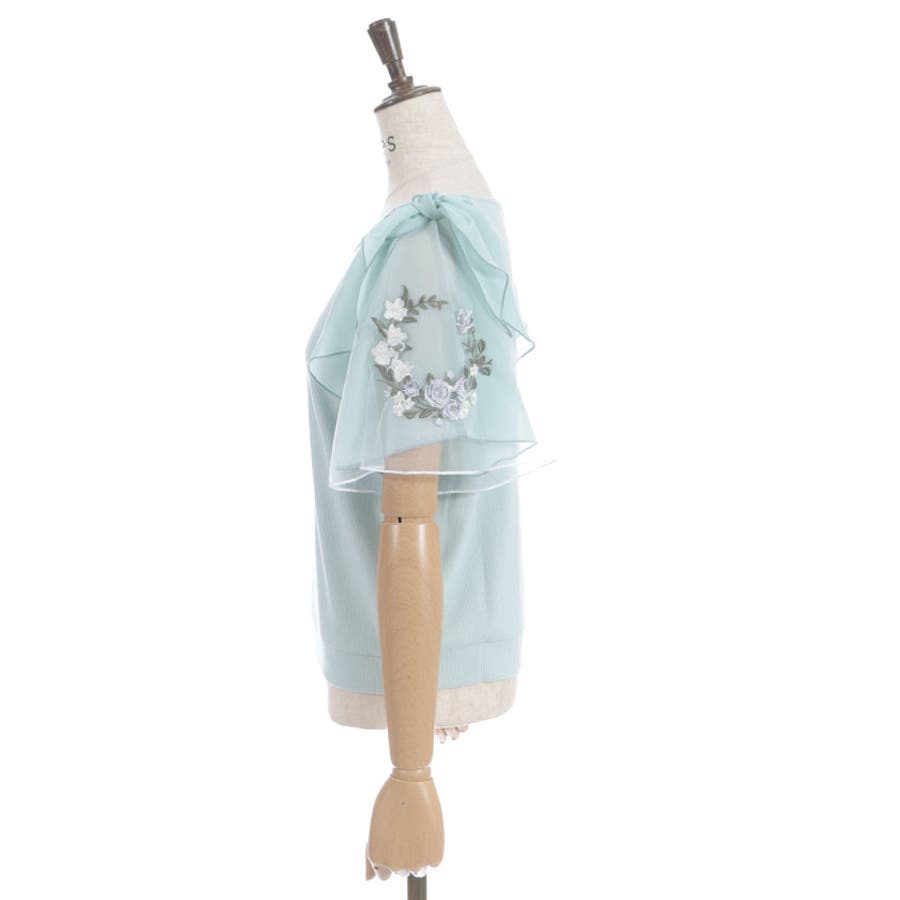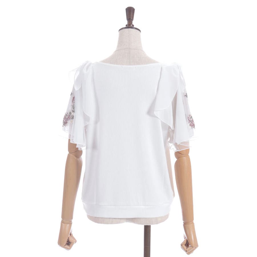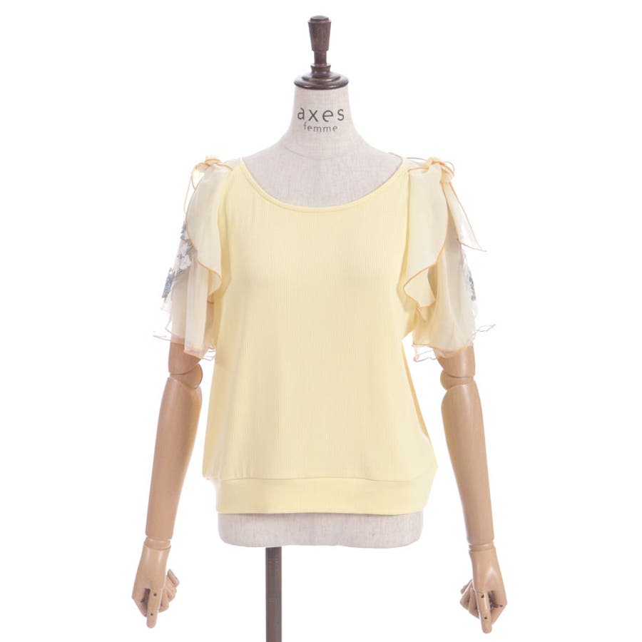 華やかな、チュール×ブーケ刺繍の袖がポイントのリブトップスです。