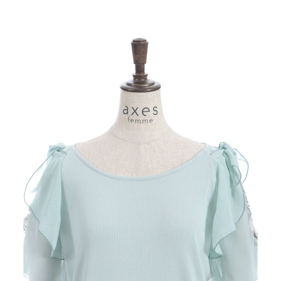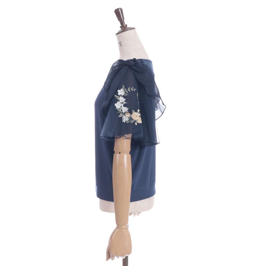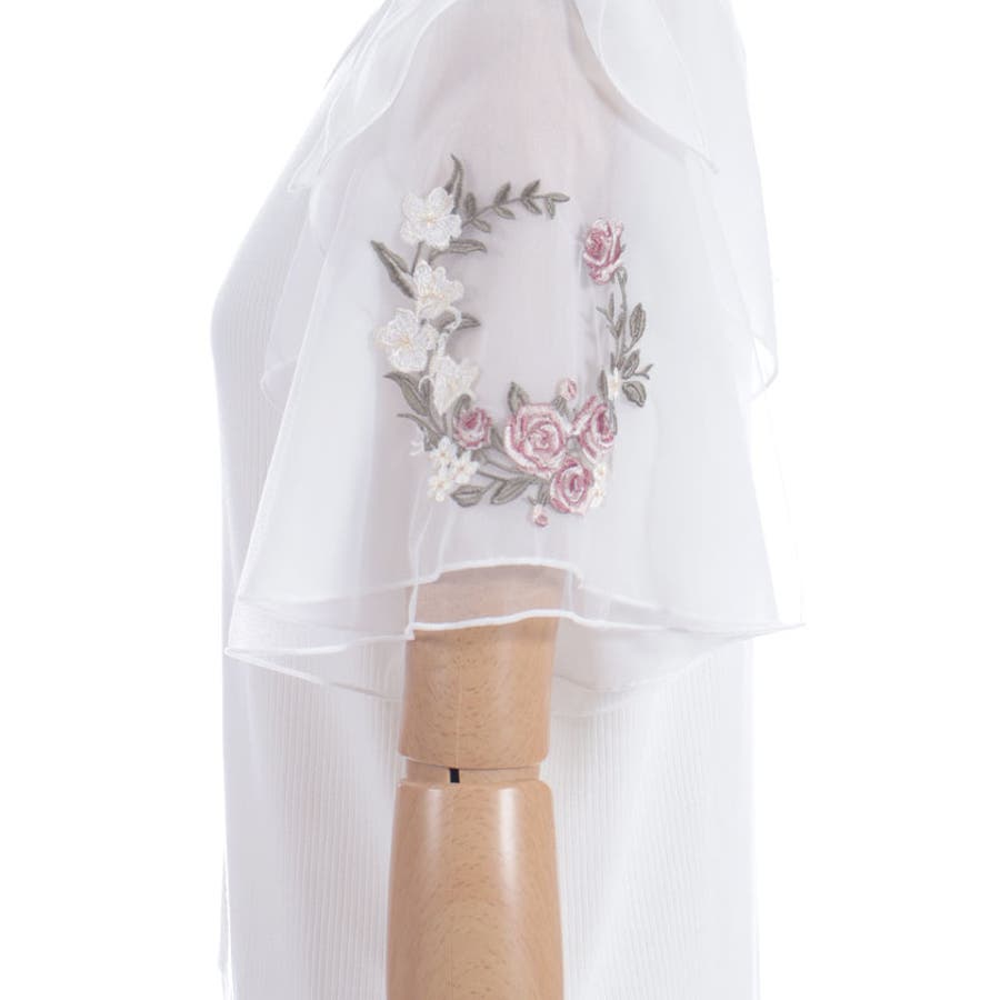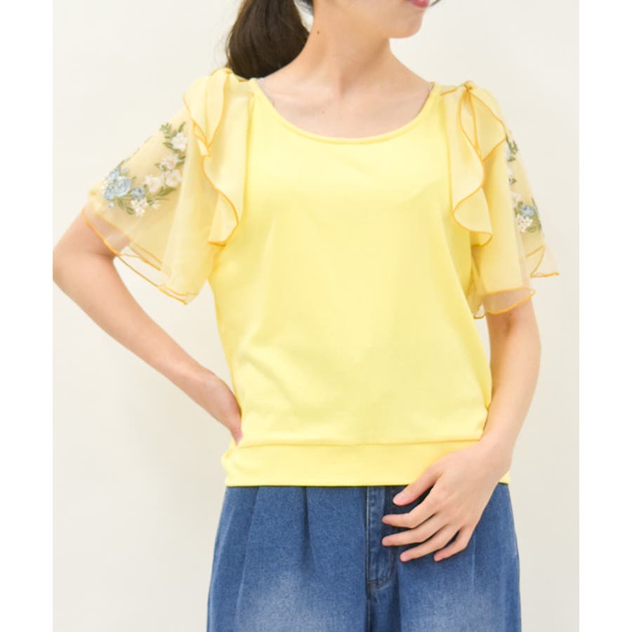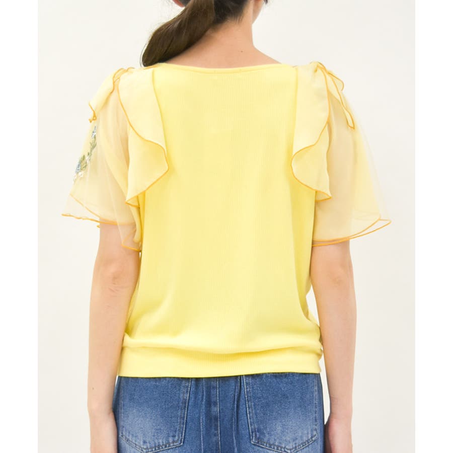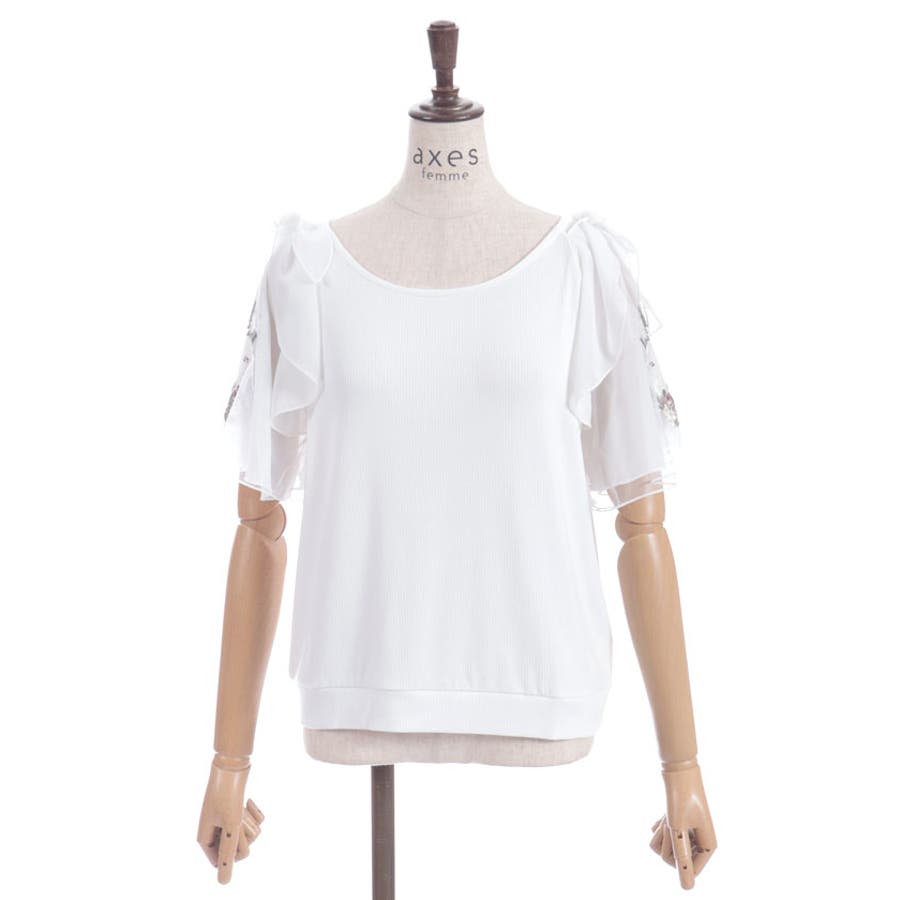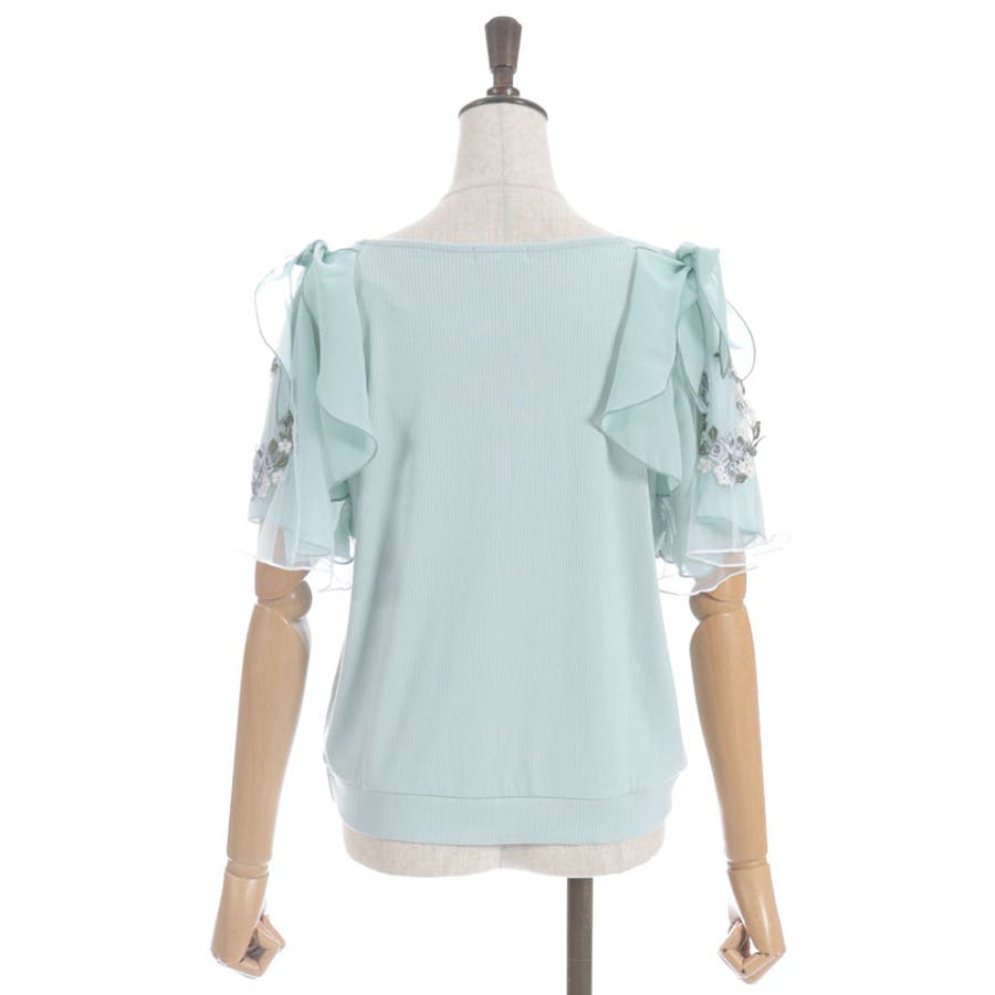 華やかな、チュール×ブーケ刺繍の袖がポイントのリブトップスです。