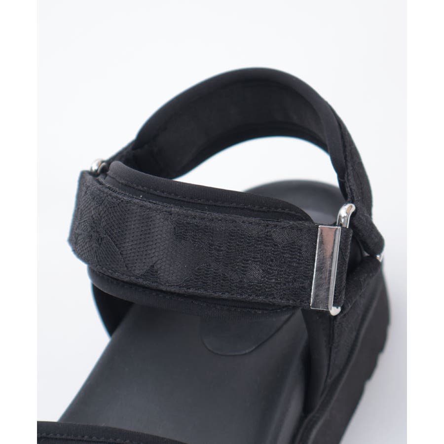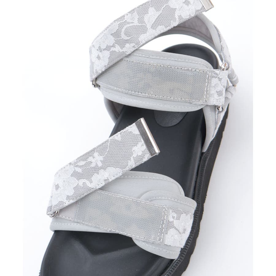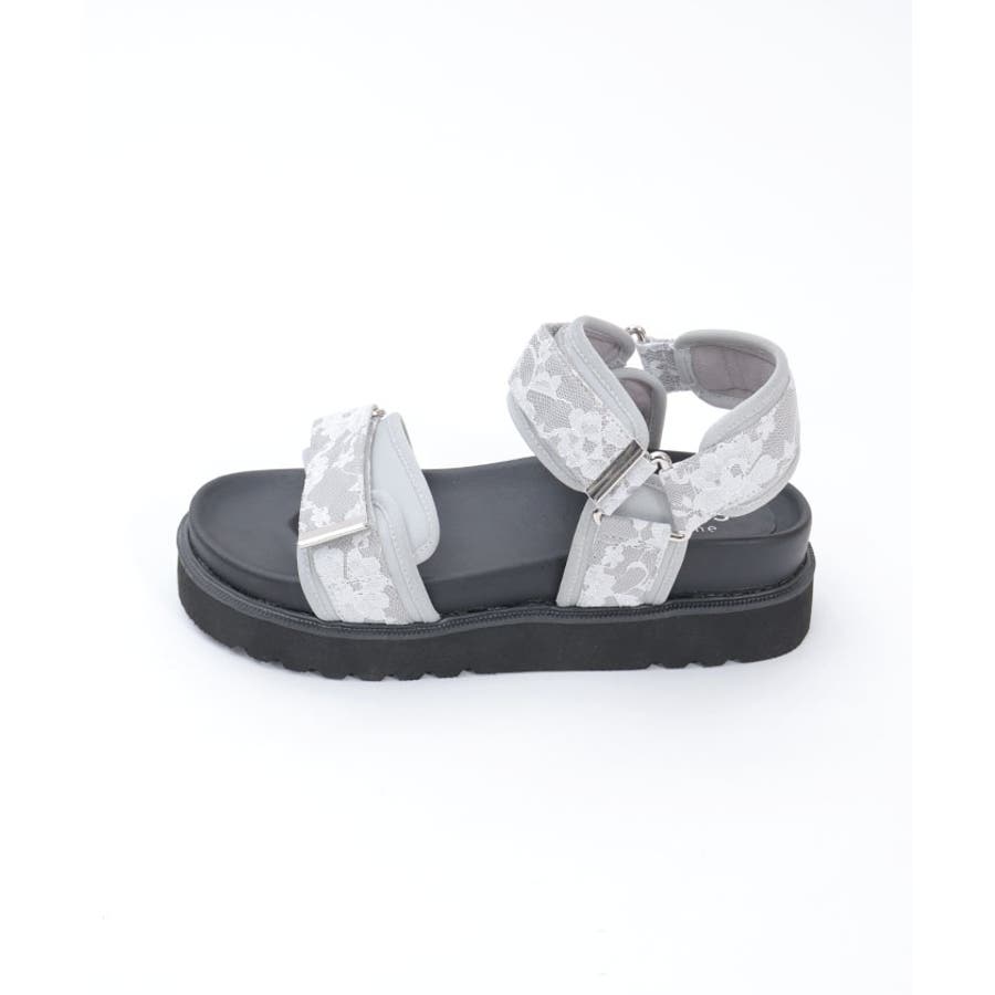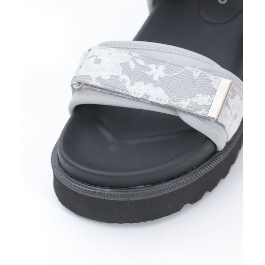 スポーティーな印象のベルトサンダルに繊細なレースを重ね、フェミニンに仕上げたデザイン。