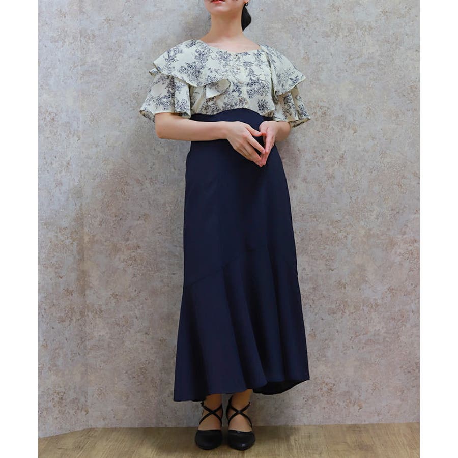 ウエストでキュッと細く、裾に向かってアシメ切替のスカートがふわっと広がる、細見えこだわりのシルエットです。