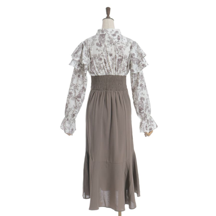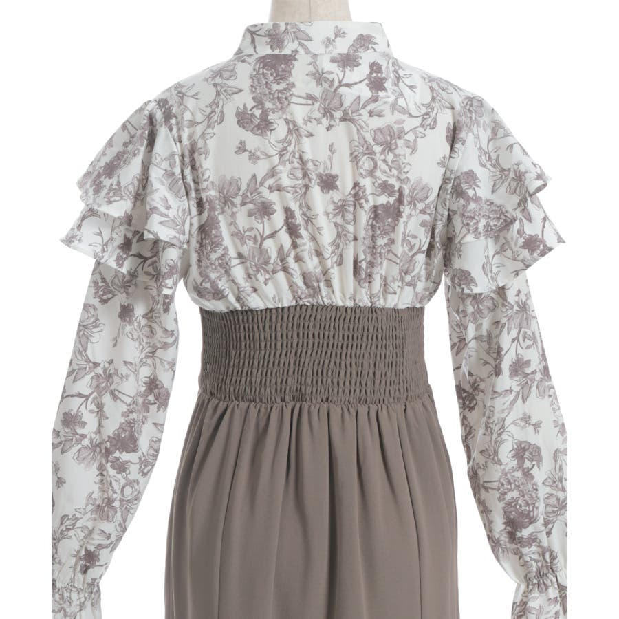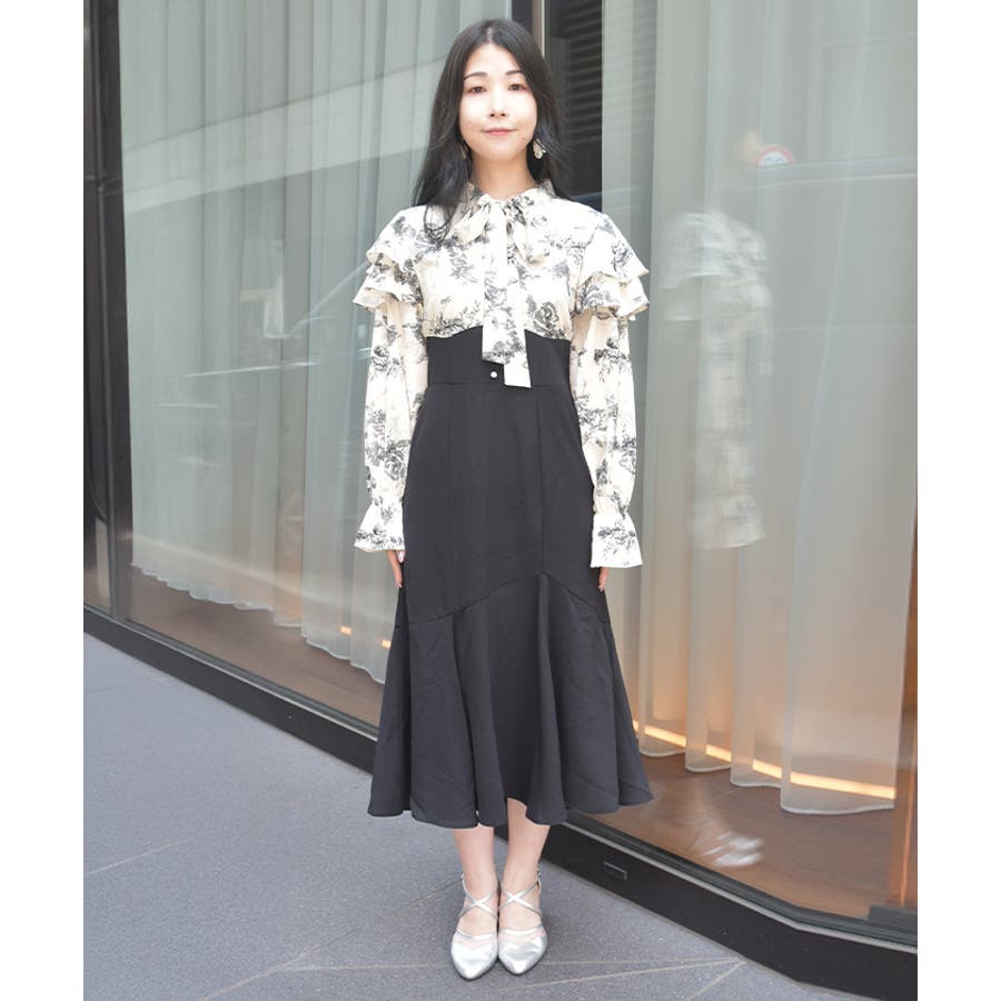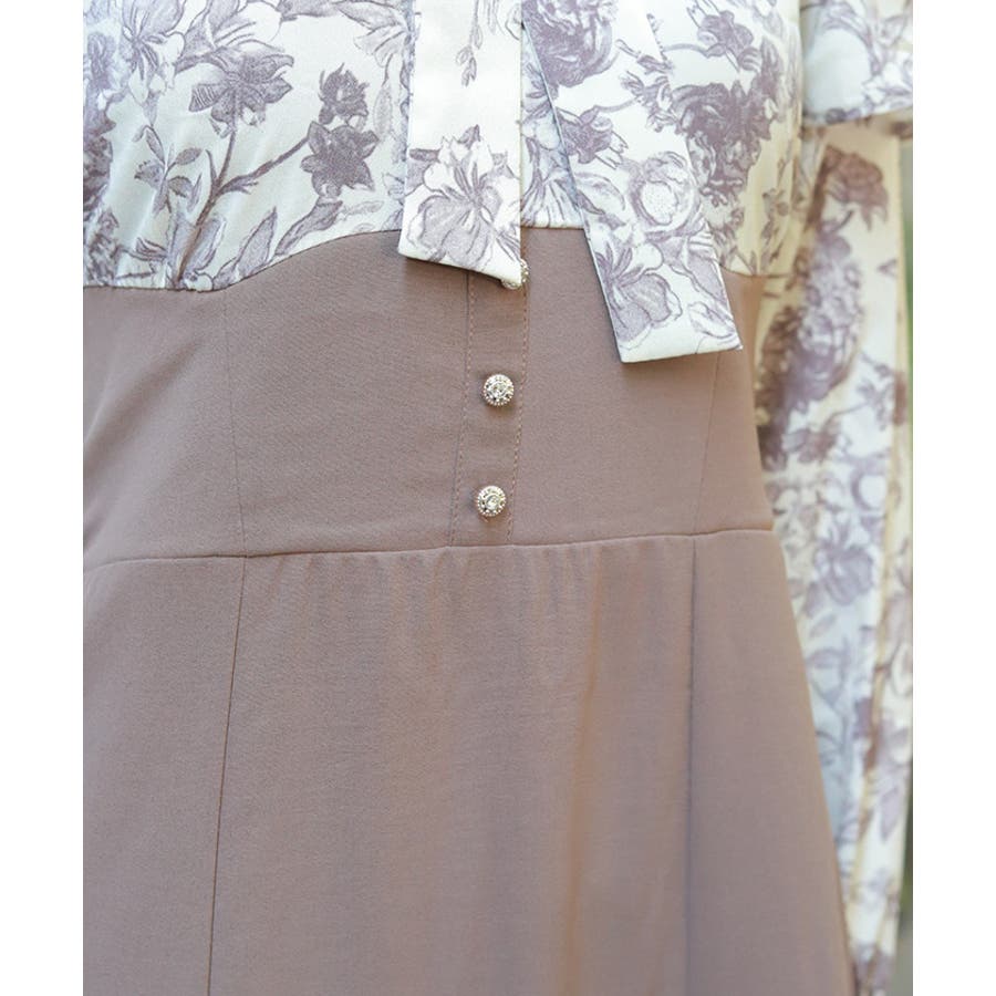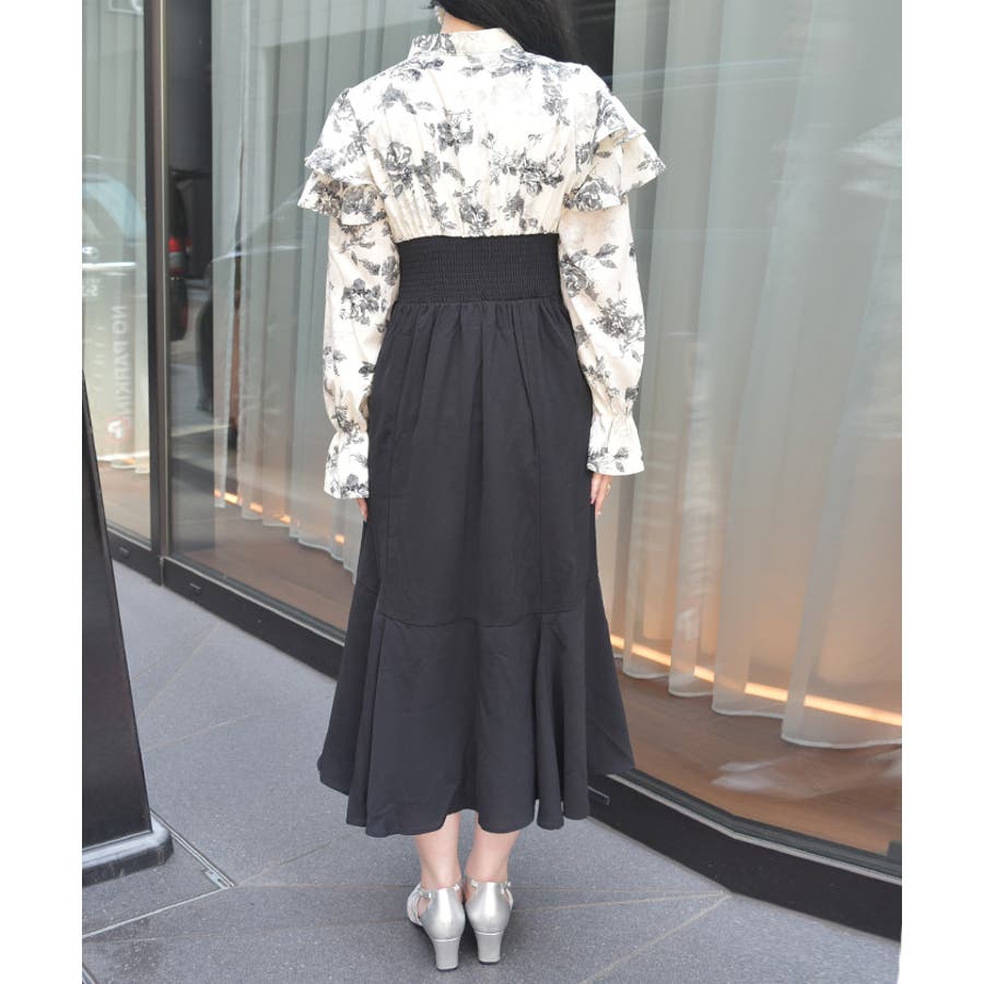 シンプルめな柄ブラウス×無地スカートのドッキングワンピースです。
