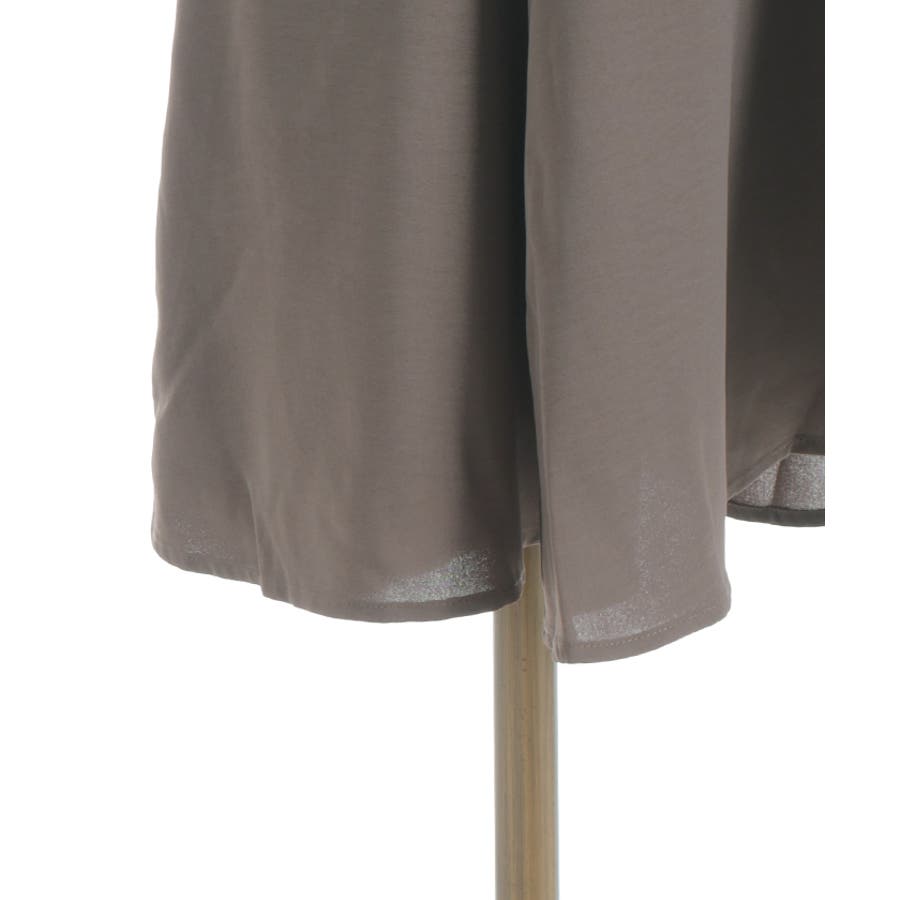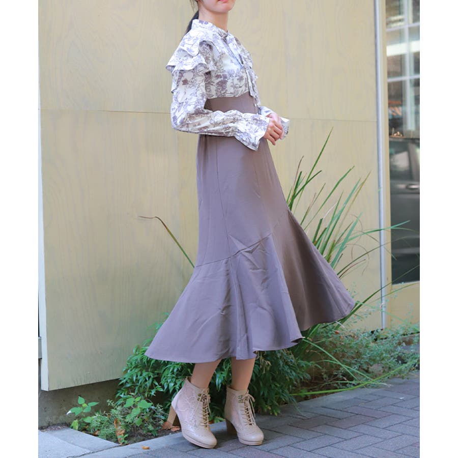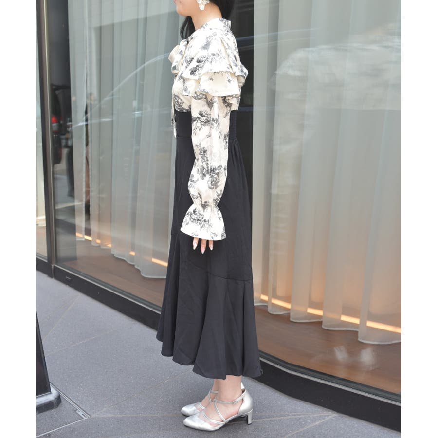 ウエストでキュッと細く、裾に向かってアシメ切替のスカートがふわっと広がる、細見えこだわりのシルエットです。