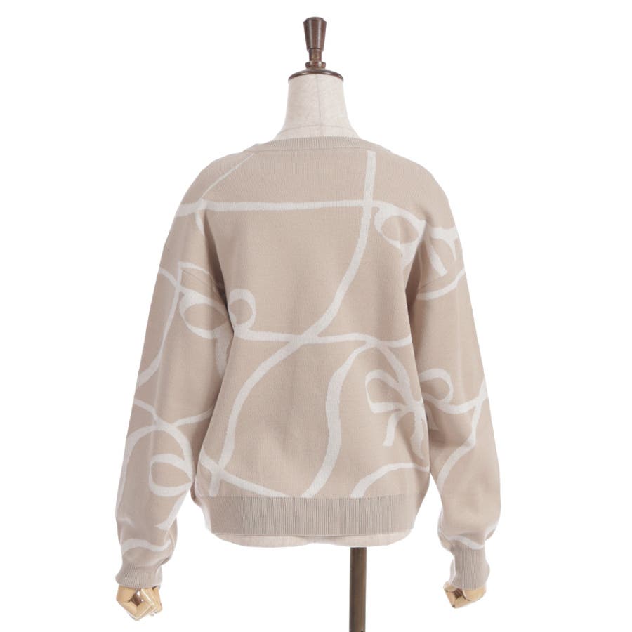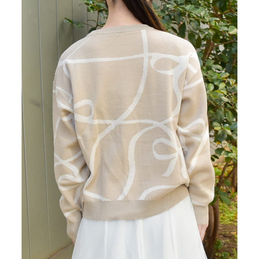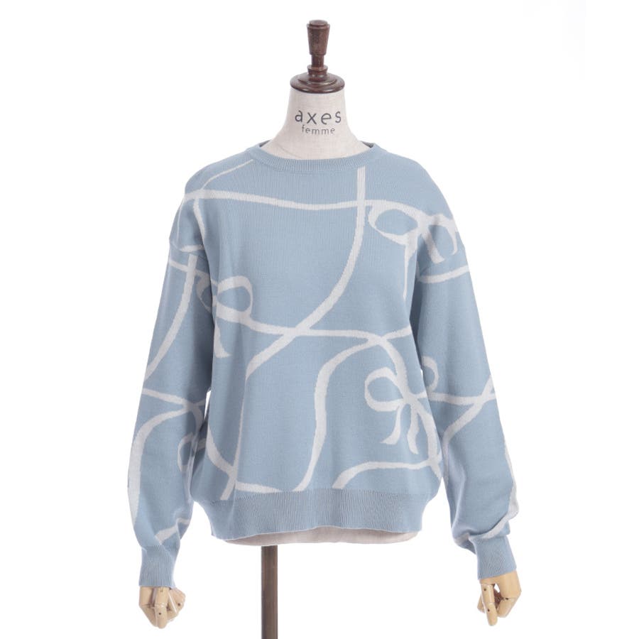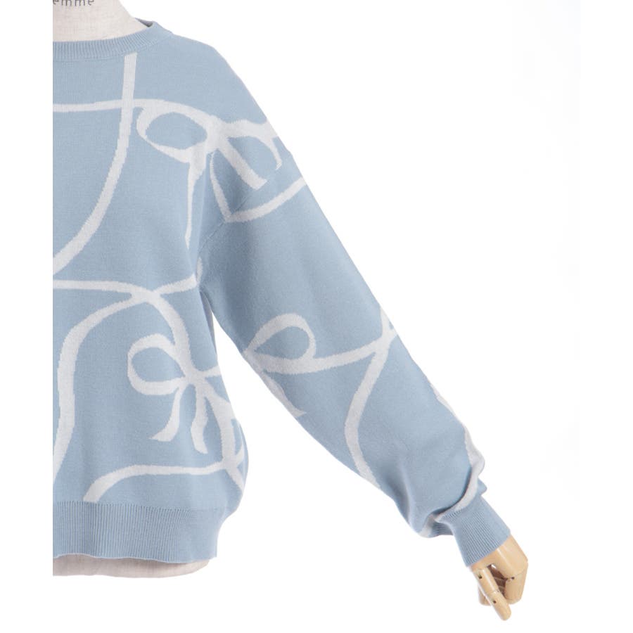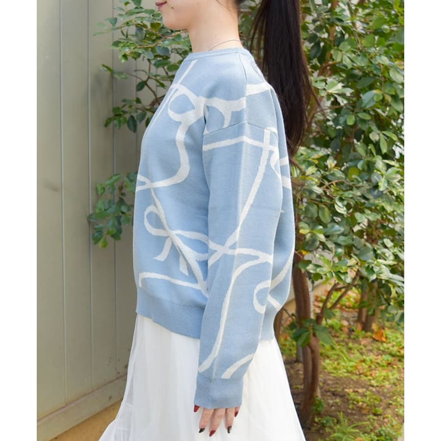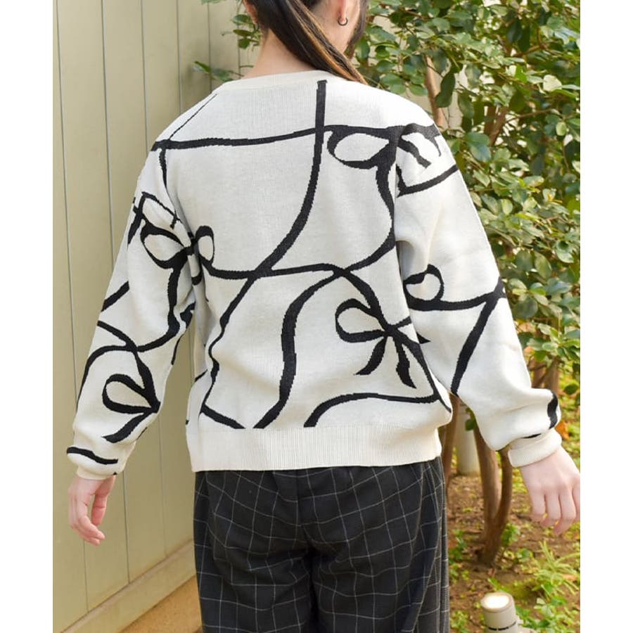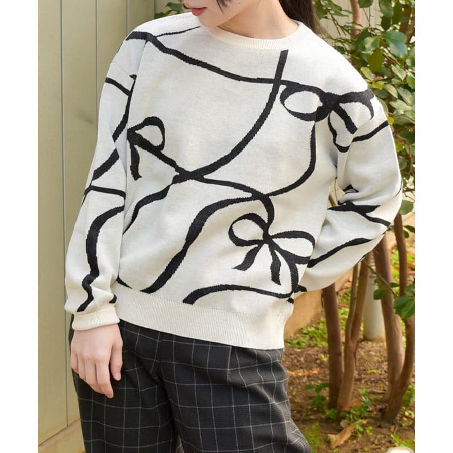 フロントと袖にあしらわれたリボン柄が印象的で、視線を集めるアクセントに。柔らかく薄手のニット素材を使用しており、軽やかで快適な着心地が特徴です。季節の変わり目にも対応できる程よい厚みで、幅広いスタイリングに活躍します。ゆったりとしたシルエットがリラックス感を与えつつ、デイリーコーデに取り入れやすいデザインです。