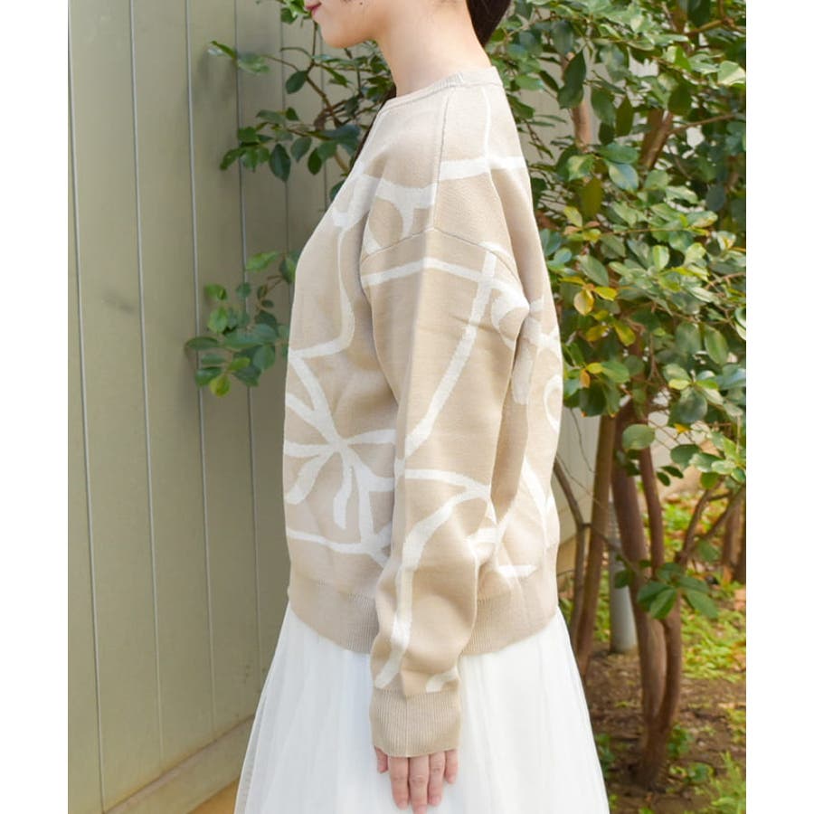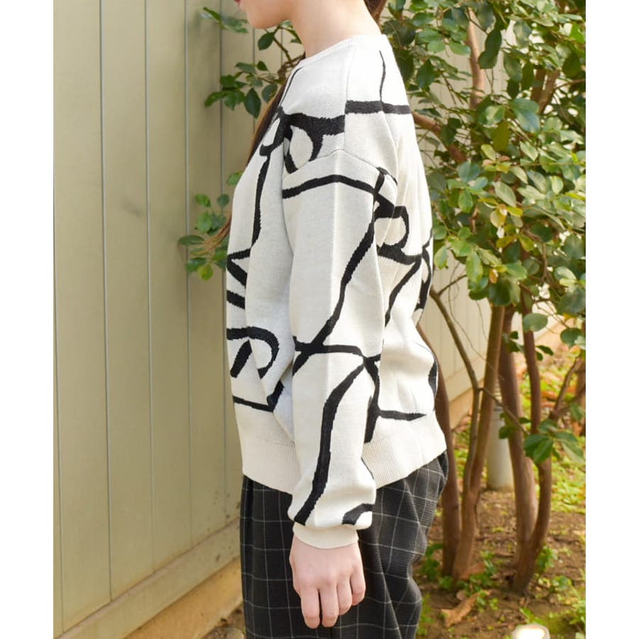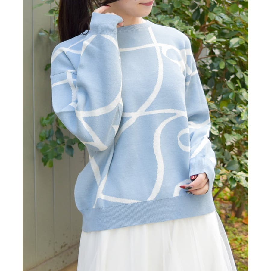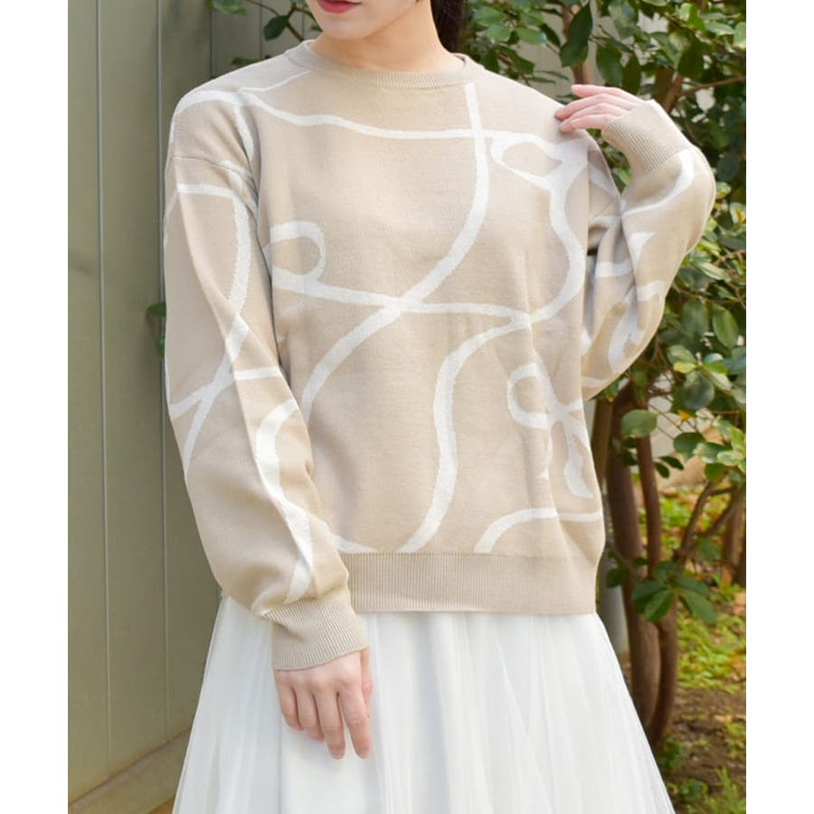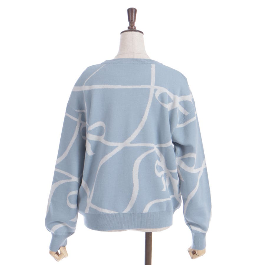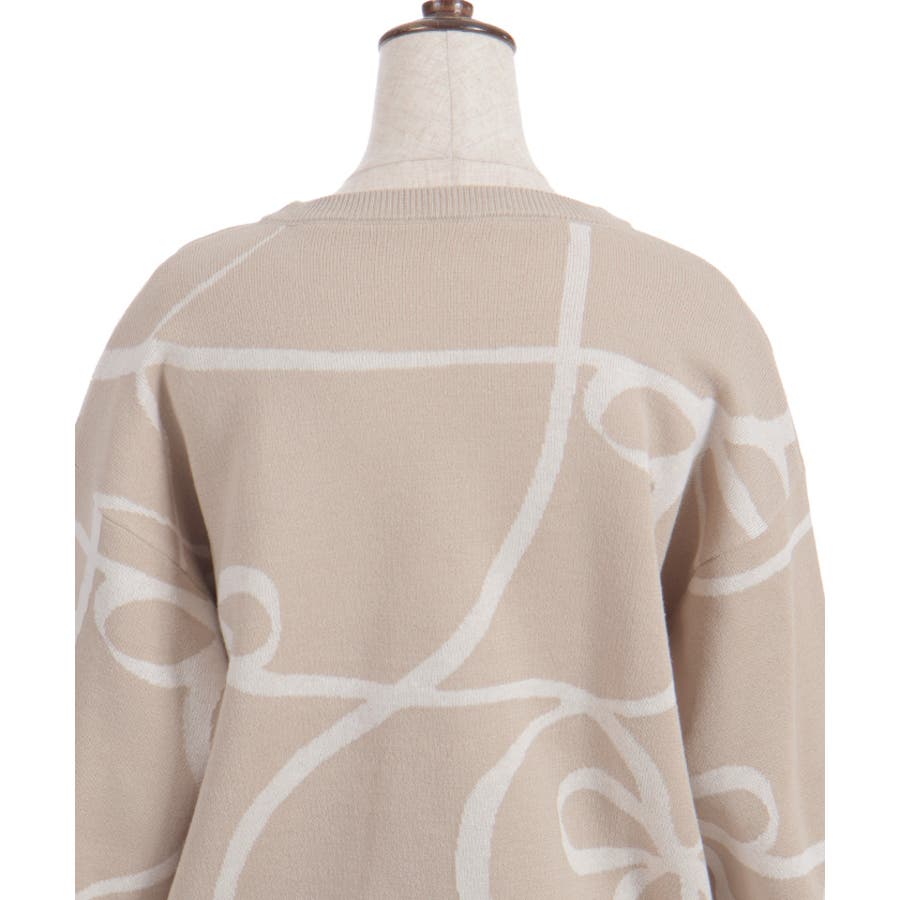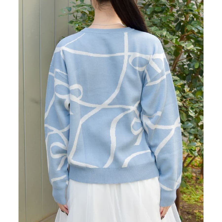 フロントと袖にあしらわれたリボン柄が印象的で、視線を集めるアクセントに。柔らかく薄手のニット素材を使用しており、軽やかで快適な着心地が特徴です。季節の変わり目にも対応できる程よい厚みで、幅広いスタイリングに活躍します。ゆったりとしたシルエットがリラックス感を与えつつ、デイリーコーデに取り入れやすいデザインです。