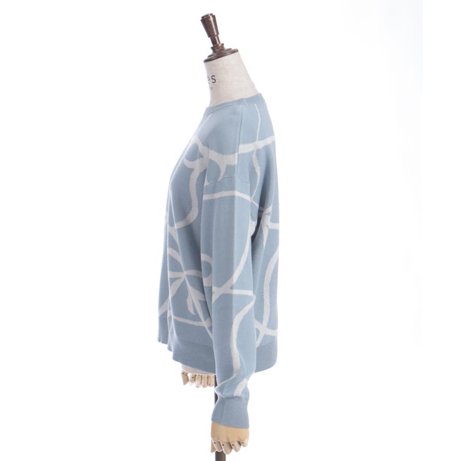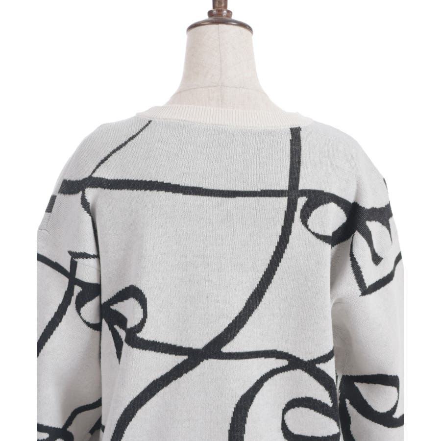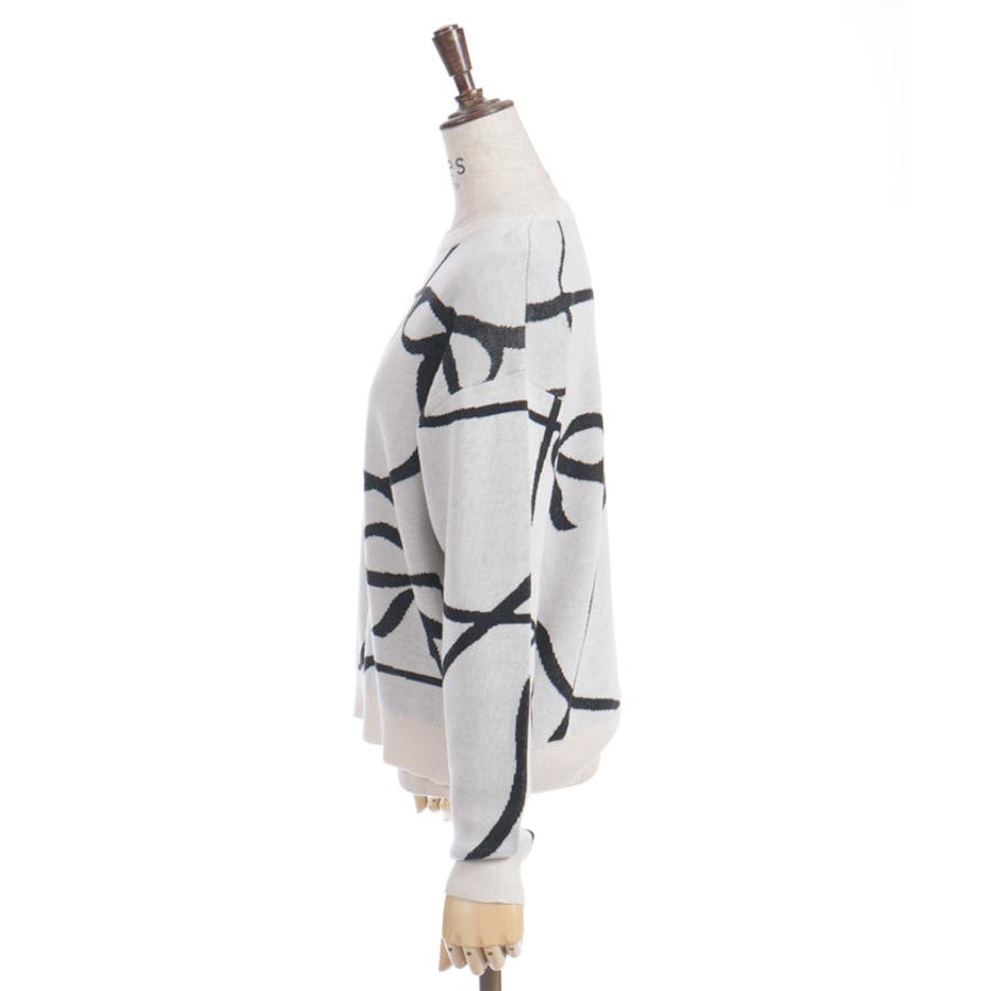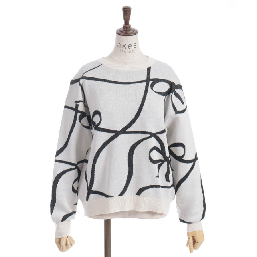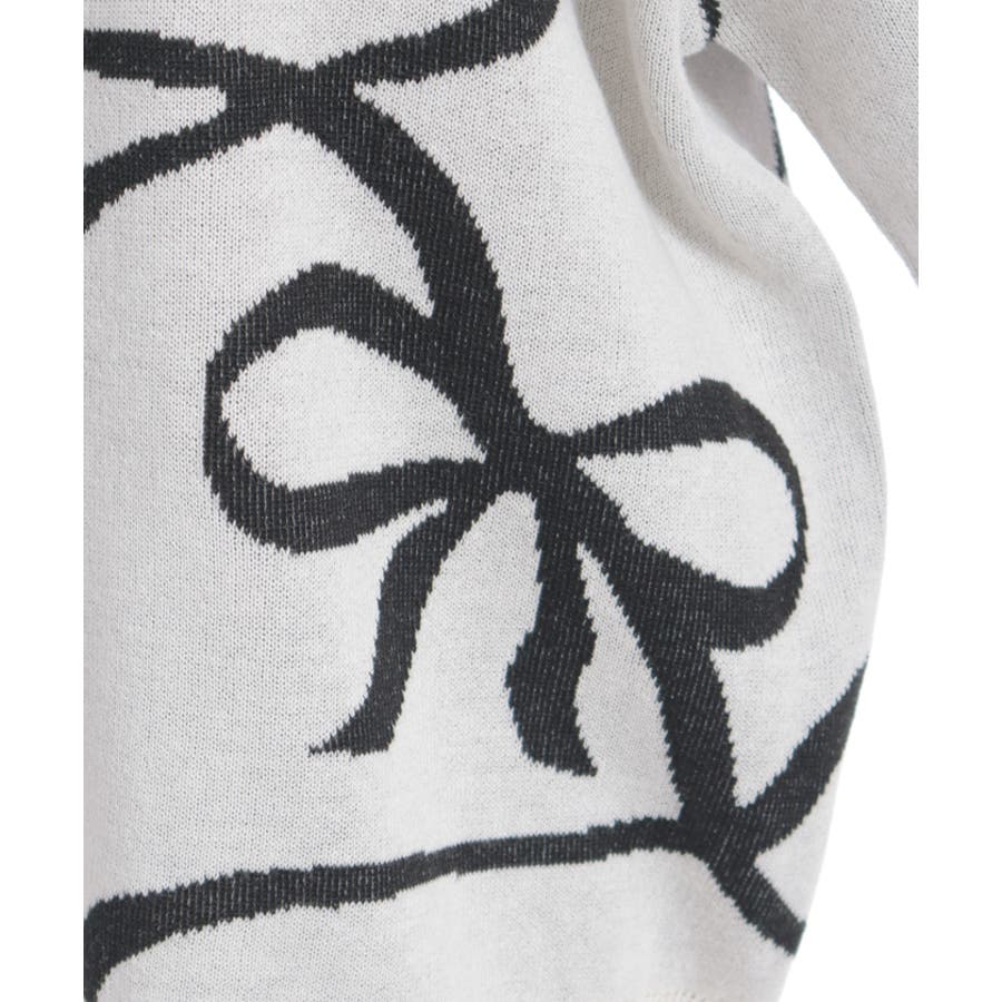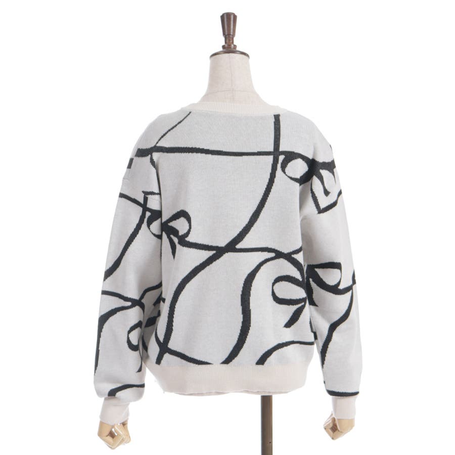 大胆なリボン柄が特徴的なニットプルオーバーです。シンプルなシルエットに遊び心のあるデザインをプラスし、コーディネートの主役として活躍します。軽やかな素材感で、春まで長く使える便利な一枚です。